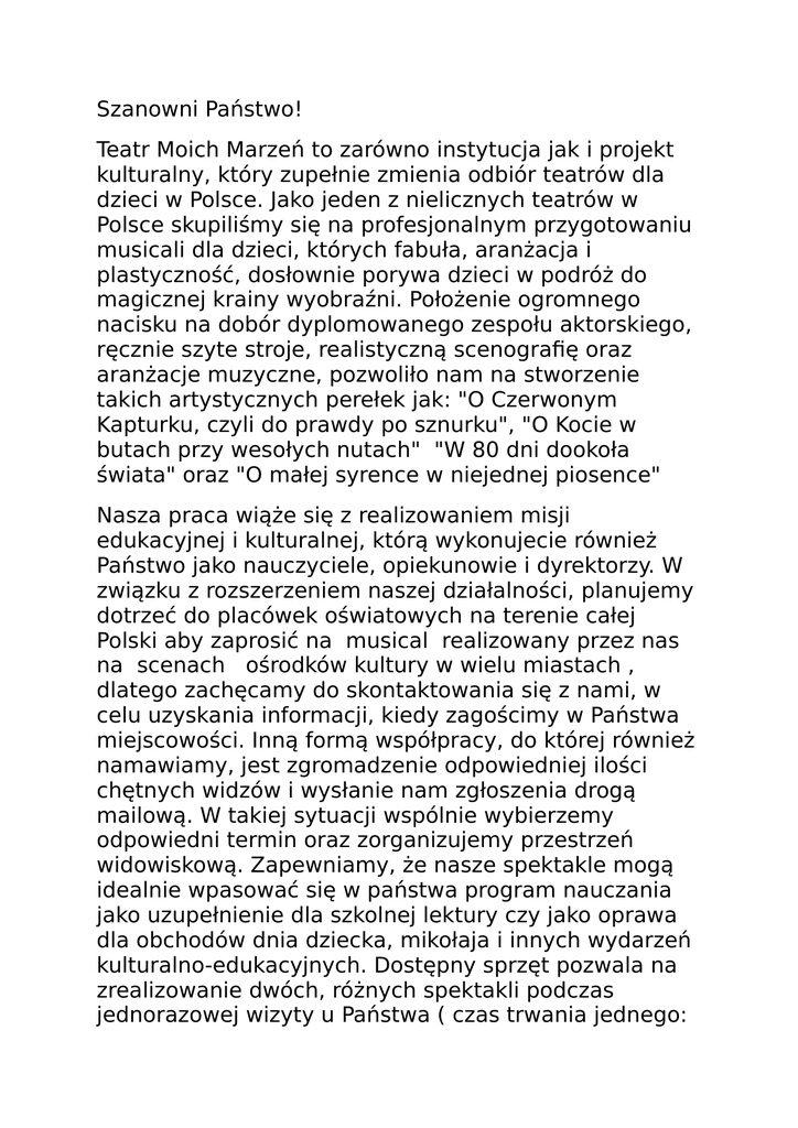 Szanowni Państwo! Teatr Moich Marzeń to zarówno instytucja jak i projekt kulturalny, który zupełnie zmienia odbiór teatrów dla dzieci w Polsce. Jako jeden z nielicznych teatrów w Polsce skupiliśmy się na profesjonalnym przygotowaniu musicali dla dzieci, których fabuła, aranżacja i plastyczność, dosłownie porywa dzieci w podróż do magicznej krainy wyobraźni. Położenie ogromnego nacisku na dobór dyplomowanego zespołu aktorskiego, ręcznie szyte stroje, realistyczną scenografię oraz aranżacje muzyczne, pozwoliło nam na stworzenie takich artystycznych perełek jak: "O Czerwonym Kapturku, czyli do prawdy po sznurku", "O Kocie w butach przy wesołych nutach" "W 80 dni dookoła świata" oraz "O małej syrence w niejednej piosence" Nasza praca wiąże się z realizowaniem misji edukacyjnej i kulturalnej, którą wykonujecie również Państwo jako nauczyciele, opiekunowie i dyrektorzy. W związku z rozszerzeniem naszej działalności, planujemy dotrzeć do placówek oświatowych na terenie całej Polski aby zaprosić na musical realizowany przez nas na scenach ośrodków kultury w wielu miastach , dlatego zachęcamy do skontaktowania się z nami, w celu uzyskania informacji, kiedy zagościmy w Państwa miejscowości. Inną formą współpracy, do której również namawiamy, jest zgromadzenie odpowiedniej ilości chętnych widzów i wysłanie nam zgłoszenia drogą mailową. W takiej sytuacji wspólnie wybierzemy odpowiedni termin oraz zorganizujemy przestrzeń widowiskową. Zapewniamy, że nasze spektakle mogą idealnie wpasować się w państwa program nauczania jako uzupełnienie dla szkolnej lektury czy jako oprawa dla obchodów dnia dziecka, mikołaja i innych wydarzeń kulturalno-edukacyjnych. Dostępny sprzęt pozwala na zrealizowanie dwóch, różnych spektakli podczas jednorazowej wizyty u Państwa ( czas trwania jednego: ok. 60 minut). W zależności od zainteresowania ze strony publiczności jesteśmy w stanie wystawić trzy musicale jednego dnia. Po każdym występie jest możliwość przeprowadzenia interaktywnych, półgodzinnych warsztatów teatralnych dla wszystkich widzów. Wierząc w Państwa wrażliwość na to co piękne i bezcenne, oraz mając nadzieję, że rozbudziliśmy Państwa ciekawość, zachęcamy do spotkania, na którym z przyjemnością odpowiemy na wszystkie pytania. Można się z nami kontaktować pod poniższymi numerami telefonu: biuro obsługi widza : 600-064-925 / 604-21-66- 51 [email protected] [email protected] www.teatrmoichmarzen.pl Z poważaniem: Zespół Teatru Moich Marzeń.