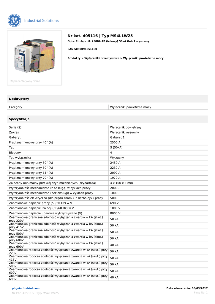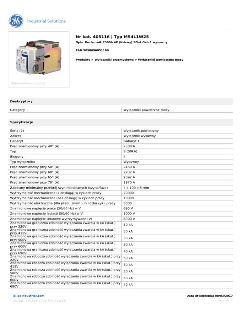 Nr kat. 405116 | Typ MS4L1W25 Opis: Rozłącznik 2500A 4P (N-lewy) 50kA Gab.1 wysuwny EAN 5050096051160 Produkty > Wyłączniki przemysłowe > Wyłączniki powietrzne mocy Reprezentatywny obraz Deskryptory Category Wyłączniki powietrzne mocy Specyfikacje Seria (2) Wyłącznik powietrzny Zakres Wyłącznik wysuwny Gabaryt Gabaryt 1 Prąd znamionowy przy 40° (A) 2500 A Typ S (50kA) Bieguny 4 Typ wyłącznika Wysuwny Prąd znamionowy przy 50° (A) 2450 A Prąd znamionowy przy 60° (A) 2232 A Prąd znamionowy przy 65° (A) 2092 A Prąd znamionowy przy 70° (A) 1970 A Zalecany minimalny przekrój szyn miedzianych (szyna/faza) 4 x 100 x 5 mm Wytrzymałość mechaniczna (z obsługą) w cyklach pracy 20000 Wytrzymałość mechaniczna (bez obsługi) w cyklach pracy 10000 Wytrzymałość elektryczna (dla prądu znam.) In liczba cykli pracy 5000 Znamionowe napięcie pracy (50/60 Hz) w V 690 V Znamionowe napięcie izolacji (50/60 Hz) w V 1000 V Znamionowe Znamionowa przy 220V Znamionowa przy 415V Znamionowa przy 500V Znamionowa przy 600V Znamionowa przy 690V Znamionowa 220V Znamionowa 415V Znamionowa 500V Znamionowa 600V Znamionowa 690V 8000 V napięcie udarowe wytrzymywane (V) graniczna zdolność wyłączania zwarcia w kA (skut.) graniczna zdolność wyłączania zwarcia w kA (skut.) graniczna zdolność wyłączania zwarcia w kA (skut.) graniczna zdolność wyłączania zwarcia w kA (skut.) graniczna zdolność wyłączania zwarcia w kA (skut.) robocza zdolność wyłączania zwarcia w kA (skut.) przy robocza zdolność wyłączania zwarcia w kA (skut.) przy robocza zdolność wyłączania zwarcia w kA (skut.) przy robocza zdolność wyłączania zwarcia w kA (skut.) przy robocza zdolność wyłączania zwarcia w kA (skut.) przy pl.geindustrial.com Nr kat. 405116 | Typ MS4L1W25 50 kA 50 kA 50 kA 50 kA 40 kA 50 kA 50 kA 50 kA 50 kA 40 kA Data utworzenia: 08/03/2017 Page No. 1 Specyfikacje Prąd znamionowy krótkotrwały wytrzymywany 1s w kA (skut.) 50 kA Prąd znamionowy krótkotrwały wytrzymywany 3s w kA (skut.) Znamionowa zwarciowa zdolność załączania w kA (szczyt.) przy 415V Znamionowa zwarciowa zdolność załączania w kA (szczyt.) przy 500V Znamionowa zwarciowa zdolność załączania w kA (szczyt.) przy 600V Znamionowa zwarciowa zdolność załączania w kA (szczyt.) przy 690V Rozproszenie mocy (W) 40 kA Opak. 1 143 kA 143 kA 143 kA 84 kA 765 W Klasyfikacje ETIM 5.0 EC000228 ETIM 6.0 EC000228 Wymiary Ciężar pl.geindustrial.com Nr kat. 405116 | Typ MS4L1W25 55.000 kg Data utworzenia: 08/03/2017 Page No. 2 Publikacje Tytuł Numer publikacji Rodzaj publikacji Mpact F1W Commercial Drawings MPW41F Commercial Drawings MPW41T Commercial Drawings Mpw4125r Commercial Drawings MPW41L Commercial Drawings MPW41R Commercial Drawings Mpact F1W Mpact F1 withdrawable front view MPW41F MP F1 4pole withdrawable Front view MPW41T MP F1 4pole withdrawable total view Mpw4125r MP F1 4pole withdrawable 2500A rear view MPW41L MP F1 4pole withdrawable side view MPW41R MP F1 4pole withdrawable rear view Dodatkowe Dokumenty: Odwiedź naszą bibliotekę aby znaleźć dokumenty techniczne, specyfikacje, katalogi produktów, rysunki 3D oraz materiały promocyjne… pl.geindustrial.com Nr kat. 405116 | Typ MS4L1W25 Data utworzenia: 08/03/2017 Page No. 3