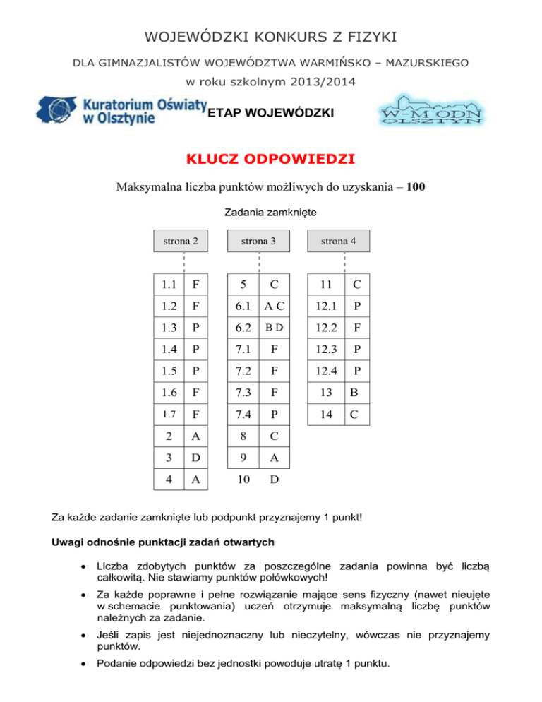 WOJEWÓDZKI KONKURS Z FIZYKI DLA GIMNAZJALISTÓW WOJEWÓDZTWA WARMIŃSKO – MAZURSKIEGO w roku szkolnym 2013/2014 ETAP WOJEWÓDZKI KLUCZ ODPOWIEDZI Maksymalna liczba punktów możliwych do uzyskania – 100 Zadania zamknięte strona 2 strona 3 strona 4 1.1 F 5 11 C 1.2 F 6.1 A C 12.1 P 1.3 P 6.2 BD 12.2 F 1.4 P 7.1 F 12.3 P 1.5 P 7.2 F 12.4 P 1.6 F 7.3 F 13 B 1.7 F 7.4 P 14 C 2 A 8 C 3 D 9 A 4 A 10 D C Za każde zadanie zamknięte lub podpunkt przyznajemy 1 punkt! Uwagi odnośnie punktacji zadań otwartych Liczba zdobytych punktów za poszczególne zadania powinna być liczbą całkowitą. Nie stawiamy punktów połówkowych! Za każde poprawne i pełne rozwiązanie mające sens fizyczny (nawet nieujęte w schemacie punktowania) uczeń otrzymuje maksymalną liczbę punktów należnych za zadanie. Jeśli zapis jest niejednoznaczny lub nieczytelny, wówczas nie przyznajemy punktów. Podanie odpowiedzi bez jednostki powoduje utratę 1 punktu. Nr zadania Punktowane czynności 15.1 15.2 15 15.3 15.4 27 °C Obliczenie ciepła właściwego ołowiu cw = Q / m · t cw = 133,3 J / kg C 600 K Obliczenie ciepła topnienia ołowiu Q = m · qto qto = Q / m qto = 25 000 J / kg Obliczenie, ile razy ciepło topnienia lodu jest większe od ciepła topnienia ołowiu qt / qto = 13,6 razy Razem punktów Propozycja punktacji zadań otwartych pkt. 1 2 1 7 2 1 Zauważenie, że 16 v1 = x / t1 = x / 120 s; v2 =x / t2 = x / 360 s; v3 = x / t3 x – długość schodów t3 = x / v 3 1 v3 = v1 + v2 = x / 120 s + x / 360 s = 4 x / 360 s 1 t3 = x / (v1 + v2) = x / (4 x / 360 s) 1 Pasażer wchodzi po czynnych ruchomych schodach w czasie t = 90 s = 1,5 min. Obliczenie mocy włączonych urządzeń P = 1 650 W 17 17.1 17.2 18 19 20 21 1 5 1 1 Obliczenie energii w kWh E = 1,65 kW · 2,5 h = 4,125 kWh 2 Obliczenie energii w MJ E = 4,125 · 3,6 = 14,85 MJ 2 Obliczenie liczby obrotów wykonanych przez tarczę - 495 Obliczenie ładunków znajdujących się na czterech kulkach: q1 = + 5 C, q2 = - 15 C, q3 = + 10 C, q4 = + 10 C Obliczenie ładunków znajdujących się na trzech kulkach 2 Obliczenie ładunków znajdujących się na dwóch kulkach 2 Obliczenie ładunku znajdującego się na jednej kulce 1 Obliczenie masy kamienia m = 175 kg 1 Obliczenie ciężaru kamienia Q = 1750 N 1 Obliczenie siły wyporu Fwyp = 500 N Obliczenie siły wypadkowej działającej na kamień Fw =1 250 N Obliczenie pracy W = 6 250 J 1 Obliczenie W = U · q W = 3 1010 J 1 Zauważenie, że Q = W 1 Obliczenie m = W / Q = U · q / ct 2 Obliczenie masy m = 88 235 kg 1 Obliczenie ilości ciepła Q = mw · c · t = 21 000J 1 Zauważenie, że Q = Ep 1 Obliczenie masy m= Q / g · h m = 420 kg 1 7 5 3 5 5 1 1 5 3 22 23 Obliczenie długości fali: = 1,6 m 2 = 3,2 m 1 Obliczenie częstotliwości f = v / = 1,5 Hz 1 Obliczenie okresu drgań fali: T = 1 / f = 0,66 s Obliczenie siły naciągu: I nitki F1 = m1 · g = 20N 1 1 II nitki F2 = m2 · g + F1 = 50N + 20 N = 70N 1 2 24 III nitki F3 = m3 · g + F = 3kg.10m/s + 70N= 100N 1 24.1 24.2 Obliczenie masy m = 2 kg 2 24.3 Obliczenie czasu t = v / g t = 0,3 s 24.4 Obliczenie w połowie drogi spadania Ek = Ep = m · g · h Ek = 4,5 J Podanie wartości Ek = 4 J Obliczenie Ep = Ec – Ek Ep = 5 J Obliczenie częstotliwości drgań pierwszego wahadła 24.5 Obliczenie Ep f1= 25 26 h=0,45 m = 1 Hz 2 10 2 2 1 3 Obliczenie częstotliwości drgań drugiego wahadła f2= 1/2 Hz 1 Obliczenie: f1 / f2= 2 1 Obliczenie ciepła Q = m · c · t = 23 100 J 1 Zauważenie, że W = Q 1 W=U·I·t 1 R=U/I 1 Wyznaczenie oporu R = U2 · t / Q 1 Obliczenie wartości oporu R = 137,4 1 Obliczenie ciężaru jajka Q = 0,8 N 1 28.1 28.2 Ruch jednostajny 1 28.3 Ruch jednostajnie opóźniony 1 28.4 Ruch niejednostajnie przyśpieszony 1 Za oznaczenie prawidłowo osi wykresu v(t) 1 Za każdy prawidłowo sporządzony wykres po 1 punkcie 3 28.5 3 2 Zauważenie, że siła ciężkości i siła wyporu są sobie równe Q = Fw Przedstawienie na rysunku siły ciężkości i siły wyporu zachowując skalę Ruch jednostajnie przyśpieszony 27 28 Ep = Ek h = Ek / m · g 3 1 6 3 1 1 8