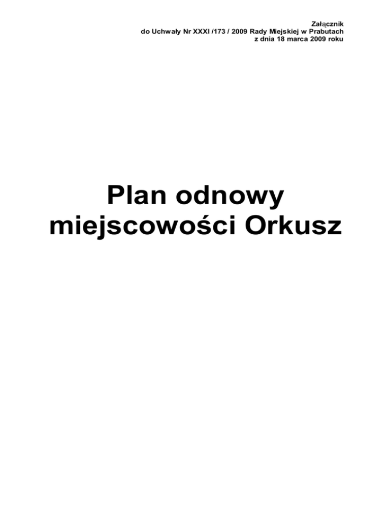 Załącznik do Uchwały Nr XXXI /173 / 2009 Rady Miejskiej w Prabutach z dnia 18 marca 2009 roku Plan odnowy miejscowości Orkusz PołoŜenie Orkusz leŜy w obrębie Sołectwa Sypanica przy gminnej drodze PrabutyLaskowice. Jest miejscowością o charakterze rolniczo - turystycznym. W granicach Orkusza, znajduje się zabytkowy dworek w trakcie remontu, gospodarstwa rolne, domki letniskowe prywatne sezonowe i całoroczne, Ośrodek Integracji Dzieci i MłodzieŜy ZHP Kwidzyn całoroczny, pełniący jednocześnie w okresie letnim bazę wypoczynkową dla harcerzy i dzieci z domów dziecka i placówek opiekuńczych z terenu całej Polski. Ośrodek jest połoŜony w centrum wsi na obszarze 4 ha gruntów leśnych. W Orkuszu znajduje się ogólnodostępne kąpielisko z plaŜą usytuowana nad jeziorem Orkusz, będącą w administracji ZHP Hufiec Kwidzyn. Ośrodek od wielu lat z uwagi na swoją rozbudowaną infrastrukturę, pełni teŜ funkcję spotkań społeczności lokalnej, jak równieŜ zaplecze sportowe. Jest wykorzystane przez mieszkańców Orkusza i sąsiednich wsi Sypania, Laskowice. Infrastruktura Ośrodka Teren zabudowany domkami campingowymi –w ilości 65 domków, 2 stołówki + kuchnia z wyposaŜeniem dla 250 osób, Świetlica murowana, Budynek szkoleniowo –noclegowy, Sanitariaty typu WC, Prysznice , Amfiteatr, Kompleks boisk, Kąpielisko, Przystań na sprzęt wodny -kajaki, Uzbrojenie terenu: -woda zasilanie z sieci wodociągowej gminnej, sieć wodna obejmuje cały ośrodek bez doprowadzenia ujęć do domków mieszkalnych -kanalizacja -sieć obejmuje połączenie z szambem miedzy obiektami kuchni, budynku a sanitariatami, brak kanalizacyjnej na pozostałym terenie -instalacja elektryczna doprowadzona do kaŜdego domku i pozostałych obiektów, teren oświetlony. Rys historyczny Pierwsza wzmianka o Orkuszu pochodzi z 1238, kiedy to Dietrich von Tiefenau otrzymał od KrzyŜaków 22 włóki ziemi nad Jeziorem Orkusz, gdzie załoŜył osadę Orkusz. W 1299 roku sołtysem w osadzie był Jan z Gołot. Pod koniec XIII wieku osada przeszła w posiadanie Dietricha Stange. W roku 1366 Orkusz był wsią na prawie chełmińskim. W roku 1565 ksiąŜę Albrecht Hohenzollern zezwolił Franciszkowi von Silslau, staroście prabuckiemu, na nabycie Orkusza (Workusza). W latach 1592 - 1614 właścicielem Orkusza był Franz Schortz.. W XIX wieku Orkusz był folwarkiem naleŜącym do Szramowa. W 1868 roku było w nim 28 budynków i 79 mieszkańców w 12 gospodarstwach domowych. Większość z nich, bo 72 była katolikami naleŜącymi do parafii w Krasnołęce (dawn. niem. Schönwiese), ewangelicy zaś w ilości 7 osób naleŜeli do parafii w Prabutach. Zabudowa pochodząca z około 1910 r. uległa zniszczeniu podczas II wojny światowej. Po wojnie Osada Orkusz nie odbudowywała się. Obecnie wieś naleŜy do sołectwa Sypanica. W Orkuszu znajduje się ośrodek wypoczynkowy Związku Harcerstwa Polskiego, strzelnica imienia Józefa Korczyca. Odbudowywany jest równieŜ zabytkowy pałac z 1910 r. połoŜony nad jeziorem. We wsi istnieje wiele prywatnych domków letniskowych (całorocznych i sezonowych). 2.Inwentaryzacja zasobów słuŜących odnowie miejscowości. Z uwagi na szczególny charakter Orkusza, jako miejscowości wypoczynkowej modernizacja obiektów z uwagi na ich długoletnią eksploatację jest niezbędna. Prace modernizacyjne pozwolą na podniesienie walorów turystycznych. Modernizacja ma na celu równieŜ dostosować obiekt na potrzeby społeczności lokalnej, wyodrębnienie pomieszczeń dla lokalnego klubu sportów wodnych i harcerskiej druŜyny środowiskowej rekrutujących się głównie młodzieŜy sołectwa Sypania i Laskowice. Plan odnowy wsi Orkusz obejmować będzie modernizację następujących obiektów: 1. Budynek szkoleniowo - noclegowy z pomieszczeniami na prowadzenie zajęć pozalekcyjnych w zakresie sportów wodnych dla dzieci i młodzieŜy i druŜyny środowiskowej sołectwa i sąsiadujących wsi Gminy i Miasta Prabuty, 2. PlaŜa i kąpielisko, mające charakter otwarty dla mieszkańców i turystów, 3. Amfiteatr, słuŜący do przeprowadzenia zajęć integracyjnych i rekreacyjno - kulturalnych, 4. Parking na potrzeby turystów usytuowany w obrębie kąpieliska, 5. Budowa ścieŜki dydaktyczno - rekreacyjnej w obrębie jeziora Orkusz. 1. Analiza SWOT (Orkusz). Silne strony: 1. atrakcyjne tereny rekreacyjne połoŜenie w okolicy jeziora, 2. brak w pobliŜu jeziora przemysłu degradującego środowisko, 3. miejscowość połoŜona w otulinie lasu, 4. zaplecze rekreacyjno – wypoczynkowego, baza noclegowa, 5. czyste jezioro umoŜliwiające prowadzenie zajęcia sportowo-rekreacyjne z zakresu Ŝeglarstwa, kajakarstwa, nauki pływania, 6. odpowiednie zaplecze do prowadzenia szkoleń z zakresu edukacji ekologicznej. Słabe strony: 1 Słabo rozwinięta infrastruktura techniczna – zły stan techniczny parkingu, Brak chodnika prowadzącego nad jezioro; 2. słabo rozwinięte usługi gastronomiczne; 4. brak kanalizacji; 5. brak gazyfikacji; Szanse: 1. rosnąca aktywność turystyczna oraz wzrost zainteresowania aktywnym wypoczynkiem i turystyką, 2. rosnące zapotrzebowanie na zajęcia pozalekcyjne, 3. aktywizacja środowiska głównie młodzieŜy, 4. miejsca pracy dla ludności miejscowej, ZagroŜenia: 1. wolno powstająca na wsi w stosunku do miast infrastruktura Techniczna, 2. duŜa ilość wnioskujących o środki europejskie na rozwój społeczny i ekonomiczny, 3. wysokie bezrobocie zwłaszcza na obszarach wiejskich, 4. niskie kwalifikacje osób bezrobotnych, szczególnie z terenów wiejskich, 5. duŜe problemy ze zmianą mentalności osób bezrobotnych z terenów wiejskich, 4.Cel i opis przedsięwzięcia Orkusz to atrakcyjny teren sprzyjający róŜnym formom turystyki i rekreacji, szczególnie turystyki aktywnej i specjalistycznej jak Ŝeglarstwo, kajakarstwo. Atrakcyjnie połoŜone jeziora, kompleksy leśne, bogata przyroda, walory historyczne, istniejąca baza noclegowa z z