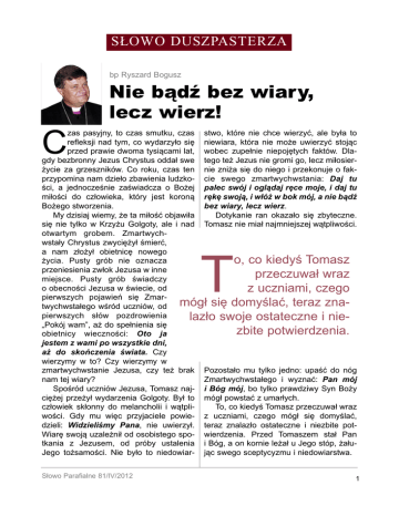 SŁOWO DUSZPASTERZA Nie bądź bez wiary, lecz wierz! bp Ryszard Bogusz C zas pasyjny, to czas smutku, czas stwo, które nie chce wierzyć, ale była to refleksji nad tym, co wydarzyło się niewiara, która nie może uwierzyć stojąc przed prawie dwoma tysiącami lat, wobec zupełnie niepojętych faktów. Dlagdy bezbronny Jezus Chrystus oddał swe tego też Jezus nie gromi go, lecz miłosierżycie za grzeszników. Co roku, czas ten nie zniża się do niego i przekonuje o fakprzypomina nam dzieło zbawienia ludzko- cie swego zmartwychwstania: Daj tu ści, a jednocześnie zaświadcza o Bożej palec swój i oglądaj ręce moje, i daj tu miłości do człowieka, który jest koroną rękę swoją, i włóż w bok mój, a nie bądź Bożego stworzenia. bez wiary, lecz wierz. My dzisiaj wiemy, że ta miłość objawiła Dotykanie ran okazało się zbyteczne. się nie tylko w Krzyżu Golgoty, ale i nad Tomasz nie miał najmniejszej wątpliwości. otwartym grobem. Zmartwychwstały Chrystus zwyciężył śmierć, a nam złożył obietnicę nowego życia. Pusty grób nie oznacza o, co kiedyś Tomasz przeniesienia zwłok Jezusa w inne przeczuwał wraz miejsce. Pusty grób świadczy o obecności Jezusa w świecie, od z uczniami, czego pierwszych pojawień się Zmarmógł się domyślać, teraz znatwychwstałego wśród uczniów, od pierwszych słów pozdrowienia lazło swoje ostateczne i nie„Pokój wam”, aż do spełnienia się zbite potwierdzenia. obietnicy wieczności: Oto ja jestem z wami po wszystkie dni, aż do skończenia świata. Czy wierzymy w to? Czy wierzymy w zmartwychwstanie Jezusa, czy też brak Pozostało mu tylko jedno: upaść do nóg nam tej wiary? Zmartwychwstałego i wyznać: Pan mój Spośród uczniów Jezusa, Tomasz naj- i Bóg mój, bo tylko prawdziwy Syn Boży ciężej przeżył wydarzenia Golgoty. Był to mógł powstać z umarłych. człowiek skłonny do melancholii i wątpliTo, co kiedyś Tomasz przeczuwał wraz wości. Gdy mu więc przyjaciele powie- z uczniami, czego mógł się domyślać, dzieli: Widzieliśmy Pana, nie uwierzył. teraz znalazło ostateczne i niezbite potWiarę swoją uzależnił od osobistego spo- wierdzenia. Przed Tomaszem stał Pan tkania z Jezusem, od próby ustalenia i Bóg, a on kornie leżał u Jego stóp, żałuJego tożsamości. Nie było to niedowiar- jąc swego sceptycyzmu i niedowiarstwa. T Słowo Parafialne 81/IV/2012 1 Wielkanoc 2012 Ilu takich Tomaszów spotykamy dziś wokół siebie, a może sami do nich należymy? Argumenty rozumu są najczęstszą przeszkodą dla naszej wiary. Jezus jednak nie żąda od nas ofiary rozumu. On żąda tylko szczerego pragnienia poznania, tęsknoty za wiarą i zbawieniem, szczerych w tym względzie chęci. A jeśli to znajduje, przychodzi wówczas z pomocą, tak jak przyszedł do Tomasza. Nie bądź bez wiary, lecz wierz! Te słowa kieruje Chrystus do ciebie i do mnie, kiedy stajemy na progu Wielkanocy. Golgota nie zamknęła drzwi do wieczności, wręcz przeciwnie, drzwi te szeroko otwarła. Po dniu Golgoty uczniowie byli Z TO M A S Z Leon Krzemieniecki dradziłeś, nie ufając. Jedynie dotyk ran, według twojego sumienia, miał odkryć prawdę. W Jerozolimie i nad długim Jordanem, w Syrii i Galilei wieść rozbiegła się lotem. Apostołowie, twoi wszak przyjaciele, niezdolni byli kłamać. Radowali się otwarcie. Dowodem szczerość na twarzach. Pan powstał z grobu. Zmartwychwstał! Nie wierzysz... Nie będzie pięciu ran, nie ma zmartwychwstania. Podążam za wyobraźnią tej swoistej zapamiętałości, wpatrzony w opis Jana (20,24-29), sięgając po tekst Marka (16,11-14). Stałeś się trwałym symbolem. Porzekadłem. „Niewierny Tomasz“ pozostał w pamięci, nazwą w potocznym języku. Zastanawiająca postawa. Słuchałeś nauk i byłeś świadkiem cudów. Rozmnożenie chleba dla pięciu tysięcy, przywra2 zrozpaczeni. Wszystkie nadzieje łączone z ich Mistrzem runęły w gruzy. Wszelkie oczekiwania Królestwa Bożego zostały rozwiane. Ale, oto w poranek wielkanocny zaczyna się nowy dzień dla świata. Chrystus żyje! Dzięki tej wieści uczniowie otrząsnęli się z duchowego odrętwienia. Z tą ewangelią poszli na podbój świata, a zwiastowanie o Zmartwychwstałym Jezusie Chrystusie stało się centralnym punktem ich poselstwa. Niech tegoroczne święta Wielkiej Nocy wzbudzą w nas głęboką wiarę i przekonanie, że Jezus żyje. Jest naszym Panem i Bogiem. bp Ryszard Bogusz canie normalności ułomnym, odzyskanie wzroku przez niewidomych, wskrzeszenie Łazarza. Nie rozumiejący. Albo gorzej, nie chcący rozumieć. Chrystus, wybierając ciebie do dwunastu wiedział, że tak uczynisz. Znał wiarołomstwo, jak zdradę Judasza. Osądzam, wybacz. Łatwy byłeś do odstępstwa. Nietrwały, niestały. Patrzę na ciebie, jako obecny. Widzę wielu tobie podobnych. Wątpiący jak ty odeszli, odchodzą. Nie dane im dotknięcie pięciu ran. Tobie Pan pozwolił. Sprawdziłeś. Pozostał żal nieufności. Przez resztę życia pozostał. Prawo psychologii i natury. Takich zdarzeń, osobistych, nie zapomina się. Podświadomość czuwa, przywraca nieetyczne obrazy. Bardziej żałobnie. Wróg osobowości pod własną suknią. Rana znika, blizna nie. Na pewno... Ludzie tamtego czasu są podobni do dzisiejszych. Niemal identyczni. Kalecy w sumieniach. Zobaczyłeś, dotknąłeś. Aby na zawsze być symbolem. Niewiernego Tomasza. Leon Krzemieniecki Słowo Parafialne 81/IV/2012 Refleksje Martwa natura Agnieszka Ściepuro Srebrzysty, kuchenny pancernik, pod wpływem ciepła, pomrukuje łagodnie w stronę okna. Okno – otwarte na oścież, przyjaźnie zaprasza do środka. Falując rytmicznie firankami zachęca aniołka szklanego do tańca, który brutalnie zawieszony na nitce kołysze się leniwie. Rozpromienione jaskry Spragnione światła, wiercą się bezustannie, wścibsko wychylają główki, zatapiając w miniaturce krajobrazu zamkniętego w okiennej ramie. Czy za oknem, ktoś przypiął do linki o