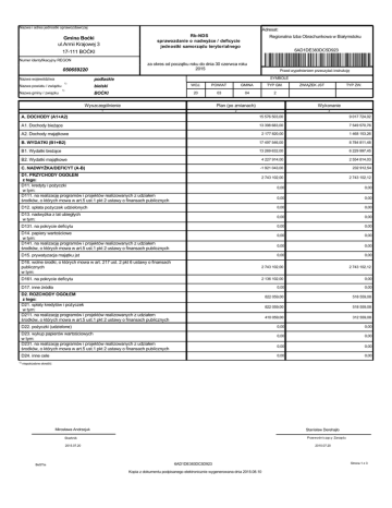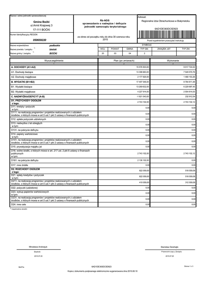 Nazwa i adres jednostki sprawozdawczej Gmina Boćki ul.Armii Krajowej 3 17-111 BOĆKI Numer identyfikacyjny REGON 050659220 Nazwa województwa Nazwa powiatu / związku Nazwa gminy / związku podlaskie WOJ. BOĆKI 1) 20 POWIAT Wyszczególnienie A. DOCHODY (A1+A2) Regionalna Izba Obrachunkowa w Białymstoku 6AD1DE383DC5D923 za okres od początku roku do dnia 30 czerwca roku 2015 bielski 1) Adresat: Rb-NDS sprawozdanie o nadwyżce / deficycie jednostki samorządu terytorialnego Przed wypełnieniem przeczytać instrukcję SYMBOLE GMINA 03 TYP GM. 04 2 Plan (po zmianach) 1 2 A1. Dochody bieżące A2. Dochody majątkowe TYP ZW. Wykonanie 15 576 503,00 3 9 017 724,02 13 398 683,00 7 549 570,76 B. WYDATKI (B1+B2) 2 177 820,00 1 468 153,26 17 497 546,00 8 784 811,48 B2. Wydatki majątkowe 13 269 632,00 6 229 997,45 4 227 914,00 2 554 814,03 -1 921 043,00 232 912,54 2 743 102,00 2 743 102,12 0,00 0,00 0,00 0,00 0,00 0,00 0,00 0,00 0,00 0,00 0,00 0,00 0,00 0,00 0,00 0,00 2 743 102,00 2 743 102,12 2 136 102,00 0,00 0,00 0,00 822 059,00 518 559,08 822 059,00 518 559,08 410 059,00 312 559,08 0,00 0,00 0,00 0,00 0,00 0,00 0,00 0,00 B1. Wydatki bieżące C. NADWYŻKA/DEFICYT (A-B) D1. PRZYCHODY OGÓŁEM z tego: D11. kredyty i pożyczki w tym: D111. na realizację programów i projektów realizowanych z udziałem środków, o których mowa w art.5 ust.1 pkt 2 ustawy o finansach publicznych D12. spłata pożyczek udzielonych D13. nadwyżka z lat ubiegłych w tym: D131. na pokrycie deficytu D14. papiery wartościowe w tym: D141. na realizację programów i projektów realizowanych z udziałem środków, o których mowa w art.5 ust.1 pkt 2 ustawy o finansach publicznych D15. prywatyzacja majątku jst D16. wolne środki, o których mowa w art. 217 ust. 2 pkt 6 ustawy o finansach publicznych w tym: D161. na pokrycie deficytu D17. inne źródła D2. ROZCHODY OGÓŁEM z tego: D21. spłaty kredytów i pożyczek w tym: D211. na realizację programów i projektów realizowanych z udziałem środków, o których mowa w art.5 ust.1 pkt 2 ustawy o finansach publicznych D22. pożyczki (udzielone) D23. wykup papierów wartościowych w tym: D231. na realizację programów i projektów realizowanych z udziałem środków, o których mowa w art.5 ust.1 pkt 2 ustawy o finansach publicznych 1) ZWIĄZEK JST D24. inne cele niepotrzebne skreślić Mirosława Andrzejuk Stanisław Derehajło Przewodnic ząc y Zarządu Skarbnik 2015.07.20 BeSTia 2015.07.20 6AD1DE383DC5D923 Kopia z dokumentu podpisanego elektronicznie wygenerowana dnia 2015.08.10 Strona 1 z 3 Dane uzupełniające: E. Finansowanie deficytu, zgodnie z art. 217 ust. 2 ustawy o finansach publicznych Wyszczególnienie Plan (po zmianach) 1 2) 2 4) E. FINANSOWANIE DEFICYTU (E1+E2+E3+E4+E5) z tego: Wykonanie 1 921 043,00 3) 3 0,00 E1. sprzedaż papierów wartościowych wyemitowanych przez jednostkę samorządu terytorialnego 0,00 0,00 E2. kredyty i pożyczki 0,00 0,00 E3. prywatyzacja majątku jednostki samorządu terytorialnego 0,00 0,00 E4. nadwyżka budżetu jednostki samorządu terytorialnego z lat ubiegłych 0,00 0,00 1 921 043,00 0,00 E5. wolne środki jako nadwyżka środków pieniężnych na rachunku bieżącym budżetu jednostki samorządu terytorialnego, wynikających z rozliczeń wyemitowanych papierów wartościowych, kredytów i pożyczek z lat ubiegłych 2) jednostki wypełniają za I, II, III i IV kwartał 4) wypełniają jednostki, w których planowana lub wykonana różnica między dochodami a wydatkami jest ujemna 3) jednostki wypełniają tylko za IV kwartał F. Dane uzupełniające do wyliczenia relacji, o których mowa w art. 242 i 243 ustawy o finansach publicznych Wyszczególnienie Plan (po zmianach) 1 F1. Łączna kwota wyłączeń z relacji, o której mowa w art. 243 ust. 1 ustawy o finansach publicznych w okresie sprawozdawczym w tym: F11. kwota wyłączeń, o których mowa w art. 243 ust. 3 ustawy o finansach publicznych F12. kwota wyłączeń, o których mowa w art. 243 ust. 3a ustawy o finansach publicznych F13. wykup papierów wartościowych, spłata kredytów i pożyczek zaciągniętych na spłatę przejętych zobowiązań samodzielnego publicznego zakładu opieki zdrowotnej F14. wykup obligacji nominowanych w walutach obcych wyemitowanych na zagraniczne rynki przed 1 stycznia 2010 r. F2. Zobowiązania związku współtworzonego przez jednostkę samorządu terytorialnego przypadające do spłaty w roku budżetowym F3. Kwota związana z realizacją wydatków bieżących, o których mowa w art. 242 ustawy o 5) finansach publicznych 3 215 059,00 215 059,08 215 059,00 215 059,08 0,00 0,00 0,00 0,00 0,00 0,00 0,00 0,00 X F4. Kwota wydatków bieżących ponoszonych na spłatę przejętych zobowiązań samodzielnego publicznego zakładu opieki zdrowotnej przekształconego na zasadach określonych w ustawie o działalności leczniczej 5) Wykonanie 2 0,00 0,00 0,00 wypełniają jednostki tylko za IV kwartały Mirosława Andrzejuk Stanisław Derehajło Przewodnic ząc y Zarządu Skarbnik 2015.07.20 BeSTia 2015.07.20 6AD1DE383DC5D923 Kopia z dokumentu podpisanego elektronicznie wygenerowana dnia 2015.08.10 Strona 2 z 3 Wyjaśnienia do sprawozdania Rb-NDS Pozycja E. Plan. Deficyt budżetu, zgodnie z art 217 ust 1 ustawy o finansach publicznych wynosi 1.921.043 zł. Planowany deficyt budżetu, jak wynika z Uchwały budżetowej ( dochody ogółem 15.576.503 zł minus środki z EFR 215.059 zł minus wydatki ogółem 17.497.546 zł) wyniesie 2.136.102 zł, który pokryty zostanie zgodnie z art. 217 ust 2 uofp wolnymi środkami jako nadwyżki środków pieniężnych na rachunku bankowym budżetu. Deficyt taki kreują dochody, które to w kwocie 215.059 zł, pochodzące z Europejskiego Funduszu Rolnego, przeznaczone zostały na spłatę pożyczki na wyprzedzajace finansowanie, zaciągnięte na zadania"Remont (modernizacja) świetlicy wiejskiej w miejscowości Jakubowskie gminie Boćki", "Remont (modernizacja) świetlicy wiejskiej w miejscowości Boćki", "Rem