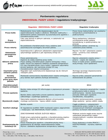 producent zaawansowanej elektroniki przemysłowej Porównanie regulatora INDIVIDUAL FUZZY LOGIC i regulatora tradycyjnego Regulator INDIVIDUAL FUZZY LOGIC Praca kotła Praca wentylatora Praca retorty Ustawianie parametrów kotła Główne założenie pracy Czynności przy zmianie paliwa Korekty parametrów pracy przy złym paliwie Regulator tradycyjny Modulowanie mocy kotła dopasowujące się do zapotrzebowania ciepła w obiekcie. Wielkość nadmuchu i dawkowanie paliwa ustawiane są automatycznie zgodnie z charakterystyką kotła. Cały czas płynna w pełnym zakresie, w zależności od zapotrzebowania. Na podstawie charakterystyki mocy ustalony jest automatycznie wymagany strumień paliwa. Ręczne "na oko" ustawianie czasów pracy i przerwy oraz wielkości nadmuchu. Praca automatyczna. Dążenie do stałej stabilnej pracy kotła. Praca według charakterystyki cieplno-emisyjnej i mocy kotła. Kocioł ma zapewnić stabilne uzyskanie temperatury CO (wg charakterystyki mocy kotła) i zapewnić optymalny proces spalania, jak najniższą emisję CO (wg charakterystyki cieplno-emisyjnej). Regulator sam automatycznie dopasowuje się do różnych rodzajów paliw. Ręczne ustawianie czasów pracy i przerw - często złe nastawy. Praca w trybie praca i podtrzymanie z dużą emisją i złym spalaniem. Możliwość wzmocnienia charakterystyki cieplno-emisyjnej przy bardzo złym paliwie (funkcja serwisowa). Ręczne próby ustawień parametrów dostosowane do paliwa. jak wyżej Bardzo dobry optymalny proces spalania (dążenie do całkowitego i zupełnego spalania). Ręczne i stawianie parametrów i częste przebywanie kotła w stanie podtrzymania - bardzo duża emisja CO powyżej 2000 ppm (spalanie niecałkowite, niezupełne). Optymalne spalanie zapewnia dłuższe utrzymywanie czystego wymiennika - lepszy odbiór ciepła. Szybkie zanieczyszczanie z powodu złego spalania - gorszy odbiór ciepła. Bardzo wysoki. Ciągłe problemy z ustawieniami parametrów pracy (widać to np. po zrozpaczonych klientach szukających pomocy na forach internetowych). Proces spalania W regulatorze ecoMAX 700R możliwość wyboru algorytmów - tradycyjny lub INDIVIDUAL FUZZY LOGIC. ZDECYDOWANIE NIŻSZE ZUŻYCIE WĘGLA. Ekonomika Dostosowanie do instalacji CO Wymaga ręcznego dopasowywania parametrów pracy. BRAK Bardzo niska emisja CO informująca o poprawnym procesie spalania. Komfort obsługi Mocą nastawioną i skokowo zmniejszanie przed zadaną temperaturą; w podtrzymaniu nie pracuje. Podawanie paliwa i przerwa są ustawiane przez klienta. Automatycznie z głównym założeniem zapewnienia optymalnego spalania o jak najniższej emisji CO. Charakterystyki cieplno-emisyjne Wymiennik ciepła Praca mocą maksymalną i po uzyskaniu temperatury przechodzenia w podtrzymanie. Dzięki pracy optymalnej zgodnie z charakterystyką cieplnoemisyjną ; dążenie do najkorzystniejszych warunków spalania. Praca modulacyjna zgodnie z charakterystyką mocy dopasowanie do danego zapotrzebowania ciepła. Płynne i dokładne dopasowanie temperatury zadanej. Plum Sp. z o.o. ul. Ignatki 27 a, 16-001 Kleosin Tel. +48 (85) 749 70 00, fax. +48 (85) 749 70 14 Większe zużycie węgla przez ręczne ustawianie parametrów często nieoptymalnych i szybkie zabrudzenie wymiennika. Praca skokowa w trybie PRACA I PODTRZYMANIE - wyraźny nadmiar mocy. ZAKŁAD METALOWO-KOTLARSKI SAS Owczary, ul. Przemysłowa 3, 28-100 Busko-Zdrój Tel. +48 (41) 378 46 19, +48 (41) 370 83 10
