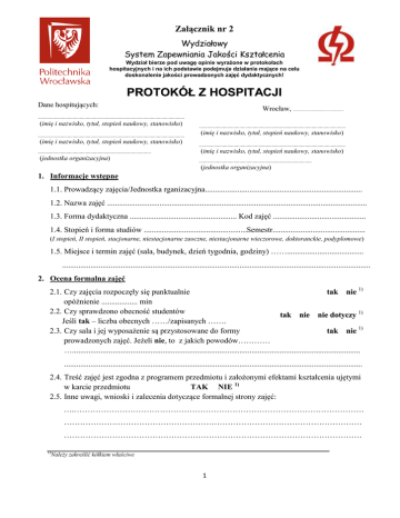 Załącznik nr 2 Wydziałowy System Zapewniania Jakości Kształcenia Wydział bierze pod uwagę opinie wyrażone w protokołach hospitacyjnych i na ich podstawie podejmuje działania mające na celu doskonalenie jakości prowadzonych zajęć dydaktycznych! PROTOKÓŁ Z HOSPITACJI Dane hospitujących: Wrocław, ........................................... ............................................................................................................. (imię i nazwisko, tytuł, stopień naukowy, stanowisko) ............................................................................................................. ............................................................................................................. (imię i nazwisko, tytuł, stopień naukowy, stanowisko) (imię i nazwisko, tytuł, stopień naukowy, stanowisko) ............................................................................................................. .................................................................................... (jednostka organizacyjna) (imię i nazwisko, tytuł, stopień naukowy, stanowisko) .................................................................................... (jednostka organizacyjna) 1. Informacje wstępne 1.1. Prowadzący zajęcia/Jednostka rganizacyjna.............................................................................. 1.2. Nazwa zajęć ................................................................................................................................. 1.3. Forma dydaktyczna ..................................................... Kod zajęć .............................................. 1.4. Stopień i forma studiów ...................................................Semestr.............................................. (I stopień, II stopień, stacjonarne, niestacjonarne zaoczne, niestacjonarne wieczorowe, doktoranckie, podyplomowe) 1.5. Miejsce i termin zajęć (sala, budynek, dzień tygodnia, godziny) ……...................................... ......................................................................................................................................................... 2. Ocena formalna zajęć 2.1. Czy zajęcia rozpoczęły się punktualnie tak nie 1) opóźnienie .................. min 2.2. Czy sprawdzono obecność studentów tak nie nie dotyczy 1) Jeśli tak – liczba obecnych ……/zapisanych ……. 2.3. Czy sala i jej wyposażenie są przystosowane do formy tak nie 1) prowadzonych zajęć. Jeżeli nie, to z jakich powodów………… …............................................................................................................................................... .................................................................................................................................................... 2.4. Treść zajęć jest zgodna z programem przedmiotu i założonymi efektami kształcenia ujętymi w karcie przedmiotu TAK NIE 1) 2.5. Inne uwagi, wnioski i zalecenia dotyczące formalnej strony zajęć: ….……………………………………………………………………………………………… ………………………………………………………………………………………………… ………………………………………………………………………………………………… 1) Należy zakreślić kółkiem właściwe 1 Ocena merytoryczna i metodyczna1) (5 – wyróżniająco, 4 – dobrze, 3 – dostatecznie, 2 – niedostatecznie, 0 – nie dotyczy) 1. Przedstawienie tematu, wyjaśnienie celu i zakresu zajęć 5 4 3 2 0 2. Merytoryczny poziom i aktualność wiedzy przekazywanej 5 4 3 2 0 studentom 3. Adekwatność wyboru przykładów – pod względem treści – do omawianych problemów/zagadnień/zadań 5 4 3 2 0 4. Merytoryczna poprawność udzielanych odpowiedzi na pytania studentów 5 4 3 2 0 Prowadzący: 5. Realizował zajęcia z zaangażowaniem 5 4 3 2 0 6. Wyjaśniał w zrozumiały sposób omawiane zagadnienia 5 4 3 2 0 5 4 3 2 0 7. Inspirował studentów do samodzielnego myślenia (zachęcał do: stawiania pytań, dyskusji, samodzielnego rozwiązywania problemów/zadań) 8. Czytelnie przedstawiał zagadnienia na tablicy lub za pomocą środków audiowizualnych 5 4 3 2 0 9. Przedstawiał materiał, który był przygotowany i 5 4 3 2 0 10. Był komunikatywny 5 4 3 2 0 11. Posługiwał się poprawnym językiem 5 4 3 2 0 12. Panował nad dynamiką grupy 5 4 3 2 0 uporządkowany 13. Tempo prowadzonych zajęć dostosował do możliwości percepcyjnych studentów 5 4 3 2 0 14. Ma umiejętności przekazywania wiedzy (zwięzłość przekazu, jakość narracji, zdolność nawiązywania kontaktu ze studentami) 5 4 3 2 0 Średnia ocena wyznaczana ze wzoru: S = (Suma punktów)/(14 – liczba odpowiedzi nie dotyczy) = 1) Należy zakreślić kółkiem właściwe 2 3. Ocena ogólna 3.1. Skala ocen: Wyróżniająca: S 4,5 ; Dobra: 3,5 S 4,5 ; Dostateczna: 2,5 S 3,5 ; Niedostateczna: S 2,5 1) Ogólna ocena hospitującego/ych: wyróżniająca, dobra, dostateczna, negatywna 3.2. Godne podkreślenia spostrzeżenie dodatnie (w tym innowacyjne/nowatorskie/autorskie metody/sposoby prowadzenia zajęć, atmosfera na zajęciach)........................................................... .................................................................................................................................................................... ................................................................................................................................................................... ……………………….............................................................................................................................. 3.3. Spostrzeżenia krytyczne (w tym stwierdzona niezgodność treści zajęć z programem przedmiotu i założonymi efektami kształcenia ujętymi w karci