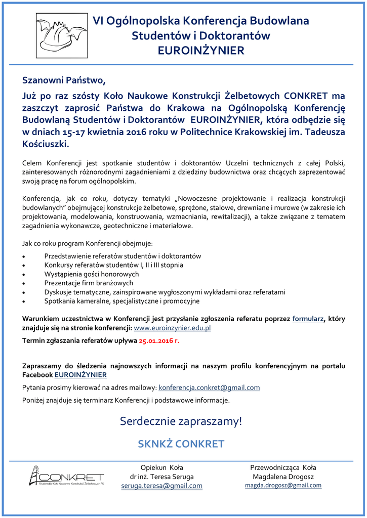 VI Ogólnopolska Konferencja Budowlana Studentów i Doktorantów EUROINŻYNIER Szanowni Państwo, Już po raz szósty Koło Naukowe Konstrukcji Żelbetowych CONKRET ma zaszczyt zaprosić Państwa do Krakowa na Ogólnopolską Konferencję Budowlaną Studentów i Doktorantów EUROINŻYNIER, która odbędzie się w dniach 15-17 kwietnia 2016 roku w Politechnice Krakowskiej im. Tadeusza Kościuszki. Celem Konferencji jest spotkanie studentów i doktorantów Uczelni technicznych z całej Polski, zainteresowanych różnorodnymi zagadnieniami z dziedziny budownictwa oraz chcących zaprezentować swoją pracę na forum ogólnopolskim. Konferencja, jak co roku, dotyczy tematyki „Nowoczesne projektowanie i realizacja konstrukcji budowlanych” obejmującej konstrukcje żelbetowe, sprężone, stalowe, drewniane i murowe (w zakresie ich projektowania, modelowania, konstruowania, wzmacniania, rewitalizacji), a także związane z tematem zagadnienia wykonawcze, geotechniczne i materiałowe. Jak co roku program Konferencji obejmuje: Przedstawienie referatów studentów i doktorantów Konkursy referatów studentów I, II i III stopnia Wystąpienia gości honorowych Prezentacje firm branżowych Dyskusje tematyczne, zainspirowane wygłoszonymi wykładami oraz referatami Spotkania kameralne, specjalistyczne i promocyjne Warunkiem uczestnictwa w Konferencji jest przysłanie zgłoszenia referatu poprzez formularz, który znajduje się na stronie konferencji: www.euroinzynier.edu.pl Termin zgłaszania referatów upływa 25.01.2016 r. Zapraszamy do śledzenia najnowszych informacji na naszym profilu konferencyjnym na portalu Facebook EUROINŻYNIER Pytania prosimy kierować na adres mailowy: [email protected] Poniżej znajduje się terminarz Konferencji i podstawowe informacje. Serdecznie zapraszamy! SKNKŻ CONKRET Opiekun Koła dr inż. Teresa Seruga [email protected] Przewodnicząca Koła Magdalena Drogosz [email protected] TERMINARZ VI KONFERENCJI EUROINŻYNIER I PODSTAWOWE INFORMACJE 1. Zapisy poprzez formularz rejestracyjny do 25.01.2016 2. Kwalifikacja referatów na podstawie zgłoszeń i tematyki, ogłoszenie listy uczestników do 27.01.2016 3. Przesłanie pełnych tekstów referatów i streszczeń do druku do 17.02.2016 4. Dokonanie opłat konferencyjnych do 29.02.2016 5. Recenzowanie referatów i przekazanie uwag autorom, kwalifikacja do wygłoszenia referatu lub zaprezentowania posteru do 13.03.2016 6. Odesłanie poprawionych referatów, gotowych do publikacji do 20.03.2016 7. Konferencja 15-17.04.2016 Konferencja EUROINŻYNIER tradycyjnie odbywa się pod patronatem J.M. Rektora Politechniki Krakowskiej, prof. dr hab. inż. Kazimierza Furtaka, Pana Dziekana Wydziału Inżynierii Lądowej PK, prof. dr hab. inż. Tadeusza Tatary oraz Przewodniczącego Okręgowej Rady Małopolskiej Okręgowej Izby Inżynierów Budownictwa w Krakowie, Pana dr inż. Stanisława Karczmarczyka. Miejsce obrad - sala konferencyjna „Kotłownia”- kampus PK, Kraków, ul. Warszawska 24 Opłata studentów za udział w konferencji będzie podana w terminie późniejszym na stronie Konferencji. Opłata obejmować będzie obiady, uroczystą kolację na zakończenie konferencji, udział w spotkaniu integracyjnym, zwiedzanie zabytków oraz materiały konferencyjne. Zapraszamy serdecznie Opiekunów do współpracy poprzez udział w pracach Jury. Zainteresowanych Opiekunów prosimy o rejestrowanie się poprzez formularz dla Opiekunów na stronie konferencji, ew. o kontakt mailowy. Opiekunowie spoza PK, biorący udział w pracach Jury będą zwolnieni z opłaty za udział w konferencji i będą mieli zapewnione świadczenia j.w. Do przyjazdu na Konferencję zachęcamy również wolnych słuchaczy, którzy nie zgłaszają referatów i nie ponoszą opłat, nie otrzymują również świadczeń ze strony organizatorów, ale są mile widziani. Udział w charakterze wolnego słuchacza nie wymaga rejestracji. Serdecznie zapraszamy do udziału w VI Konferencji EUROINŻYNIER studentów I i II stopnia oraz doktorantów, Studenckie Koła Naukowe i Opiekunów Kół oraz wszystkich zainteresowanych!