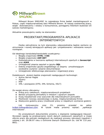Millward Brown SMG/KRC to największa firma badań marketingowych w Polsce, część międzynarodowej sieci Millward Brown. W naszej codzienniej pracy, dzięki doświadczeniu i wiedzy o konsumencie, pomagamy Klientom budować ich sukces marketingowy. Aktualnie poszukujemy osoby na stanowisko: PROJEKTANT/PROGRAMISTA APLIKACJI INTERNETOWYCH Osoba zatrudniona na tym stanowisku odpowiedzialna będzie zarówno za utrzymanie i rozwój istniejących aplikacji jak i projektowanie i wdrażanie nowych rozwiązań. Od idealnego kandydata/kandydatki oczekujemy: • Biegłej znajomości HTML i CSS • Biegłej znajomości ASP.NET • Doświadczenia w tworzeniu aplikacji internetowych opartych o Javascript oraz AJAX • Umiejętność pisania zapytań w języku SQL • Dobrej znajomości języka angielskiego (w stopniu umożliwiającym swobodne czytanie i pisanie dokumentacji) • Umiejętności efektywnego planowania i organizacji pracy Dodatkowym atutem będzie znajomość następujących technologii: • Active Server Pages • JQuery • PHP • XML i powiązane (DTD, XML Schema, XSLT) Ze swojej strony oferujemy: ● Pracę przy ciekawych, międzynarodowych projektach ● Bardzo przyjazną atmosferę w młodym i zgranym zespole ● Dużą niezależność oraz szacunek dla indywidualnych pomysłów ● Możliwość rozwoju zawodowego w dużej, międzynarodowej firmie ● Elastyczne godziny pracy (możliwość pracy w niepełnym wymiarze godzin) List motywacyjny [email protected]. internetowe”. oraz CV, prosimy przesłać na adres W tytule maila prosimy wpisać: „aplikacje Do przesyłanych dokumentów prosimy o dopisanie następującej klauzuli: Wyrażam zgodę na przetwarzanie moich danych osobowych zawartych w mojej ofercie pracy dla potrzeb niezbędnych do realizacji procesu rekrutacji (zgodnie z ustawą z dn. 29.08.97 roku o Ochronie Danych Osobowych Dz. Ust Nr 133 poz. 883) .