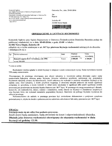 K o m o r n i k Sądowy p r z y Sądzie R e j o n o w y m w O s t r o w c u Świętokrzyskim D o m i n i k a Barańska K a n c e l a r i a K o m o r n i c z a K o m o r n i k a Sądowego w O s t r o w c u Św 2 7 - 4 0 0 O s t r o w i e c Św. P o l n a 1 7 a tel. 4 1 2 4 7 - 6 0 - 8 0 e - m a i l : b i u r o @ o s t r o w i e c k o m o m i k . p l www.ostrowieckomomik.pl K m 319/15 OstrowiecŚw., d n i a 2 9 - 0 3 - 2 0 1 6 Jan Rapcia Jeziorko 48 2 6 - 0 0 6 N o w a Słupia mmm OBWIESZCZENIE O LICYTACJI RUCHOMOŚCI K o m o r n i k Sądowy p r z y Sądzie R e j o n o w y m w O s t r o w c u Świętokrzyskim D o m i n i k a Barańska p o d a j e d o p u b l i c z n e j wiadomości, że w d n i u 05-05-2016r. o g o d z . 13:00 w l o k a l u : 26-006 N o w a Słupia, J e z i o r k o 48 odbędzie się w t r y b i e u s t a l o n y m w a r t . 8 6 7 k p c p i e r w s z a l i c y t a c j a ruchomości należących d o dłużnika i składającycli się z : Lp. N a z w a ruchomości Ilość 1 R e n a u l t L a g u n a K A T 2.0 z i e l o n y , r o k 1996 1 [szt.] Wartość szacunkowa 2 800,00 " ) Cena wywołania 2 100,00 n r r e j . T K I 6203 * ) cena z a sztukę Ruchomości można oglądać w dzień l i c y t a c j i w m i e j s c u i c z a s i e o z n a c z o n y m wyżej. S u m a wywołania w y n o s i 75% sumy oszacowania. Przystępujący d o p r z e t a r g u obowiązany j e s t złożyć rękojmię w wysokości j e d n e j dziesiątej części s u m y o s z a c o w a n i a . Rękojmię złożoną p r z e z l i c y t a n t a , któremu u d z i e l o n o p r z y b i c i a , z a t r z y m u j e się; pozostałym l i c y t a n t o m rękojmię z w r a c a się niezwłocznie. Jeżeli n a b y w c a n i e wykonał w t e r m i n i e warunków l i c y t a c j i c o d o zapłaty c e n y , t r a c i rękojmię, a s k u t k i p r z y b i c i a wygasają. Z u t r a c o n e j rękojmi p o k r y w a się k o s z t y e g z e k u c j i związanej z e sprzedażą, a r e s z t a w c h o d z i w skład s u m y u z y s k a n e j w e g z e k u c j i a l b o jeżeli e g z e k u c j a została u m o r z o n a j e s t p r z e l e w a n a n a dochód S k a r b u Państwa ( a r t . 8 6 7 ^ k p c ) . W p r z e t a r g u n i e mogą uczestniczyć: dłużnik, k o m o r n i k , i c h małżonkowie, d z i e c i , r o d z i c e i rodzeństwo, o s o b y o b e c n e n a l i c y t a c j i w c h a r a k t e r z e urzędowym o r a z l i c y t a n t , który n i e wykonał warunków p o p r z e d n i e j l i c y t a c j i . S t a w i e n i e się j e d n e g o l i c y t a n t a w y s t a r c z a d o odbycia przetargu. Pełnomocnictwo d o udziału w p r z e t a r g u p o w i n n o być s t w i e r d z o n e d o k u m e n t e m z p o d p i s e m urzędowo poświadczonym, c h y b a że c h o d z i o pełnomocnictwo u d z i e l o n e a d w o k a t o w i l u b r a d c y p r a w n e m u ( a r t . 8 6 7 ^ k p c ) UWAGA: L i c y t a c j a może się n i e odbyć b e z p o d a n i a p r z y c z y n y . Jeżeli d r z w i będą zamknięte, będą o t w i e r a n e n a k o s z t i odpowiedzialność dłużnika. Dłużnik j a k o d o z o r c a ruchomości obowiązany d o o k a z a n i a ruchomości w d n i u l i c y t a c j i o d g o d z i n y 12:30.