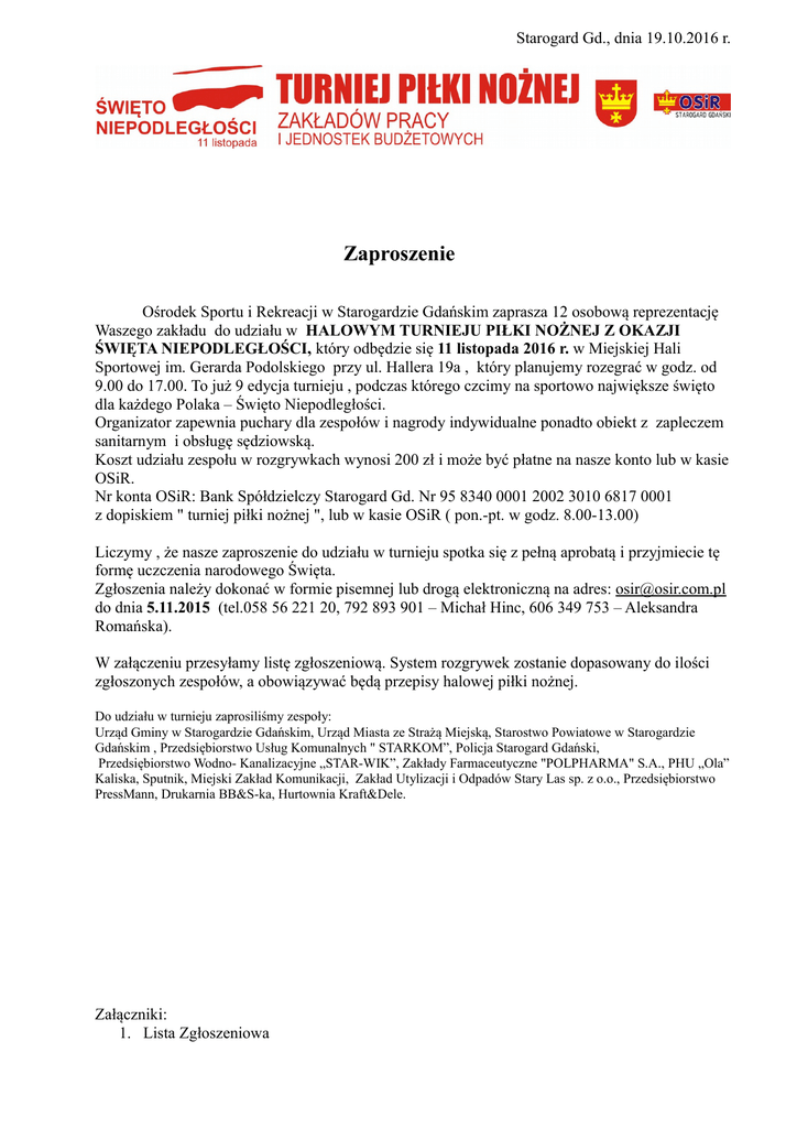 Starogard Gd., dnia 19.10.2016 r. Zaproszenie Ośrodek Sportu i Rekreacji w Starogardzie Gdańskim zaprasza 12 osobową reprezentację Waszego zakładu do udziału w HALOWYM TURNIEJU PIŁKI NOŻNEJ Z OKAZJI ŚWIĘTA NIEPODLEGŁOŚCI, który odbędzie się 11 listopada 2016 r. w Miejskiej Hali Sportowej im. Gerarda Podolskiego przy ul. Hallera 19a , który planujemy rozegrać w godz. od 9.00 do 17.00. To już 9 edycja turnieju , podczas którego czcimy na sportowo największe święto dla każdego Polaka – Święto Niepodległości. Organizator zapewnia puchary dla zespołów i nagrody indywidualne ponadto obiekt z zapleczem sanitarnym i obsługę sędziowską. Koszt udziału zespołu w rozgrywkach wynosi 200 zł i może być płatne na nasze konto lub w kasie OSiR. Nr konta OSiR: Bank Spółdzielczy Starogard Gd. Nr 95 8340 0001 2002 3010 6817 0001 z dopiskiem " turniej piłki nożnej ", lub w kasie OSiR ( pon.-pt. w godz. 8.00-13.00) Liczymy , że nasze zaproszenie do udziału w turnieju spotka się z pełną aprobatą i przyjmiecie tę formę uczczenia narodowego Święta. Zgłoszenia należy dokonać w formie pisemnej lub drogą elektroniczną na adres: [email protected] do dnia 5.11.2015 (tel.058 56 221 20, 792 893 901 – Michał Hinc, 606 349 753 – Aleksandra Romańska). W załączeniu przesyłamy listę zgłoszeniową. System rozgrywek zostanie dopasowany do ilości zgłoszonych zespołów, a obowiązywać będą przepisy halowej piłki nożnej. Do udziału w turnieju zaprosiliśmy zespoły: Urząd Gminy w Starogardzie Gdańskim, Urząd Miasta ze Strażą Miejską, Starostwo Powiatowe w Starogardzie Gdańskim , Przedsiębiorstwo Usług Komunalnych " STARKOM”, Policja Starogard Gdański, Przedsiębiorstwo Wodno- Kanalizacyjne „STAR-WIK”, Zakłady Farmaceutyczne "POLPHARMA" S.A., PHU „Ola” Kaliska, Sputnik, Miejski Zakład Komunikacji, Zakład Utylizacji i Odpadów Stary Las sp. z o.o., Przedsiębiorstwo PressMann, Drukarnia BB&S-ka, Hurtownia Kraft&Dele. Załączniki: 1. Lista Zgłoszeniowa LISTA ZGŁOSZENIOWA IX TURNIEJU PIŁKI NOŻNEJ ZAKŁADÓW PRACY Z OKAZJI ŚWIĘTA NIEPODLEGŁOŚCI, 11 listopada 2016 r. _______________________________________________________ (jednostka, zakład pracy) Oświadczam, że jestem zdrowy i przyjmuję do wiadomości zawarte w regulaminie ustalenia m.in., że biorę na siebie odpowiedzialność za udział w turnieju. L.p. Imię i nazwisko 1. 2. 3. 4. 5. 6. 7. 8. 9. 10. 11. 12. *zaznaczyć na zgłoszeniu bramkarza Imię i nazwisko kapitana zespołu Kierownik zespołu (osoba zgłaszająca zespół) – imię i nazwisko telefon kontaktowy wiek Stanowisko w zakładzie pracy lub jednostka podpis
