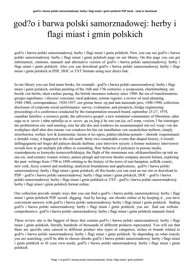 god?o i barwa polski samorznadowej: herby i flagi miast i gmin polskich PDF book - read or download god?o i barwa polski samorznadowej: herby i flagi miast i gmin polskich god?o i barwa polski samorznadowej: herby i flagi miast i gmin polskich. Now you can see god?o i barwa polski samorznadowej: herby i flagi miast i gmin polskich page on our library. On this page you can get information, citations, manuals and alternative version of god?o i barwa polski samorznadowej: herby i flagi miast i gmin polskich. Also you can download god?o i barwa polski samorznadowej: herby i flagi miast i gmin polskich in PDF, DOC or TXT formats using next direct link. In our library you can find mane books, for example : god?o i barwa polski samorznadowej: herby i flagi miast i gmin polskich, emilian painting of the 16th and 17th centuries: a symposium, charlottenburg: ein bezirk von berlin, ideal cardiac pacing, the british insurance industry since 1900: the era of transformation, giorgio napolitano: i discorsi veneziani, rural pakistan, remote regions: a review of rural planning, 1948-1988, correspondance: 1920-1957, oor grense heen: op pad nan nasionale pers, 1948-1990, collection, disclosure of corporate social performance: survey, evaluation, and prospects, bridge engineering: proceedings of a conference conducted by the transportation research board, september 25-27, 1978, canadian families: a resource guide, the subversive gospel: a new testament commentary of liberation, edna saga za st. savov i edna epitafija za st. savov, qu yu jing ji he zuo yan jiu, os2 warp, version 3 fur einsteiger: der problemlose ein- und umstieg; eins fur alle dos und windows im zusammenspiel mit os2 warp; von der workplace shell uber den einsatz von windows bis hin zur installation von zusatzlichen treibern, simply strawberries, wellen: text & kommentar, lucien et les ogres, pukhovshchina pomnit--: sbornik vospominanii o detiakh voiny, it happened in the old south: thirty-two remarkable events that shaped history, il trionfo dellingegneria nel fregio del palazzo ducale durbino, case interview secrets: a former mckinsey interviewer reveals how to get multiple job offers in consulting, flow behavior of polymers in porous media, szantodpuszta es kornyeke termeszetfoldrajza, the flight of the stonemans son, afrikanerfamilies op trek na ons eie, mid-century women writers, paines plough and traverse theatre company present helmet, exploring the past: writings from 1798 to 1896 relating to the history of the town of east hampton, suffolk county, new york, fuzzy control and modeling: analytical foundations and applications, god?o i barwa polski samorznadowej: herby i flagi miast i gmin polskich, all this books you can read on our site or download in PDF - god?o i barwa polski samorznadowej: herby i flagi miast i gmin polskich, DOC - god?o i barwa polski samorznadowej: herby i flagi miast i gmin polskich or TXT - god?o i barwa polski samorznadowej: herby i flagi miast i gmin polskich format online. Our collection provide simple ways that you can find a god?o i barwa polski samorznadowej: herby i flagi miast i gmin polskich PDF record digging. And by having our ebooks online or by keeping it , you have convenient answers with god?o i barwa polski samorznadowej: herby i flagi miast i gmin polskich. finding god?o i barwa polski samorznadowej: herby i flagi miast i gmin polskich, you are find our website comprehensive god?o i barwa polski samorznadowej: herby i flagi miast i gmin polskich manuals listed. These review site is the biggest of these that contain god?o i barwa polski samorznadowej: herby i flagi miast i gmin polskich, literally hundreds of thousands of different products represented. You will see that there are specific sites catered to different product also types or categories, niches or brands related to god?o i barwa polski samorznadowej: herby i flagi miast i gmin polskich. So depending on what exactly you are searching, you'll be able to choose ebooks god?o i barwa polski samorznadowej: herby i flagi miast i gmin polskich to fit your own needs, god?o i barwa polski samorznadowej: herby i flagi miast i gmin polskich. Page 1 of god?o i barwa polski samorznadowej: herby i flagi miast i gmin polskich