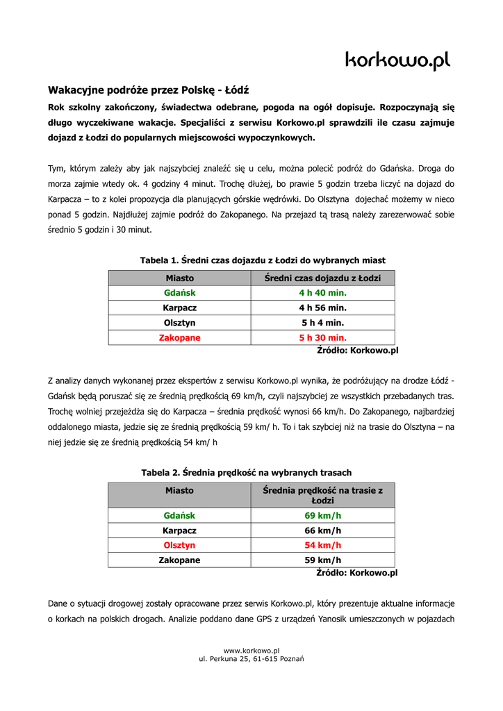 Wakacyjne podróże przez Polskę - Łódź Rok szkolny zakończony, świadectwa odebrane, pogoda na ogół dopisuje. Rozpoczynają się długo wyczekiwane wakacje. Specjaliści z serwisu Korkowo.pl sprawdzili ile czasu zajmuje dojazd z Łodzi do popularnych miejscowości wypoczynkowych. Tym, którym zależy aby jak najszybciej znaleźć się u celu, można polecić podróż do Gdańska. Droga do morza zajmie wtedy ok. 4 godziny 4 minut. Trochę dłużej, bo prawie 5 godzin trzeba liczyć na dojazd do Karpacza – to z kolei propozycja dla planujących górskie wędrówki. Do Olsztyna dojechać możemy w nieco ponad 5 godzin. Najdłużej zajmie podróż do Zakopanego. Na przejazd tą trasą należy zarezerwować sobie średnio 5 godzin i 30 minut. Tabela 1. Średni czas dojazdu z Łodzi do wybranych miast Miasto Średni czas dojazdu z Łodzi Gdańsk 4 h 40 min. Karpacz 4 h 56 min. Olsztyn 5 h 4 min. Zakopane 5 h 30 min. Źródło: Korkowo.pl Z analizy danych wykonanej przez ekspertów z serwisu Korkowo.pl wynika, że podróżujący na drodze Łódź Gdańsk będą poruszać się ze średnią prędkością 69 km/h, czyli najszybciej ze wszystkich przebadanych tras. Trochę wolniej przejeżdża się do Karpacza – średnia prędkość wynosi 66 km/h. Do Zakopanego, najbardziej oddalonego miasta, jedzie się ze średnią prędkością 59 km/ h. To i tak szybciej niż na trasie do Olsztyna – na niej jedzie się ze średnią prędkością 54 km/ h Tabela 2. Średnia prędkość na wybranych trasach Miasto Średnia prędkość na trasie z Łodzi Gdańsk 69 km/h Karpacz 66 km/h Olsztyn 54 km/h Zakopane 59 km/h Źródło: Korkowo.pl Dane o sytuacji drogowej zostały opracowane przez serwis Korkowo.pl, który prezentuje aktualne informacje o korkach na polskich drogach. Analizie poddano dane GPS z urządzeń Yanosik umieszczonych w pojazdach www.korkowo.pl ul. Perkuna 25, 61-615 Poznań poruszających się w godzinach od 06:00 do 22:00 w okresie 01.07.2012. ------------------------------Dystrybucja materiałów: Kinga Przybysz [email protected] kom./+48/ 519-181-900 www.korkowo.pl ul. Perkuna 25, 61-615 Poznań