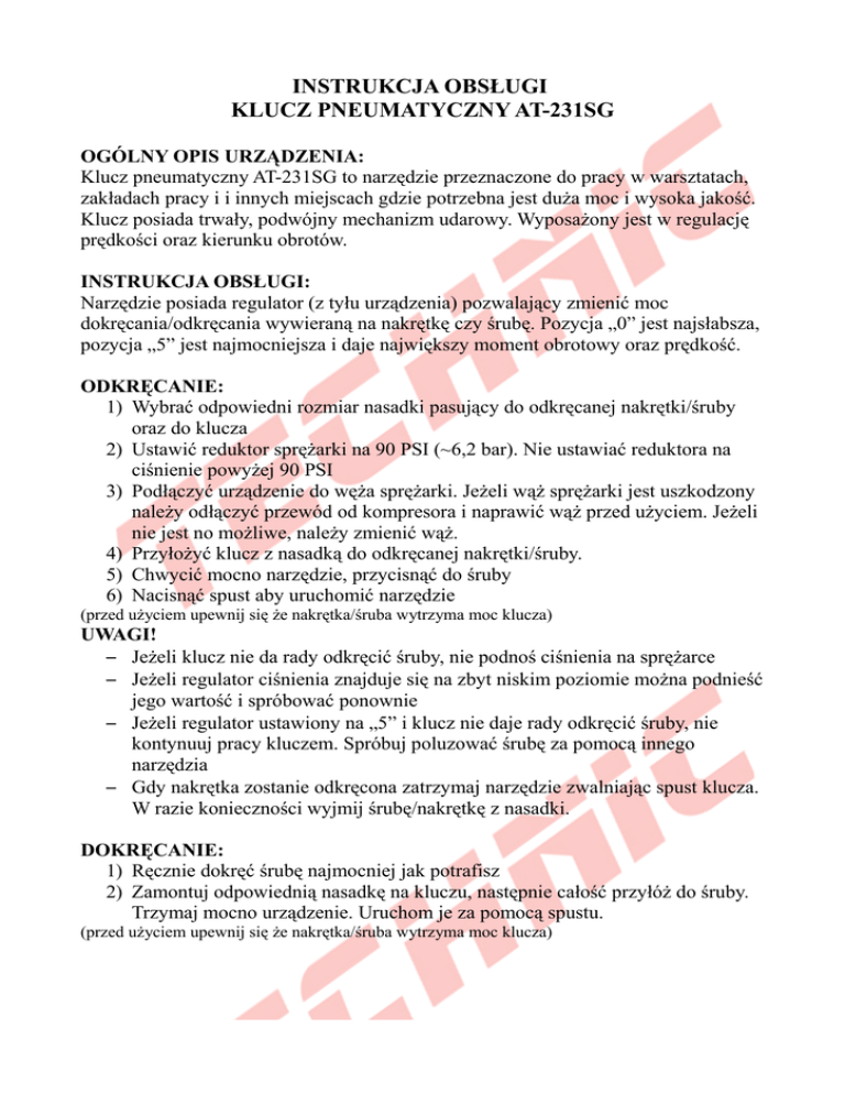 INSTRUKCJA OBSŁUGI KLUCZ PNEUMATYCZNY AT-231SG OGÓLNY OPIS URZĄDZENIA: Klucz pneumatyczny AT-231SG to narzędzie przeznaczone do pracy w warsztatach, zakładach pracy i i innych miejscach gdzie potrzebna jest duża moc i wysoka jakość. Klucz posiada trwały, podwójny mechanizm udarowy. Wyposażony jest w regulację prędkości oraz kierunku obrotów. INSTRUKCJA OBSŁUGI: Narzędzie posiada regulator (z tyłu urządzenia) pozwalający zmienić moc dokręcania/odkręcania wywieraną na nakrętkę czy śrubę. Pozycja „0” jest najsłabsza, pozycja „5” jest najmocniejsza i daje największy moment obrotowy oraz prędkość. ODKRĘCANIE: 1) Wybrać odpowiedni rozmiar nasadki pasujący do odkręcanej nakrętki/śruby oraz do klucza 2) Ustawić reduktor sprężarki na 90 PSI (~6,2 bar). Nie ustawiać reduktora na ciśnienie powyżej 90 PSI 3) Podłączyć urządzenie do węża sprężarki. Jeżeli wąż sprężarki jest uszkodzony należy odłączyć przewód od kompresora i naprawić wąż przed użyciem. Jeżeli nie jest no możliwe, należy zmienić wąż. 4) Przyłożyć klucz z nasadką do odkręcanej nakrętki/śruby. 5) Chwycić mocno narzędzie, przycisnąć do śruby 6) Nacisnąć spust aby uruchomić narzędzie (przed użyciem upewnij się że nakrętka/śruba wytrzyma moc klucza) UWAGI! – Jeżeli klucz nie da rady odkręcić śruby, nie podnoś ciśnienia na sprężarce – Jeżeli regulator ciśnienia znajduje się na zbyt niskim poziomie można podnieść jego wartość i spróbować ponownie – Jeżeli regulator ustawiony na „5” i klucz nie daje rady odkręcić śruby, nie kontynuuj pracy kluczem. Spróbuj poluzować śrubę za pomocą innego narzędzia – Gdy nakrętka zostanie odkręcona zatrzymaj narzędzie zwalniając spust klucza. W razie konieczności wyjmij śrubę/nakrętkę z nasadki. DOKRĘCANIE: 1) Ręcznie dokręć śrubę najmocniej jak potrafisz 2) Zamontuj odpowiednią nasadkę na kluczu, następnie całość przyłóż do śruby. Trzymaj mocno urządzenie. Uruchom je za pomocą spustu. (przed użyciem upewnij się że nakrętka/śruba wytrzyma moc klucza) UWAGI! – Nie podnoś ciśnienia na sprężarce powyżej 90 PSI. – Jeżeli regulator ciśnienia znajduje się na zbyt niskim poziomie można podnieść jego wartość i spróbować ponownie – Gdy nakrętka zostanie dokręcona zatrzymaj narzędzie zwalniając spust klucza. W razie konieczności wyjmij śrubę/nakrętkę z nasadki. – Jeżeli to możliwe sprawdź zalecany moment obrotowy dla dokręcanej śruby. W razie konieczności dokręć śrubę odpowiednio ustawionym kluczem dynamometrycznym ZALECENIA: – Upewnij się że sprężarka która zasili klucz pneumatyczny ma prawidłowy przepływ powietrza na wyjściu – Podczas podpinania klucza do przewodu ustaw reduktor sprężarki na 0 (Wyłączony) – Używaj ciśnienia 90PSI podczas pracy narzędzia. Zbyt wysokie ciśnienie i zanieczyszczone powietrze mogą zmniejszyć żywotność urządzenia oraz mogą doprowadzić do usterek i niebezpiecznych sytuacji. – Codziennie opróżniaj urządzenie z wody która może uszkodzić mechanizm klucza – Co najmniej raz na tydzień czyść filtr przed wlotem powietrza. – Minimalna średnica węża powinna być nie mniejsza niż 1/4”. Złącza powietrza zastosowane do węża również powinny mieć średnicę nie mniejszą niż wąż. Dla osiągnięcie najlepszych wyników klucza należy stosować przewód o średnicy 3/8”. – Używaj tylko odpowiednich przewodów. – Trzymaj przewody z daleka od ciepła, oleju a ostrych krawędzi. Sprawdź szczelność przewodu przed użyciem. Upewnij się że wszystkie połączenia są bezpieczne. – Stosuj naolejacz ISNTRUKCJA BEZPIECZEŃSTWA – Podczas pracy powinna być stosowana ochrona oczu. Podczas pracy może powstawać pył szkodliwy dla zdrowia. Zaleca się stosowanie maski przeciw pyłowej – Jeżeli to konieczne stosuj ochronę uszu przed hałasem – Zawsze pracuj w miejscu gdzie można utrzymać równowagę. Przy pracy na wysokości stosuj zaczepy i pasy aby obie ręce były wolne dla urządzenia – Nie pracuj z biżuterią i zegarkami. Elementy ubioru muszą być tak dopasowane, aby nie wplątały się w ruchome części klucza ponieważ mogą spowodować wypadek. – Miejsce pracy powinno być czyste. Urządzenie powinna obsługiwać naraz jedna osoba. Miejsce pracy powinno być dobrze wentylowane. – Rozłącz klucz z wężem zanim zaczniesz zmieniać nasadki/akcesoria na kluczu – Zanim podepniesz urządzenie to węża upewnij się że klucz jest na pozycji off. – Nigdy nie przenoś narzędzia trzymając za węża. KONSERWACJA I SMAROWANIE: – Jeżeli nie korzystasz z olejarki, smaruj urządzenie przy użyciu dozownika. Nalej kilka kropli oleju przez wlot powietrza i uruchom narzędzie. Stosuj olej odpowiedni do kluczy pneumatycznych – Unikać używania zbyt gęstego oleju który może spowodować uszkodzenie lub obniżenie wartości urządzenia – Smarowanie jest konieczne co 1 godzinę ciągłej pracy – Po zakończeniu pracy odepnij wąż od urządzenia, nakrop 4-5kropli oleju , złącz z powrotem wąż z kluczem i uruchom urządzenie na kilka sekund. Może to wydłużyć okres eksploatacji urządzenia. OSTRZEŻENIA: – Nigdy nie używaj urządzenia w warunkach zagrożenia wybuchem – Pracuj na równej, stabilnej powierzchni. Używaj rękawic ochronnych w celu zminimalizowania zagrożenia uszkodzenia rąk w razie awarii – Nieoczekiwany ruch narzędzia spowodowany siłą odrzutu (za słabe trzymanie narzędzia) lub zerwaniem śruby, może spowodować obrażenia ciała – Długie włosy powinny być spięte/związane tak aby nie zaplątać się w urządzenie. Zaplątanie się włosów w klucz może spowodować obrażenia ciała. – Głośnia praca urządzenia może spowodować uszkodzenia słuchu. Stosuj ochronę uszu (słuchawki, stopery) – Poślizg / potknięcie / upadek mogą być przyczyną poważnych uszko