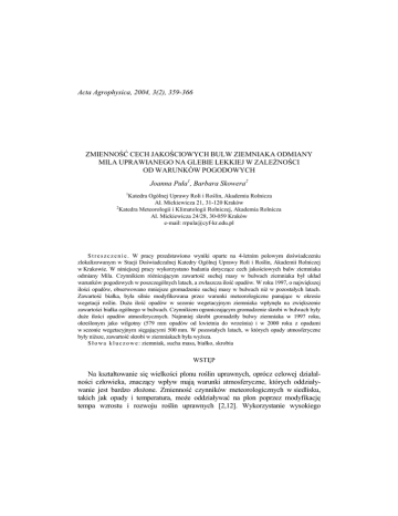 Acta Agrophysica, 2004, 3(2), 359-366 ZMIENNOŚĆ CECH JAKOŚCIOWYCH BULW ZIEMNIAKA ODMIANY MILA UPRAWIANEGO NA GLEBIE LEKKIEJ W ZALEśNOŚCI OD WARUNKÓW POGODOWYCH Joanna Puła1, Barbara Skowera2 1 Katedra Ogólnej Uprawy Roli i Roślin, Akademia Rolnicza Al. Mickiewicza 21, 31-120 Kraków 2 Katedra Meteorologii i Klimatologii Rolniczej, Akademia Rolnicza Al. Mickiewicza 24/28, 30-059 Kraków e-mail: [email protected] S t r e s z c z e n i e . W pracy przedstawiono wyniki oparte na 4-letnim polowym doświadczeniu zlokalizowanym w Stacji Doświadczalnej Katedry Ogólnej Uprawy Roli i Roślin, Akademii Rolniczej w Krakowie. W niniejszej pracy wykorzystano badania dotyczące cech jakościowych bulw ziemniaka odmiany Mila. Czynnikiem róŜnicującym zawartość suchej masy w bulwach ziemniaka był układ warunków pogodowych w poszczególnych latach, a zwłaszcza ilość opadów. W roku 1997, o największej ilości opadów, obserwowano mniejsze gromadzenie suchej masy w bulwach niŜ w pozostałych latach. Zawartość białka, była silnie modyfikowana przez warunki meteorologiczne panujące w okresie wegetacji roślin. DuŜa ilość opadów w sezonie wegetacyjnym ziemniaka wpłynęła na zwiększenie zawartości białka ogólnego w bulwach. Czynnikiem ograniczającym gromadzenie skrobi w bulwach były duŜe ilości opadów atmosferycznych. Najmniej skrobi gromadziły bulwy ziemniaka w 1997 roku, określonym jako wilgotny (579 mm opadów od kwietnia do września) i w 2000 roku z opadami w sezonie wegetacyjnym sięgającymi 500 mm. W pozostałych latach, w których opady atmosferyczne były niŜsze, zawartość skrobi w ziemniakach była wyŜsza. S ł o w a k l u c z o w e : ziemniak, sucha masa, białko, skrobia WSTĘP Na kształtowanie się wielkości plonu roślin uprawnych, oprócz celowej działalności człowieka, znaczący wpływ mają warunki atmosferyczne, których oddziaływanie jest bardzo złoŜone. Zmienność czynników meteorologicznych w siedlisku, takich jak opady i temperatura, moŜe oddziaływać na plon poprzez modyfikację tempa wzrostu i rozwoju roślin uprawnych [2,12]. Wykorzystanie wysokiego 360 J. PUŁA, B. SKOWERA potencjału plonotwórczego ziemniaków związane jest, więc ze stworzeniem optymalnych warunków ich wegetacji. Jednak nawet poprawienie agrotechniki i racjonalne stosowanie środków produkcji pochodzenia przemysłowego nie chroni tego gatunku przed zmiennością plonowania w latach, spowodowaną głównie przez warunki wilgotnościowe [13,15,17]. MATERIAŁ I METODY Doświadczenie płodozmianowe prowadzono w Mydlnikach k. Krakowa w Stacji Doświadczalnej Katedry Ogólnej Uprawy Roli i Roślin Akademii Rolniczej w Krakowie. ZałoŜono je metodą losowanych podbloków w czterech powtórzeniach. Badania przeprowadzono w latach 1997-2000. Ziemniak odmiany Mila (średnio wczesna, jadalna), wysadzano w trzeciej dekadzie kwietnia w rozstawie 62,5 × 40 cm. Uprawę roli pod ziemniak przeprowadzano zgodnie z ogólnie przyjętymi zasadami poprawnej agrotechniki. W uprawie tej rośliny do nawoŜenia uŜyto: nawozów mineralnych, obornika, słomy pszenŜyta ozimego, jęczmienia jarego i grochu siewnego. Ziemniak uprawiano po pszenŜycie ozimym z przyoranym międzyplonem ścierniskowym lub bez jego udziału. NawoŜenie mineralne zastosowano w dawce: N – 90, P2O5 – 60, K2O – 100 kg⋅ha-1. Dawka obornika wynosiła 30 t⋅ha-1, dawki słomy i przyorywanej biomasy gorczycy białej zaleŜały od ich ilości pozyskiwanych w danym roku (średnio – 3,8 t⋅ha-1 słomy jęczmienia jarego, 4,6 t⋅ha-1 pszenŜyta ozimego, 3,4 t⋅ha-1 grochu siewnego, 12,4 t⋅ha-1 świeŜej masy gorczycy białej). Przed wykonaniem orki, słomę pocięto i równomiernie rozrzucono na poletkach. W celu wyrównania bilansu azotowego równocześnie ze słomą wprowadzono do gleby 1 kg N na 100 kg słomy. Glebę, na której prowadzono doświadczenie zaliczano do kompleksu Ŝytniego dobrego. Warstwa orna gleby odznaczała się niską zawartością azotu i potasu oraz średnią zawartością fosforu, pH było kwaśne. Warunki pogodowe dla Stacji Doświadczalnej w Mydlnikach zostały opisane na podstawie danych ze Stacji Meteorologicznej Instytutu Meteorologii i Gospodarki Wodnej w Balicach koło Krakowa [10]. Charakterystykę warunków termicznych (tab. 1) przedstawiono w oparciu o średnie miesięczne temperatury powietrza oraz odchylenia temperatury od normy [17,18]. Za normę przyjęto średnie miesięczne temperatury powietrza z wielolecia (1961-1990). Charakterystykę warunków wilgotnościowych (tab. 2) przedstawiono na podstawie miesięcznych sum opadów atmosferycznych dla kaŜdego roku prowadzenia eksperymentu. Wielkość opadów atmosferycznych dla miesięcy okresu wegetacyjnego ziemniaka (IV-IX) scharakteryzowano według kryterium Kaczorowskiej [9], za normę przyjęto średnie z lat 1961-1990. 361 ZMIENNOŚĆ CECH JAKOŚCIOWYCH BULW ZIEMNIAKA Tabela 1. Klasyfikacja miesięcy w latach 1997-2000 według odchyleń temperatury od normy Table 1. Classification of months in the years 1997-2000 according to deviation of the temperature from the standard Lata Years 1997 1998 1999 2000 IV bardzo zimny very cool bardzo ciepły very warm bardzo ciepły very warm ciepły warm Charakterystyka miesięcy – Characteristics of months V VI VII VIII bardzo ciepły ciepły normalny ciepły warm warm normal very warm bardzo ciepły ciepły ciepły ciepły warm warm warm very warm skrajnie ciepły normalny ciepły normalny extremaly normal warm normal warm normalny normalny zimny ciepły normal normal cool warm IX normalny normal normalny normal skrajnie ciepły extremely warm bardzo zimny very cool Tabela 2. Charakterystyka wilgotnościowa miesięcy w latach 1997-2000 Table 2. Humidity characteristics of months in the years 1997-2000 Lata Years 1997 1998 1999 2000 Charakterystyka miesięcy – Characteristics of months V VI VII VIII IX skrajnie przeciętny przeciętny przeciętny przeciętny wil