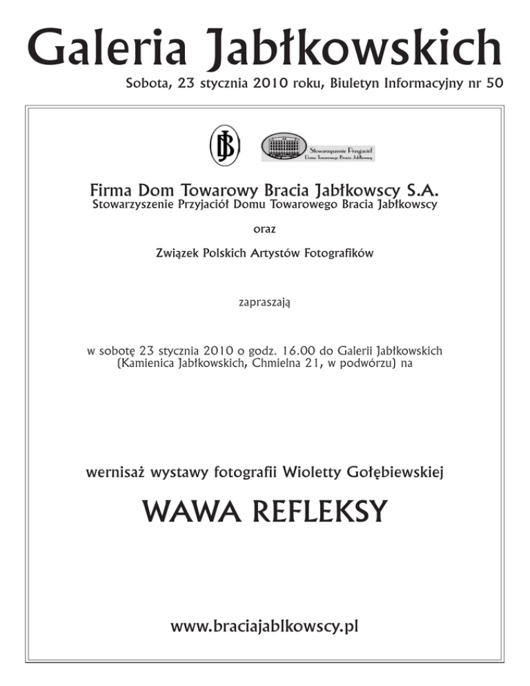 Galeria Jabłkowskich Sobota, 23 stycznia 2010 roku, Biuletyn Informacyjny nr 50 Firma Dom Towarowy Bracia Jabłkowscy S.A. Stowarzyszenie Przyjaciół Domu Towarowego Bracia Jabłkowscy oraz Związek Polskich Artystów Fotografików zapraszają w sobotę 23 stycznia 2010 o godz. 16.00 do Galerii Jabłkowskich (Kamienica Jabłkowskich, Chmielna 21, w podwórzu) na wernisaż wystawy fotografii Wioletty Gołębiewskiej wawa refleksy www.braciajablkowscy.pl Galeria Jabłkowskich Warszawa, ul. Chmielna 21 Wydarzenia kulturalne i rozrywkowe stale towarzyszyły działalności Domu Towarowego Bracia Jabłkowscy, który do roku 1950 mieścił się w budynku przy ulicy Brackiej 25. W jego podziemiach organizowano wystawy sztuki ludowej, obrazów, grafiki i fotografii, w kawiarni występowali popularni artyści estradowi a na najwyższym piętrze odbywały się przedstawienia kukiełkowego teatrzyku dziecięcego. Nawiązując do przedwojennej tradycji w podwórzu Kamienicy Jabłkowskich przy ulicy Chmielnej 21 od grudnia 2004 roku działa Galeria Jabłkowskich. Galeria jest przedsięwzięciem non-profit. Prezentowane w niej są zróżnicowane tematycznie wystawy fotografii i plakatu, organizowane są warsztaty fotograficzne. Wawa refleksy Galeria Jabłkowskich, 23 stycznia - 5 marca 2010 „Wszystkie prezentowane na wystawie fotografie zrobione zostały aparatem analogowym bez żadnych manipulacji w momencie wykonywania zdjęcia ani na etapie postprodukcji. Innymi słowy jest to warszawska rzeczywistość zastana, którą każdy z nas może dostrzec, jeśli tylko spojrzy na nią pod trochę innym kątem (czasami w dosłownym tego wyrażenia znaczeniu). Obserwując miasto przeglądające się w sklepowych witrynach, zauważyć można, jak świat rzeczywisty przenika się ze światem wykreowanym na potrzeby sprzedaży, niejednokrotnie obnażając jego groteskowość. Nieskazitelnym postaciom z reklamy nagle wyrastają z głowy drzewa, krzyże, zegary, a wystawowe manekiny przybierają kształt Pałacu Kultury. Niby zabawne, a jednak nie do końca, niby dokument, a jednak dość subiektywny (jak każdy dokument zresztą).” – Wioletta Gołębiewska. Wystawa potrwa do 5 marca 2010. Zapraszamy. Wioletta Gołębiewska Urodzona w 1974 roku. Absolwentka italianistyki i romanistyki, doktor historii. Z zawodu tłumaczka. Po siedmiu latach spędzonych za granicą (doktorat we Włoszech, praca w Parlamencie Europejskim w Luksemburgu) od półtora roku znowu mieszka w Warszawie. W ubiegłym roku ukończyła z wyróżnieniem rok podstawowy Studium Fotografii ZPAF i wzięła udział w VIII Dorocznej Wystawie Studium Fotografii ZPAF. Obecnie słuchaczka roku warsztatowego. Na koncie ma także wyróżnienia w konkursach fotograficznych w Mediolanie (Premio Perini 2003) i Veglie (Obiettivo Salento 2002) oraz dwie indywidualne wystawy również we Włoszech, w Lecce (2002) i Galatone (2004).