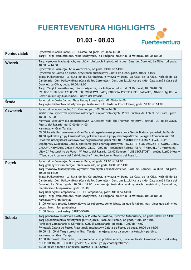 FUERTEVENTURA HIGHLIGHTS 01.03 - 08.03 Poniedziałek - Ryneczek w Morro Jable, C.H. Cosmo, od godz. 09:00 do 14:00 Targi: Targi Rzemieślnicze, rolno-spożywcze, na Polígono Industrial El Matorral, 10: 00-18: 00 Wtorek - Targ wyrobów tradycyjnych, wyrobów rolniczych i rękodzielnictwa, Casa del Coronel, La Oliva, od godz. 10:00 do 14:00 - Ryneczek w Corralejo, Acua Water Park, od godz. 09:00 do 14:00 - Ryneczek de Caleta de Fuste, przystanek autobusowy Caleta de Fuste, godz. 10:00 -14:00 - Trasa Pułkowników (La Ruta de los Coroneles), z wizytą w Domu La Casa de la Cilla, Kościół de La Candelaria, Dom Pułkowników (Casa de los Coroneles), Centrum Sztuki Kanaryjskiej Casa Mané i Casa del Coronel, La Oliva, godz. 10:00:14:00 Targi: Targi Rzemieślnicze, rolno-spożywcze, na Polígono Industrial El Matorral, 10: 00-18: 00 09: 00-13: 00 oraz 17: 00-21: 00 WYSTAWA “ARQUEOLOGÍA POÉTICA DEL PAISAJE”, Alberto Agulló, w Cemtrum kultury Juan Ismael, Puerto del Rosario. - Ryneczek w Costa Calma, Plaza Hapag LLoyd, godz. 09:00 do 14:00 - Targ rękodzielnictwa artystycznego, Restaurante El Jardín w Costa Calma, godz. 10:00 do 14:00 Środa Czwartek Piątek Sobota - Ryneczek w Morro Jable, C.H. Cosmo, godz. 09:00 do 14:00 - Merkastillo, ryneczek wyrobów rolniczych i rękodzielniczych, Plaza Pública de Caleat de Fuste, godz. 18:00 - 22:00 - Kiermasz specjalny dla podróżujących „Cruzerem Aida Blu Thomson Majesty”, deptak, ul. 1o de Mayo. Puerto del Rosario, od 10:00 do 14:00 Karnawał w Gran Tarajal 09:00 Parada Karnawałowa w Gran Tarajal organizowane przez szkoła García Blairzy i przedszkola Bambi. 10:30 Spektakle grupy karnawałowe, pokazać taniec i grupy choreograficzne (Murgas i Comparsas)21:00 Otwarcie uroczystości karnawałowe organizowane przez VICENTE “RONDON” Y JUAN “EL MAJUGA”, i współpracy Guacimara García. Spotkanie grup choreograficznych : BALLET STYLO, DANZARTE, SWING GIRLS, GALAXY, HYPNOTIC CREW Y ACAYMO, 21.30 10:00 do 14:00Rynek Rejsów na raj “ AIDA BLU” , muzyka na ulicy C/ Peatonal 1o de Mayo. W Puerto del Rosario. 21:00 Koncert “LOS SECRETOS” , Można kupić bilety w “Tienda de Artesanía del Cabildo Insular”, Auditorium w Puerto del Rosario. - Ryneczek w Corralejo, Acua Water Park, od godz. 09:00 do 14:00 - Targ gminny w Gran Tarajal, Plaza Mercado, od godz. 09:00 do 14:00 - Targ wyrobów tradycyjnych, wyrobów rolniczych i rękodzielnictwa, Casa del Coronel, La Oliva, od godz. 10:00 do 14:00 - Trasa Pułkowników (La Ruta de los Coroneles), z wizytą w Domu La Casa de la Cilla, Kościół de La Candelaria, Dom Pułkowników (Casa de los Coroneles), Centrum Sztuki Kanaryjskiej Casa Mané i Casa del - Coronel, La Oliva, godz. 10:00 - 14:00 oraz wersja teatralna w 4 językach: angielskim, francuskim, niemieckim i hiszpańskim, godz. 10:30 - Targ Kanaryjski Campanario, C.H. El Campanario, godz. 10:30 do 14:00 Targi: Targi Rzemieślnicze, rolno-spożywcze, na Polígono Industrial El Matorral, 10: 00-18: 00 Karnawał w Gran Tarajal 21:00 Konkurs zespoły karnawałowy: los rebenkes, como jairas, las que faltaban, más ruines que caín y los cucas libre, i los gambusinos. 01:00 Fiesta z orkiestrą GRUPOBOMBA, - Targ produktów rolniczych Biosfery w Puerto del Rosario, Dworzec Autobusowy, od godz. 08:00 do 14:00 Targ rękodzielnictwa artystycznego w Lajares, Plaza del Pueblo, od godz. 10:00 do 15:00 Pchli targ Campanario w Corralejo, C.H. El Campanario, od godz. 10:00 do 14:00 Ryneczek Caleta de Fuste, Przystanek autobusowy Caleta de Fuste, od godz. 10:00 do 14:00 10:00 – 21:00 VI Targi staroci w Gran Tarajal, miejsce: ulica za supermarketach Hiperdino. Karnawał w Gran Tarajal 17:00 Karnawał atlantycki , na promenada w pobliżu morza, wielka fiesta karnawałowa z orkiestrą NUEVO KLAN, DJ TUDD DUB y SUNNY, Zumba i grupy choreograficzne. - 23:00 Fiesta i taniec z orkiestrą BOMBA i EL COMBO Niedziela - Targ kanaryjskiego rękodzielnictwa artystycznego w Corralejo, C.H. El Campanario, od godz. 10:00 do 14:00 Targ rolniczy i rękodzielnictwa artystycznego w Fuerteventura Oasis Park (La Lajita), od godz. 10:00 do 14:00 Targ rękodzielnictwa artystycznego, Restauracja El Jardín w Costa Calma, godz. 10:00 - 14:00 Ryneckek i Karnawał w Tetir spotkanie dziecięcych kapel ulicznych, Tictactitos –Cascabeles – Chiquerompis, 10:00-14:00 Ryneczek okazji, muzyka na żywo, Plaza de la Paz w Puerto del Rosario, 08:00 do 14:00 Karnawał w Gran Tarajal 17:00 karnawał dla rodzin , Spotkanie dziecięcych kapel ulicznych, , warsztatów i nadmuchiwanych gier.