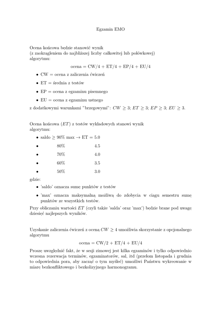 Egzamin EMO Ocena końcowa be‘dzie stanowić wynik (z zaokra‘gleniem do najbliższej liczby calkowitej lub polówkowej) algorytmu: ocena = CW/4 + ET/4 + EP/4 + EU/4 • CW = ocena z zaliczenia ćwiczeń • ET = średnia z testów • EP = ocena z egzaminu pisemnego • EU = ocena z egzaminu ustnego z dodatkowymi warunkami ”brzegowymi”: CW ≥ 3; ET ≥ 3; EP ≥ 3; EU ≥ 3. Ocena końcowa (ET ) z testów wykladowych stanowi wynik algorytmu: • saldo ≥ 90% max → ET = 5.0 • 80% 4.5 • 70% 4.0 • 60% 3.5 • 50% 3.0 gdzie: • ’saldo’ oznacza sume‘ punktów z testów • ’max’ oznacza maksymalna‘ możliwa‘ do zdobycia w cia‘gu semestru sume‘ punktów ze wszystkich testów. Przy obliczaniu wartości ET (czyli także ’salda’ oraz ’max’) be‘dzie brane pod uwage‘ dziesie‘ć najlepszych wyników. Uzyskanie zaliczenia ćwiczeń z ocena‘ CW ≥ 4 umożliwia skorzystanie z opcjonalnego algorytmu ocena = CW/2 + ET/4 + EU/4 Prosze‘ uwzgle‘dnić fakt, że w sesji zimowej jest kilka egzaminów i tylko odpowiednio wczesna rezerwacja terminów, egzaminatorów, sal, itd (przelom listopada i grudnia to odpowiednia pora, aby zacza‘ć o tym myśleć) umożliwi Państwu wykreowanie w miare‘ bezkonfliktowego i bezkolizyjnego harmonogramu.