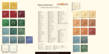 356 honig 424 kirsch matt 010 ofengrün 354 capri 341 honig geflammt 423 kirsch glänzend 121 altgrün 332 dunkelgrün matt 466 rusticblau Herdkacheln 355 atlantik 702 Kachel alabaster / Fase grün geschwammt 01/13/2,5 Einzigartige Auswahl, vollkommene Farben, alle Sommerhuber Glasuren auf einen Blick 703 Kachel alabaster / Fase blau geschwammt 426 rubin 340 grün geflammt 345 jagdgrün 573 rusticblau R.T. 362 enzian 010 ofengrün 374 topas dunkel 461 alabaster matt 121 altgrün 375 topas mittel 462 cashmere hell 210 sand 376 topas hell 463 cashmere mittel 212 cotto 378 mandarin mittel 464 cashmere dunkel 213 solnhofen 379 mandarin hell 466 rusticblau 215 ocker mittel 385 achat kräftig 477 taupe hell 216 granit dunkel 387 mandarin kräftig 478 taupe mittel 217 granit mittel 410 agave hell 479 taupe dunkel 218 rost 411 agave mittel 573 rusticblau R.T. 220 hanf hell 412 agave dunkel 580 florella 221 muskat 423 kirsch glänzend 583 siena 222 düne 424 kirsch matt 702 alabaster/grün geschwammt 223 granit hell 426 rubin 703 alabaster/blau geschwammt 224 torf dunkel 429 basalt hell 311 sahara 430 basalt mittel 312 navona 431 basalt dunkel 313 umbra 432 cacao mittel 314 cognac 433 cacao dunkel 317 prärie 436 sandstein mittel ... mit Struktur Terra 318 outback 437 dolomit 2108 sand 332 dunkelgrün matt 438 sandstein 2128 cotto 340 grün geflammt 442 feuer 2138 solnhofen 341 honig geflammt 443 erde 2158 ocker mittel 345 jagdgrün 446 kiesel 2168 granit dunkel 354 capri 448 graphit 2178 granit mittel 355 atlantik 449 lava 2188 rost 356 honig 450 schmelzweiß glänzend 2208 hanf hell 357 perla 451 alabaster glänzend 2218 muskat 362 enzian 453 schmelzweiß matt 2228 düne 371 achat dunkel 457 savanne hell 2238 granit hell 372 achat mittel 458 savanne mittel 2248 torf dunkel McRasch-Glasuren 011 jagdgrün 021 achat dunkel 026 topas hell 076 atlantik 012 rusticblau R.T. 022 achat mittel 028 mandarin mittel 077 perla 015 achat kräftig 024 topas dunkel 029 mandarin hell 017 mandarin kräftig 025 topas mittel 074 capri www.sommerhuber.com McRasch-Glasuren Glasurenübersicht 077 perla 026 topas hell 025 topas mittel 024 topas dunkel 022 achat mittel 021 achat dunkel 015 achat kräftig 029 mandarin hell 028 mandarin mittel 017 mandarin kräftig 076 atlantik 012 rusticblau R.T. 074 capri 011 jagdgrün 462 cashmere hell 463 cashmere mittel 464 cashmere dunkel 357 perla 438 sandstein 436 sandstein mittel 583 siena 453 schmelzweiß matt 477 taupe hell 478 taupe mittel 479 taupe dunkel 437 dolomit 376 topas hell 375 topas mittel 451 alabaster glänzend 410 agave hell 411 agave mittel 412 agave dunkel 372 achat mittel 461 alabaster matt 432 cacao mittel 433 cacao dunkel 313 umbra 457 savanne hell 429 basalt hell 430 basalt mittel 431 basalt dunkel 458 savanne mittel 446 kiesel 448 graphit 449 lava NaturGlasuren 450 schmelzweiß glänzend 222 düne 213 solnhofen 220 hanf hell 374 topas dunkel 221 muskat 215 ocker mittel 212 cotto 224 torf dunkel 371 achat dunkel 385 achat kräftig 218 rost 223 granit hell 217 granit mittel 216 granit dunkel 379 mandarin hell 378 mandarin mittel 387 mandarin kräftig 2108 sand 2228 düne 2138 solnhofen 2208 hanf hell 580 florella 442 feuer 443 erde 314 cognac 2218 muskat 2158 ocker mittel 2128 cotto 2248 torf dunkel 312 navona 311 sahara 317 prärie 318 outback 2188 rost 2238 granit hell 2178 granit mittel 2168 granit dunkel NaturGlasuren mit Struktur Terra 210 sand