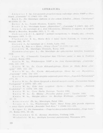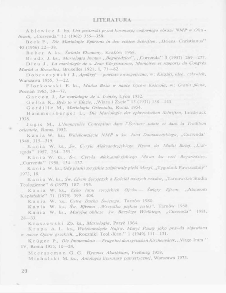 LITERATURA A b l e w i c z J. bp, List pasterski przed koronacją cudownego obrazu NMP w Oku licach, „Currenda” 12 (1962) 355- 358. B e c k E., Die Mariologie Ephrems in den echten Schriften, „Oriens Christianus” 40 (1956) 22- 38. B o b e r A. ks., Światła Ekumeny, Kraków 1968. B r u d ź J. ks., Mariologia hymnu „Bogurodzica”, „Currenda” 5 (1957) 269- 277. D i e u J., La mariologie de s. Jean Chrysostome, M émoires et rapports du Congrès Marial à Bruxelles, Bruxelles 1921, I, 71- 82. D o b r a c z y ń s k i J., Apokryf – powieść ewangeliczna, w: Książki, idee, człowiek. Warszawa 1955, 7- 22. F l o r k o w s k i E. ks., Matka Boża w nauce Ojców Kościoła, w: Gratia plena, Poznań 1965, 59- 77. G a r c o n J ., La mariologie de s. Irénée, Lyon 1932. G o ł b a K., Było to w Efezie, „W iara i Życie” 15 (1931) 138- 145 G o r d i 11e M., Mariologia Orientalis, Roma 1954. H a m m e r s b e r g e r L., Die Mariologie der ephremischen Schriften, Innsbruck 1938. J u g i e M., L'Immaculee Conception dans l ’Écriture sainte et dans la Tradition orientale, Roma 1952. K a n i a W. ks., Wniebowzięcie NM P u św. Jana Damasceńskiego, „Currenda” 1948, 315- 319. K a n i a W. ks., Św. Cyryla Aleksandryjskiego Hymn do M atki Bożej, „Cur renda" 1957, 254- 255. K a n i a W. ks., Św. Cyryla Aleksandryjskiego Mowa ku czci Bogarodzicy, „Currenda” 1958, 134- 137. K a n i a W. ks., Gdy piaski syryjskie zaśpiewały pieśń Maryi, „Tygodnik Powszechny” 1973, 18. K a n i a W. ks., Św. Efrem Syryjczyk a Kościół naszych czasów, „Tarnowskie Studia Teologiczne” 6 (1977) 187- 195. K a n i a W. ks., Echo lutni syryjskich Ojców – Święty Efrem, „Ateneum Kapłańskie” 71 (1979) 399- 408. K a n i a W. ks., Cytra Ducha Świętego, Tarnów 1980. K a n i a W. ks., Św. Efrema „ Wszystka piękna jesteś”, Tarnów 1980. K a n i a W. ks., Maryjne oblicze św. Bazylego Wielkiego, „Currenda” 1981, 28- 33. K r a s z e w s k i Zb. ks., Mariologia, Paryż 1964. K r u p a A. L. ks., Wniebowzięcie Najśw. Maryi Panny jako prawda objawiona w nauce Ojców greckich, „Roczniki Teol.-Kan.” 1 (1949) 111- 131. K r ü g e r P„ Die Immaculata – Frage bei den syrischen Kirchenväter, „Virgo Imm.” IV, Roma 1955, 10- 24. M e e r s s e m a n G. G. Hymnos Akathistos, Freiburg 1958. M i c h a l s k i M. ks., Antologia literatury patrystycznej, Warszawa 1975. 20 O r t i z d e U r bi n a I., Die Marienkunde in der Patristik des Ost ens, „Marien kunde” 1 (1927) 85- 118. P i e s z c z o c h Sz. ks., Mariologia, w: J. M. Szymusiak, M. Starowieyski, Słownik wczesnochrześcijańskiego piśmiennictwa, Poznań 1971, 559- 568. P r z y b y l s k i B. OP, De mariologia s. Irenaei, Roma 1937. Q u a s t e n J., Initiation aux Peres de l'Église, Paris 1963. R é a u L., Iconographie de l'art chrétien, Paris 1957. R i c c i o t t i G., Inni alla Vergine, Roma 1925. S m e r e k a W. ks., Najstarsza legenda o Matce Boskiej, „Ruch Biblijny i Litur giczny” 5 (1965) 262- 272. S t a r o w i e y s k i M. ks., Maria nom Eva in traditione Alexandrina et Antiochena saec. V, „M arianum” 24 (1972) 339- 349. S t a r o w i e y s k i M. ks., Mariologia św. Atanazego Wielkiego, „Roczniki Teol. -K an.” 33 (1975) 4, 109- 132. V a g a g g i n i C., Maria nelle opere di Origene, Romae 1942. Vé r i c e l M., Marie – Quand les Pères parlent de la Vierge, Paris 1960. V o n a C., Elementi apocrifi e popolari nella omiletica mariana antica, „Eunt. Dec.” 10 (1956) 51- 65. W a s i l k o w s k i L. ks., Św. Cyryl Aleksandryjski o Boskim Macierzyństwie N M P , „A te neum Kapł.” 28 (1931) 219. WYKAZ SKRÓTÓW AAS — „Acta Apostolicae Sedis” As Op Gr — J. S. Assemani, S. Ephraem Opera, quae exstant graece As Op S y r — J. S. Assemani, S. Ephraem Opera, quae exstant syriace BHP— Bibliotheke Hellenon Pateron CSCO— Corpus Scriptorum Christianorum Orientalium EP — M. J. Rouët de Journel, Enchiridion Patristicum LA— Th. Lamy, S. Ephraemi hymni et sermones PG — J. R. Migne, Patrologia Graeca POK — Pisma Ojców Kościoła PSP— Pisma starochrześcijańskich pisarzy SC— Sources Chrétiemes ZDMG — Zeitschrift der deutschen morgenländischen Gesellschaft 21