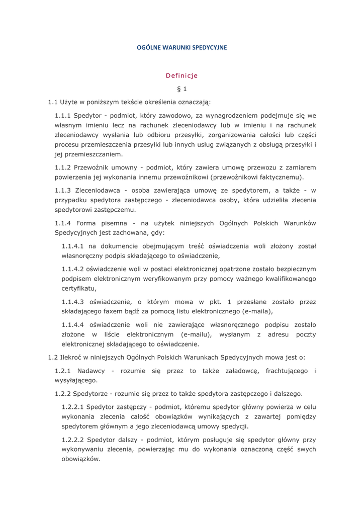 OGÓLNE WARUNKI SPEDYCYJNE D efi n i cj e §1 1.1 Użyte w poniższym tekście określenia oznaczają: 1.1.1 Spedytor - podmiot, który zawodowo, za wynagrodzeniem podejmuje się we własnym imieniu lecz na rachunek zleceniodawcy lub w imieniu i na rachunek zleceniodawcy wysłania lub odbioru przesyłki, zorganizowania całości lub części procesu przemieszczenia przesyłki lub innych usług związanych z obsługą przesyłki i jej przemieszczaniem. 1.1.2 Przewoźnik umowny - podmiot, który zawiera umowę przewozu z zamiarem powierzenia jej wykonania innemu przewoźnikowi (przewoźnikowi faktycznemu). 1.1.3 Zleceniodawca - osoba zawierająca umowę ze spedytorem, a także - w przypadku spedytora zastępczego - zleceniodawca osoby, która udzieliła zlecenia spedytorowi zastępczemu. 1.1.4 Forma pisemna - na użytek niniejszych Ogólnych Polskich Warunków Spedycyjnych jest zachowana, gdy: 1.1.4.1 na dokumencie obejmującym treść oświadczenia woli złożony został własnoręczny podpis składającego to oświadczenie, 1.1.4.2 oświadczenie woli w postaci elektronicznej opatrzone zostało bezpiecznym podpisem elektronicznym weryfikowanym przy pomocy ważnego kwalifikowanego certyfikatu, 1.1.4.3 oświadczenie, o którym mowa w pkt. 1 przesłane zostało przez składającego faxem bądź za pomocą listu elektronicznego (e-maila), 1.1.4.4 oświadczenie woli nie zawierające własnoręcznego podpisu zostało złożone w liście elektronicznym (e-mailu), wysłanym z adresu poczty elektronicznej składającego to oświadczenie. 1.2 Ilekroć w niniejszych Ogólnych Polskich Warunkach Spedycyjnych mowa jest o: 1.2.1 Nadawcy - rozumie się przez to także załadowcę, frachtującego i wysyłającego. 1.2.2 Spedytorze - rozumie się przez to także spedytora zastępczego i dalszego. 1.2.2.1 Spedytor zastępczy - podmiot, któremu spedytor główny powierza w celu wykonania zlecenia całość obowiązków wynikających z zawartej pomiędzy spedytorem głównym a jego zleceniodawcą umowy spedycji. 1.2.2.2 Spedytor dalszy - podmiot, którym posługuje się spedytor główny przy wykonywaniu zlecenia, powierzając mu do wykonania oznaczoną część swych obowiązków. Pr z ep i sy og ól n e §2 2.1 Ogólne Polskie Warunki Spedycyjne (zwane dalej) mają zastosowanie w stosunkach pomiędzy spedytorem a jego zleceniodawcą, a w przypadku spedytora zastępczego także pomiędzy nim a zleceniodawcą osoby, która udzieliła spedytorowi zastępczemu zlecenia - jeśli przynajmniej jedna ze stron jest członkiem Polskiej Izby Spedycji i Logistyki. 2.2 OPWS stosuje się także w każdym przypadku zaangażowania odpowiedzialności cywilnej spedytora, w tym również z tytułu czynów niedozwolonych w zakresie, w jakim nie sprzeciwia się to przepisom bezwzględnie obowiązującym. §3 3.1 Do innych czynności związanych z przewozem, które mogą być wykonywane przez spedytora, zalicza się takie czynności jak: poradnictwo transportowe, ubezpieczenie, przeładunek, składowanie, pakowanie, konfekcjonowanie, organizacja obsługi celnej, dystrybucja, logistyczne i inne temu podobne.. 3.2 W odniesieniu do umowy spedycji zawartej przez spedytora, zastosowanie będą również miały ogólne warunki bądź regulaminy świadczenia usług, jeżeli ich stosowanie w danej dziedzinie działalności jest powszechnie przyjęte lub jeżeli zawarcie umowy z podwykonawcą wymagało włączenia do treści tej umowy stosowanego przez drugą stronę wzorca umownego. §4 4.1 Spedytor może sam dokonać przewozu. W tym przypadku ma jednocześnie prawa i obowiązki przewoźnika. 4.2 Spedytor, zawierając umowę przewozu, jest przewoźnikiem umownym, jeśli nie korzysta z własnych środków transportu. 4.3 Spedytor, który samodzielnie wykonuje usługi, o których mowa w punkcie 3.1 powyżej, w relacjach ze zleceniodawcą odpowiada na podstawie powszechnie obowiązujących przepisów prawa, znajdujących zastosowanie do danego rodzaju usługi, z zastrzeżeniem ograniczeń odpowiedzialności, o których mowa w § 22 i § 23 niniejszych OPWS. §5 Postanowienia niniejszych OPWS nie mają zastosowania do spedycji pieniędzy, dzieł sztuki i szczątków ludzkich. O f er t y §6 6.1 Złożona przez spedytora oferta obejmuje tylko te czynności, które są w niej wymienione i zachowuje ważność w określonym w niej terminie. 6.2 Oferta spedytora i uzgodnienia dotyczące stawek i usług (własnych lub osób trzecich) odnoszą się tylko do towarów określonych w zleceniu oraz zakładają typowe, niezakłócone warunki jego realizacji. 6.3 W przypadku braku wskazania terminu ich obowiązywania, każda oferta lub kwotowanie zachowuje ważność tylko w razie ich niezwłocznego potwierdzenia przez zleceniodawcę w zleceniu, które ma być realizowane niezwłocznie po jego złożeniu, chyba że strony inaczej postanowiły. 6.4 W przypadku zmiany któregokolwiek elementu oferty, zaistniałej z przyczyn zewnętrznych, niezależnych od spedytora, podane lub uzgodnione ceny będą odpowiednio korygowane ze skutkiem od chwili, gdy zmiana ta wystąpiła. Korekta oferty, wynikająca ze zmiany któregokolwiek jej elementu z przyczyn leżących po stronie spedytora, wymaga zgody zleceniodawcy. 6.5 W braku innych uzgodnień, oferta spedytora zawiera wszystkie koszty ponoszone przez spedytora podczas niezakłóconego przebiegu procesu spedycyjnego, za wyjątkiem wszelkiego typu kosztów przestoju, które, jeżeli nie zawinione przez spedytora, zleceniodawca zobowiązany jest odrębnie zapłacić spedytorowi w wysokości nałożonej na spedytora przez osoby trzecie. Um ow a sp ed y cj i §7 7.1 Przez umowę spedycji spedytor zobowiązuje się za wynagrodzeniem, w zakresie działalności swego przedsiębiorstwa, do wysłania lub odbioru przesyłki albo do dokonania innych usług związanych z jej przewozem. 7.2 Umowę spedycji uważa się za zawartą z chwilą otrzymania przez spedytora zlecenia spedycyjnego, jeżeli jego postanowienia, wraz 