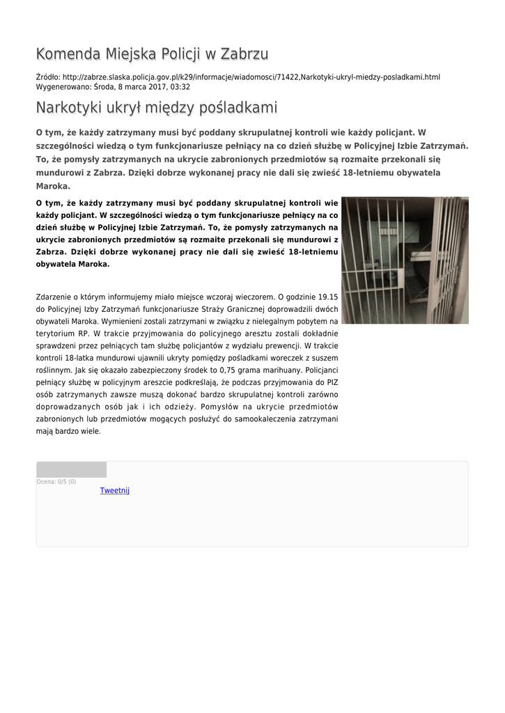 Komenda Miejska Policji w Zabrzu Źródło: http://zabrze.slaska.policja.gov.pl/k29/informacje/wiadomosci/71422,Narkotyki-ukryl-miedzy-posladkami.html Wygenerowano: Środa, 8 marca 2017, 03:32 Narkotyki ukrył między pośladkami O tym, że każdy zatrzymany musi być poddany skrupulatnej kontroli wie każdy policjant. W szczególności wiedzą o tym funkcjonariusze pełniący na co dzień służbę w Policyjnej Izbie Zatrzymań. To, że pomysły zatrzymanych na ukrycie zabronionych przedmiotów są rozmaite przekonali się mundurowi z Zabrza. Dzięki dobrze wykonanej pracy nie dali się zwieść 18-letniemu obywatela Maroka. O tym, że każdy zatrzymany musi być poddany skrupulatnej kontroli wie każdy policjant. W szczególności wiedzą o tym funkcjonariusze pełniący na co dzień służbę w Policyjnej Izbie Zatrzymań. To, że pomysły zatrzymanych na ukrycie zabronionych przedmiotów są rozmaite przekonali się mundurowi z Zabrza. Dzięki dobrze wykonanej pracy nie dali się zwieść 18-letniemu obywatela Maroka. Zdarzenie o którym informujemy miało miejsce wczoraj wieczorem. O godzinie 19.15 do Policyjnej Izby Zatrzymań funkcjonariusze Straży Granicznej doprowadzili dwóch obywateli Maroka. Wymienieni zostali zatrzymani w związku z nielegalnym pobytem na terytorium RP. W trakcie przyjmowania do policyjnego aresztu zostali dokładnie sprawdzeni przez pełniących tam służbę policjantów z wydziału prewencji. W trakcie kontroli 18-latka mundurowi ujawnili ukryty pomiędzy pośladkami woreczek z suszem roślinnym. Jak się okazało zabezpieczony środek to 0,75 grama marihuany. Policjanci pełniący służbę w policyjnym areszcie podkreślają, że podczas przyjmowania do PIZ osób zatrzymanych zawsze muszą dokonać bardzo skrupulatnej kontroli zarówno doprowadzanych osób jak i ich odzieży. Pomysłów na ukrycie przedmiotów zabronionych lub przedmiotów mogących posłużyć do samookaleczenia zatrzymani mają bardzo wiele. Ocena: 0/5 (0) Tweetnij