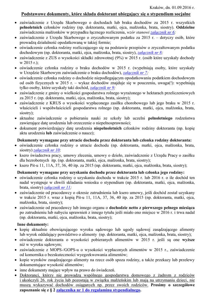 Kraków, dn. 01.09.2016 r. Podstawowe dokumenty, które składa doktorant ubiegający się o stypendium socjalne zaświadczenie z Urzędu Skarbowego o dochodach lub braku dochodów za 2015 r. wszystkich pełnoletnich członków rodziny (np. doktoranta, matki, ojca, małżonka, brata, siostry). Oddzielne zaświadczenia małżonków w przypadku łącznego rozliczenia, wzór stanowi załącznik nr 6; zaświadczenie z Urzędu Skarbowego o zryczałtowanym podatku za 2015 r. – dotyczy osób, które prowadzą działalność opodatkowaną w takiej formie; oświadczenie członka rodziny rozliczającego się na podstawie przepisów o zryczałtowanym podatku dochodowym (np. doktoranta, matki, ojca, małżonka, brata, siostry), załącznik nr 8; zaświadczenie z ZUS o wysokości składki zdrowotnej (9%) w 2015 r. (osób które uzyskały dochody w 2015 r.); oświadczenie członka rodziny o braku dochodów w 2015 r. (wypełniają osoby, które uzyskały w Urzędzie Skarbowym zaświadczenie o braku dochodów), załącznik nr 7; oświadczenie członka rodziny o dochodzie niepodlegającym opodatkowaniu podatkiem dochodowym od osób fizycznych w 2015 r. – wykaz dochodów znajduje się w pouczeniu, uwaga(!): wypełniają tylko osoby, które uzyskały taki dochód, załącznik nr 9; zaświadczenie z gminy o wielkości gospodarstwa rolnego wyrażonego w hektarach przeliczeniowych za 2015 r. (np. doktoranta, matki, ojca, małżonka, brata, siostry); zaświadczenie z KRUS o wysokości wypłaconego zasiłku chorobowego lub jego braku w 2015 r. właścicieli i współwłaścicieli gospodarstwa rolnego (np. doktoranta, matki, ojca, małżonka, brata, siostry); aktualne zaświadczenie o pobieraniu nauki ze szkoły lub uczelni pełnoletniego rodzeństwa zawierające datę urodzenia lub orzeczenie o niepełnosprawności; dokument potwierdzający datę urodzenia niepełnoletnich członków rodziny doktoranta (np. kopię aktu urodzenia lub zaświadczenie o nauce); Dokumenty wymagane przy utracie dochodu przez doktoranta lub członka rodziny doktoranta: oświadczenie członka rodziny o utracie dochodu (np. doktoranta, matki, ojca, małżonka, brata, siostry) załącznik nr 10; ksero świadectwa pracy, umowy zlecenia, umowy o dzieło, zaświadczenie z Urzędu Pracy o zasiłku dla bezrobotnych itp. (np. doktoranta, matki, ojca, małżonka, brata, siostry); ksero Pit-u 11, 11A, 37, 36, 40 itp. za 2015 (np. doktoranta, matki, ojca, małżonka, brata, siostry); Dokumenty wymagane przy uzyskaniu dochodu przez doktoranta lub członka jego rodziny: oświadczenie członka rodziny o uzyskaniu dochodu w trakcie 2015 r. lub 2016 r. o ile dochód ten nadal występuje w chwili składania wniosku o stypendium (np. doktoranta, matki, ojca, małżonka, brata, siostry) załącznik nr 11; zaświadczenie od pracodawcy o okresie zatrudnienia lub ksero umowy, jeśli dochód został uzyskany w trakcie 2015 r. wraz z kopią Pit-u 11, 11A, 37, 36, 40 itp. za 2015 (np. doktoranta, matki, ojca, małżonka, brata, siostry); zaświadczenie od pracodawcy lub innego organu o dochodzie netto z pierwszego pełnego miesiąca po zatrudnieniu lub nabyciu uprawnień z innego tytułu jeśli miało ono miejsce w 2016 r. i trwa nadal (np. doktoranta, matki, ojca, małżonka, brata, siostry); Inne dokumenty: kopię aktualnie obowiązującego wyroku sądowego lub ugody sądowej zasądzającego alimenty lub wyrok oddalający powództwo o alimenty (np. doktoranta, matki, ojca, małżonka, brata, siostry); oświadczenie doktoranta o wysokości pobieranych alimentów w 2015 r. jeśli są one wyższe niż w wyroku sądowym; zaświadczenie z MOPS-/GOPS-u o wysokości wypłaconych alimentów w 2015 r., zaświadczenie od komornika o bezskuteczności wyegzekwowania alimentów; kopie wyroków zasądzającego alimenty na rzecz osób spoza rodziny, a także przekazy lub przelewy dokumentujące wysokość alimentów; inne dokumenty mające wpływ na prawo do świadczeń. Doktoranci, którzy nie prowadzą wspólnego gospodarstwa domowego z żadnym z rodziców i ukończyli 26. rok życia lub pozostają w związku małżeńskim lub mają na utrzymaniu dzieci, nie muszą wykazywać dochodów osiąganych np. przez swoich rodziców. Prosimy o szczegółowe zapoznanie się z § 2 załącznika nr 1 do regulaminu stypendialnego.