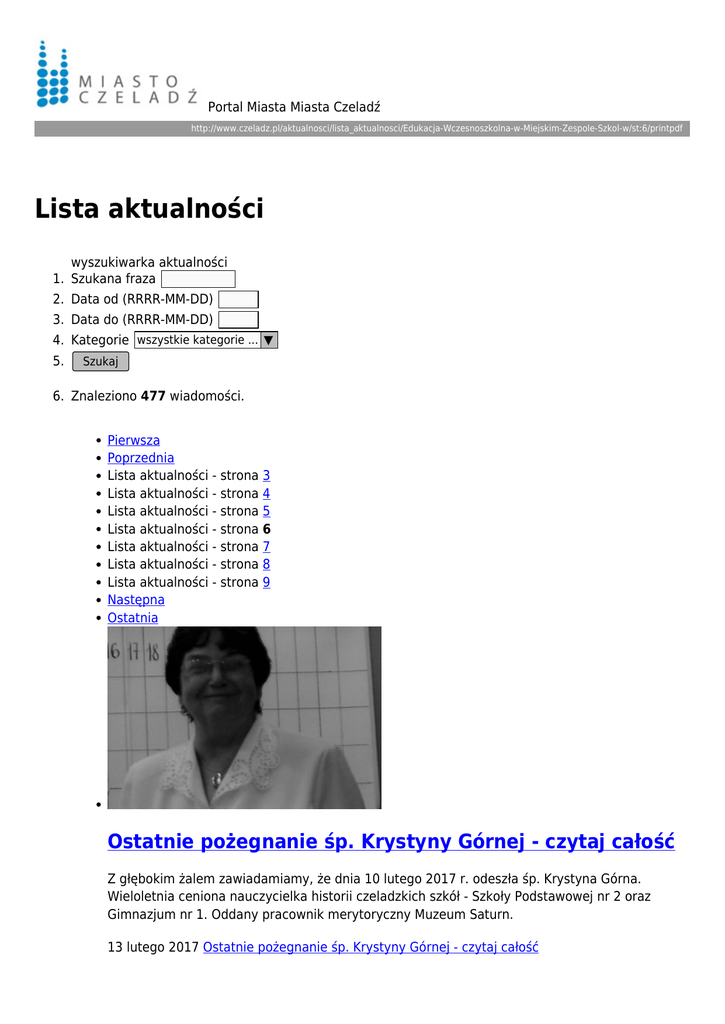 Portal Miasta Miasta Czeladź http://www.czeladz.pl/aktualnosci/lista_aktualnosci/Edukacja-Wczesnoszkolna-w-Miejskim-Zespole-Szkol-w/st:6/printpdf Lista aktualności wyszukiwarka aktualności 1. Szukana fraza 2. Data od (RRRR-MM-DD) 3. Data do (RRRR-MM-DD) 4. Kategorie wszystkie kategorie ... ▼ 5. Szukaj 6. Znaleziono 477 wiadomości. Pierwsza Poprzednia Lista aktualności - strona 3 Lista aktualności - strona 4 Lista aktualności - strona 5 Lista aktualności - strona 6 Lista aktualności - strona 7 Lista aktualności - strona 8 Lista aktualności - strona 9 Następna Ostatnia Ostatnie pożegnanie śp. Krystyny Górnej - czytaj całość Z głębokim żalem zawiadamiamy, że dnia 10 lutego 2017 r. odeszła śp. Krystyna Górna. Wieloletnia ceniona nauczycielka historii czeladzkich szkół - Szkoły Podstawowej nr 2 oraz Gimnazjum nr 1. Oddany pracownik merytoryczny Muzeum Saturn. 13 lutego 2017 Ostatnie pożegnanie śp. Krystyny Górnej - czytaj całość Powiadomienie o jakości powietrza w województwie śląskim - czytaj całość Wojewódzki Inspektorat Ochrony Środowiska informuje o jakości powietrza w województwie śląskim w dniach 09-11.02.2017 r. 10 lutego 2017 Powiadomienie o jakości powietrza w województwie śląskim - czytaj całość Powiadomienie o jakości powietrza w województwie śląskim - czytaj całość Wojewódzki Inspektorat Ochrony Środowiska informuje o jakości powietrza w dniach 08-10.02.2017 r. 09 lutego 2017 Powiadomienie o jakości powietrza w województwie śląskim - czytaj całość Zimowe zajęcia dla dzieci - czytaj całość Miejska Biblioteka Publiczna serdecznie zaprasza dzieci w wieku 4-8 lat na kolejne zajęcia z cyklu Czytanki-niespodzianki pt. Zima u Królowej Śniegu. 09 lutego 2017 Zimowe zajęcia dla dzieci - czytaj całość Powiadomienie o jakości powietrza w województwie śląskim - czytaj całość Wojewódzki Inspektorat Ochrony Środowiska w Katowicach informuje o jakości powietrza w województwie śląskim w dniach 07.02.-09.02.2017 r. 08 lutego 2017 Powiadomienie o jakości powietrza w województwie śląskim - czytaj całość Powiadomienie o jakości powietrza w województwie śląskim - czytaj całość Wojewódzki Inspektorat Ochrony Środowiska w Katowicach informuje o jakości powietrza w województwie śląskim w dniach 05.02.-08.02.2017 r. 07 lutego 2017 Powiadomienie o jakości powietrza w województwie śląskim - czytaj całość Ostrzeżenie meteorologiczne Nr 30 - marznące opady czytaj całość IMGW-PIB Centralne Biuro Prognoz Meteorologicznych w Krakowie ostrzega przed marznącymi opadami. 07 lutego 2017 Ostrzeżenie meteorologiczne Nr 30 - marznące opady - czytaj całość Jubileusze małżeńskie - czytaj całość 3 lutego 2017 roku w Muzeum Saturn 13 par małżeńskich naszego miasta świętowało Złote i Diamentowe Gody. 06 lutego 2017 Jubileusze małżeńskie - czytaj całość Zmiany w ustawie o ochronie przyrody - czytaj całość 1 stycznia 2017 roku zmianie uległy regulacje w ustawie o ochronie przyrody, określające m.in. przepisy dotyczące wydawania zezwoleń na usuwanie drzew i krzewów oraz wskazujące przypadki, które nie wymagają wydawania takich zezwoleń. 06 lutego 2017 Zmiany w ustawie o ochronie przyrody - czytaj całość Bezpłatne czipowanie psów - czytaj całość Miasto Czeladź w 2017 r. nadal prowadzi akcję bezpłatnego czipowania psów. Właściciele czworonogów – mieszkańcy Czeladzi - mogą zgłaszać się do jednego z dwóch wytypowanych gabinetów i przychodni weterynaryjnych na terenie miasta. 06 lutego 2017 Bezpłatne czipowanie psów - czytaj całość Pierwsza Poprzednia Lista aktualności - strona 3 Lista aktualności - strona 4 Lista aktualności - strona 5 Lista aktualności - strona 6 Lista aktualności - strona 7 Lista aktualności - strona 8 Lista aktualności - strona 9 Następna Ostatnia