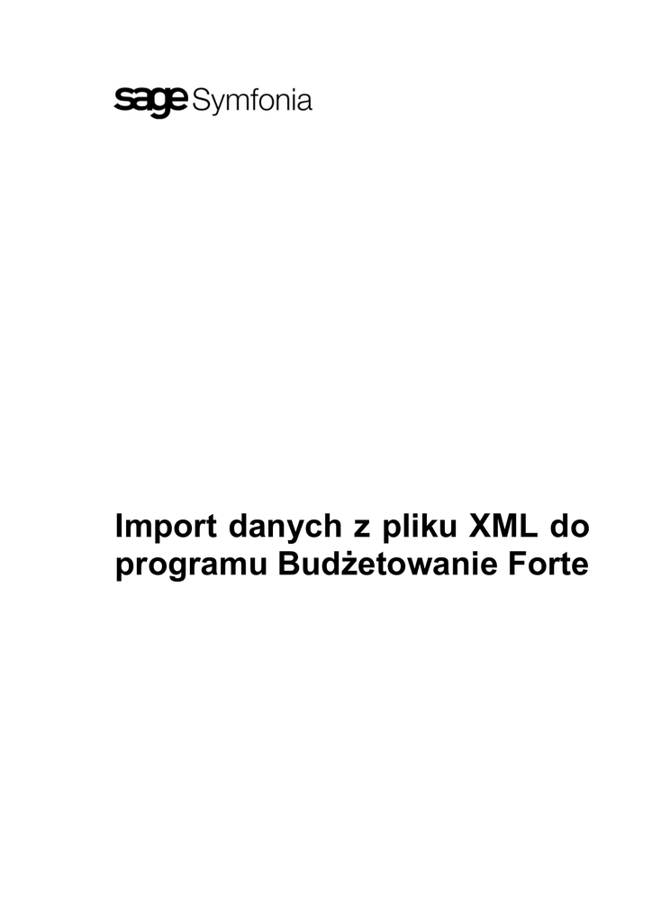 Import danych z pliku XML do programu Budżetowanie Forte Powielanie w jakiejkolwiek formie całości lub fragmentów podręcznika bez pisemnej zgody firmy Sage Symfonia Sp. z o.o. jest zabronione. Copyright© Sage Symfonia Sp. z o.o. Wszelkie prawa zastrzeżone. All Rights Reserved. Windows™ jest znakiem towarowym firmy Microsoft Corporation. Microsoft® SQL Server™ jest znakiem towarowym firmy Microsoft Corporation. Adobe, Acrobat, Acrobat Reader, Acrobat Distiller są zastrzeżonymi znakami towarowymi firmy Adobe Systems Inc. Opracowanie i skład: Sage Symfonia Sp. z o.o. Warszawa, styczeń 2008 Symbol dokumentu MXBUFV2007P0001 Spis treści Spis treści I Opis formatu.................................................................................................................................................... 0-1 Korzeń dokumentu ........................................................................................................................................ 0-1 Symbole czy Guid-y ...................................................................................................................................... 0-1 Typ wielkości budżetowej ............................................................................................................................. 0-1 Wielkości budżetowe..................................................................................................................................... 0-3 Atrybuty......................................................................................................................................................... 0-4 Opis formatu Korzeń dokumentu Każdy plik XML musi mieć następującą strukturę, a importowane dane muszą zawierać się w elemencie: ‘mxBCImport’ podanym z parametrem ‘xmlns="SageSymfonia”’: <?xml version="1.0" encoding="utf-8" ?> <mxBCImport xmlns="SageSymfonia"> … … … </mxBCImport> Symbole czy Guid-y Następnie musimy sprecyzować czy ustawiając parametry mapowania odwołujemy się poprzez symbole czy guid-y Guid (Globally Unique Identifier) – jest używany w tym przypadku jako unikalny identyfikator w bazie danych. .Jeżeli odwołujemy się poprzez symbole nasz dokument powinien wyglądać następująco: <?xml version="1.0" encoding="utf-8" ?> <mxBCImport xmlns="SageSymfonia"> <mxBCValuesBySymbols> … … … </mxBCValuesBySymbols> </mxBCImport> Jeżeli odwołujemy się poprzez identyfikatory nasz dokument powinien wyglądać następująco: <?xml version="1.0" encoding="utf-8" ?> <mxBCImport xmlns="SageSymfonia"> <mxBCValuesByGuids> … … … </mxBCValuesByGuids> </mxBCImport> Typ wielkości budżetowej Musimy określić typy wielkości budżetowych poprzez element ‘mxBCValue’ z parametrem Symbol lub Id: 0–2 Import danych z pliku XML do programu Budżetowanie Forte Budżetowanie Forte Jeżeli odwołujemy się poprzez symbole nasz dokument powinien wyglądać następująco: <?xml version="1.0" encoding="utf-8" ?> <mxBCImport xmlns="SageSymfonia"> <mxBCValuesBySymbols> <mxBCValue Symbol="Sprzedaz_towaru"> … … … </mxBCValue> </mxBCValuesBySymbols> </mxBCImport> Gdzie ‘Symbol’ jest symbolem typu wielkości budżetowej. Jeżeli odwołujemy się poprzez guid-y nasz dokument powinien wyglądać następująco: <?xml version="1.0" encoding="utf-8" ?> <mxBCImport xmlns="SageSymfonia"> <mxBCValuesByGuids> <mxBCValue Id="E89BEAC6-E187-4dd8-9054-76022510FE82"> … … … </mxBCValue> </mxBCValuesByGuids> </mxBCImport> Gdzie ‘Id’ jest identyfikatorem typu wielkości budżetowej. W jednym pliku możemy dokonywać importu do wielu różnych typów wielkości budżetowych. Na przykład: <?xml version="1.0" encoding="utf-8" ?> <mxBCImport xmlns="SageSymfonia"> <mxBCValuesBySymbols> <mxBCValue Symbol="Sprzedaz_towaru"> … … … </mxBCValue> <mxBCValue Symbol="Zakup_towaru"> … … … MXBUFV2007P0001 Import danych z pliku XML do programu Budżetowanie Forte 0–3 </mxBCValue> </mxBCValuesBySymbols> </mxBCImport> Wielkości budżetowe Wielkości budżetowe wybieramy poprzez element: ‘SimpleValue’, który posiada parametry przedstawione w tabeli. Parametr Value ValDate Opis Wartość Data, do której przypisywana jest wprowadzana wartość. Data wprowadzenia lub zmodyfikowania wartości. Ten parametr jest na razie pomijany. Być może będzie używany w przyszłości. Identyfikator dokumentu, z którego pochodzi wartość. Numer dokumentu, z którego pochodzi wartość. Timestemp DocId DocNr Czy wymagany? Tak Tak Nie Nie Nie Tabela1 Atrybuty elementu ‘SimpleValue’ Przykład: <?xml version="1.0" encoding="utf-8" ?> <mxBCImport xmlns="SageSymfonia"> <mxBCValuesBySymbols> <mxBCValue Symbol="Sprzedaz_towaru"> <SimpleValue Value="100" ValDate="2007-03-20T00:00:00" DocId="65557" DocNr="0001/07/FVS"> … … … </SimpleValue> <SimpleValue Value="200" ValDate="2007-03-20T00:00:00" DocId="65557" DocNr="0001/07/FVS"> … … 0–4 Import danych z pliku XML do programu Budżetowanie Forte Budżetowanie Forte … </SimpleValue> </mxBCValue> </mxBCValuesBySymbols> </mxBCImport> Atrybuty Atrybuty dla każdej wielkości budżetowej wybieramy poprzez element ValAttribute, który charakteryzuje się następującymi cechami: • • w przypadku odwołania poprzez symbole posiada parametry: o ElementSymbol – symbol elementu słownika o DimensionSymbol – symbol kategorii budżetowej w przypadku odwołania poprzez guid-y posiada parametry: o ElementGuid – guid elementu słownika o DimensionGuid – guid kategorii budżetowej Przykład z odwołaniami poprzez symbole: <?xml version="1.0" encoding="utf-8" ?> <mxBCImport xmlns="SageSymfonia"> <mxBCValuesBySymbols> <mxBCValue Symbol="Sprzedaz_towaru"> <SimpleValue Value="100" ValDate="2007-03-20T00:00:00" DocId="65557" DocNr="0001/07/FVS"> <ValAttribute ElementSymbol="Szczecin" DimensionSymbol="Osrodki_odpowiedzialnosci" /> <ValAttribute ElementSymbol="towary" DimensionSymbol="marchewka" /> </SimpleValue> <Simp