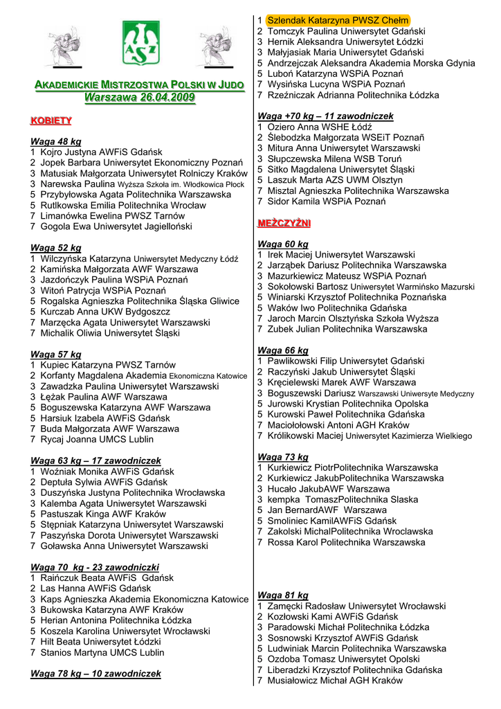 A ADEMICKIE M STRZOSTWA P LSKI W DO AKKADEMICKIE MIISTRZOSTWA POOLSKI W JJU UDO 2 6 . 0 4 . 2 0 0 9 W a r s z a w a Warszawa 26.04.2009 K KO OB BIIEETTYY Waga 48 kg 1 Kojro Justyna AWFiS Gdańsk 2 Jopek Barbara Uniwersytet Ekonomiczny Poznań 3 Matusiak Małgorzata Uniwersytet Rolniczy Kraków 3 Narewska Paulina Wyższa Szkoła im. Włodkowica Płock 5 Przybyłowska Agata Politechnika Warszawska 5 Rutlkowska Emilia Politechnika Wrocław 7 Limanówka Ewelina PWSZ Tarnów 7 Gogola Ewa Uniwersytet Jagielloński 1 2 3 3 5 5 7 7 Szlendak Katarzyna PWSZ Chełm Tomczyk Paulina Uniwersytet Gdański Hernik Aleksandra Uniwersytet Łódzki Małyjasiak Maria Uniwersytet Gdański Andrzejczak Aleksandra Akademia Morska Gdynia Luboń Katarzyna WSPiA Poznań Wysińska Lucyna WSPiA Poznań Rzeźniczak Adrianna Politechnika Łódzka Waga +70 kg – 11 zawodniczek 1 Oziero Anna WSHE Łódź 2 Ślebodzka Małgorzata WSEiT Poznañ 3 Mitura Anna Uniwersytet Warszawski 3 Słupczewska Milena WSB Toruń 5 Sitko Magdalena Uniwersytet Śląski 5 Laszuk Marta AZS UWM Olsztyn 7 Misztal Agnieszka Politechnika Warszawska 7 Sidor Kamila WSPiA Poznań M MĘĘŻŻC CZZYYŹŹN NII Waga 52 kg 1 Wilczyńska Katarzyna Uniwersytet Medyczny Łódź 2 Kamińska Małgorzata AWF Warszawa 3 Jazdończyk Paulina WSPiA Poznań 3 Witoń Patrycja WSPiA Poznań 5 Rogalska Agnieszka Politechnika Śląska Gliwice 5 Kurczab Anna UKW Bydgoszcz 7 Marzęcka Agata Uniwersytet Warszawski 7 Michalik Oliwia Uniwersytet Śląski Waga 60 kg 1 Irek Maciej Uniwersytet Warszawski 2 Jarząbek Dariusz Politechnika Warszawska 3 Mazurkiewicz Mateusz WSPiA Poznań 3 Sokołowski Bartosz Uniwersytet Warmińsko Mazurski 5 Winiarski Krzysztof Politechnika Poznańska 5 Waków Iwo Politechnika Gdańska 7 Jaroch Marcin Olsztyńska Szkoła Wyższa 7 Zubek Julian Politechnika Warszawska Waga 57 kg 1 Kupiec Katarzyna PWSZ Tarnów 2 Korfanty Magdalena Akademia Ekonomiczna Katowice 3 Zawadzka Paulina Uniwersytet Warszawski 3 Łężak Paulina AWF Warszawa 5 Boguszewska Katarzyna AWF Warszawa 5 Harsiuk Izabela AWFiS Gdańsk 7 Buda Małgorzata AWF Warszawa 7 Rycaj Joanna UMCS Lublin Waga 66 kg 1 Pawlikowski Filip Uniwersytet Gdański 2 Raczyński Jakub Uniwersytet Śląski 3 Kręcielewski Marek AWF Warszawa 3 Boguszewski Dariusz Warszawski Uniwersyte Medyczny 5 Jurowski Krystian Politechnika Opolska 5 Kurowski Paweł Politechnika Gdańska 7 Maciołołowski Antoni AGH Kraków 7 Królikowski Maciej Uniwersytet Kazimierza Wielkiego Waga 63 kg – 17 zawodniczek 1 Woźniak Monika AWFiS Gdańsk 2 Deptuła Sylwia AWFiS Gdańsk 3 Duszyńska Justyna Politechnika Wrocławska 3 Kalemba Agata Uniwersytet Warszawski 5 Pastuszak Kinga AWF Kraków 5 Stępniak Katarzyna Uniwersytet Warszawski 7 Paszyńska Dorota Uniwersytet Warszawski 7 Goławska Anna Uniwersytet Warszawski Waga 73 kg 1 Kurkiewicz PiotrPolitechnika Warszawska 2 Kurkiewicz JakubPolitechnika Warszawska 3 Hucało JakubAWF Warszawa 3 kempka TomaszPolitechnika Slaska 5 Jan BernardAWF Warszawa 5 Smoliniec KamilAWFiS Gdańsk 7 Zakolski MichalPolitechnika Wroclawska 7 Rossa Karol Politechnika Warszawska Waga 70 kg - 23 zawodniczki 1 Raińczuk Beata AWFiS Gdańsk 2 Las Hanna AWFiS Gdańsk 3 Kaps Agnieszka Akademia Ekonomiczna Katowice 3 Bukowska Katarzyna AWF Kraków 5 Herian Antonina Politechnika Łódzka 5 Koszela Karolina Uniwersytet Wrocławski 7 Hilt Beata Uniwersytet Łódzki 7 Stanios Martyna UMCS Lublin Waga 78 kg – 10 zawodniczek Waga 81 kg 1 Zamęcki Radosław Uniwersytet Wrocławski 2 Kozłowski Kami AWFiS Gdańsk 3 Paradowski Michał Politechnika Łódzka 3 Sosnowski Krzysztof AWFiS Gdańsk 5 Ludwiniak Marcin Politechnika Warszawska 5 Ozdoba Tomasz Uniwersytet Opolski 7 Liberadzki Krzysztof Politechnika Gdańska 7 Musiałowicz Michał AGH Kraków Akademicie Mistrzostwa Polski - Kobiety Apr 26, 2009 Women 78 kg Competitors: 10 Hernik A. Hernik Aleksandra Uniwersytet Łódzki, Hernik A. Hernik A. Samczuk Paulina Uniwersytet Białystok, Hernik A. Małyjasiak M. Wysińska L. Andrzejczak A. Małyjasiak Maria Uniwersytet Gdański, Szlendak K. Wysińska Lucyna WSPiA Poznań, 1 Szlendak Katarzyna PWSZ Chełm Szlendak K. 2 Tomczyk Paulina Szlendak Katarzyna Uniwersytet Gdański PWSZ Chełm, 3 Hernik Aleksandra Szlendak K. Gazda Małgorzata Uniwersytet Jagielloński, Uniwersytet Gdański Luboń K. 5 Andrzejczak Aleksandra Akademia Morska Gdynia Luboń Katarzyna WSPiA Poznań, Uniwersytet Łódzki 3 Małyjasiak Maria 5 Luboń Katarzyna Tomczyk P. WSPiA Poznań 7 Wysińska Lucyna WSPiA Poznań Tomczyk Paulina 7 Rzeźniczak Adrianna Uniwersytet Gdański, Politechnika Łódzka Tomczyk P. Rzeźniczak Adrianna Politechnika Łódzka, Andrzejczak A. Andrzejczak Aleksandra Akademia Morska Gdynia, Luboń K. Luboń K. Małyjasiak M. Rzeźniczak A. Małyjasiak M.
