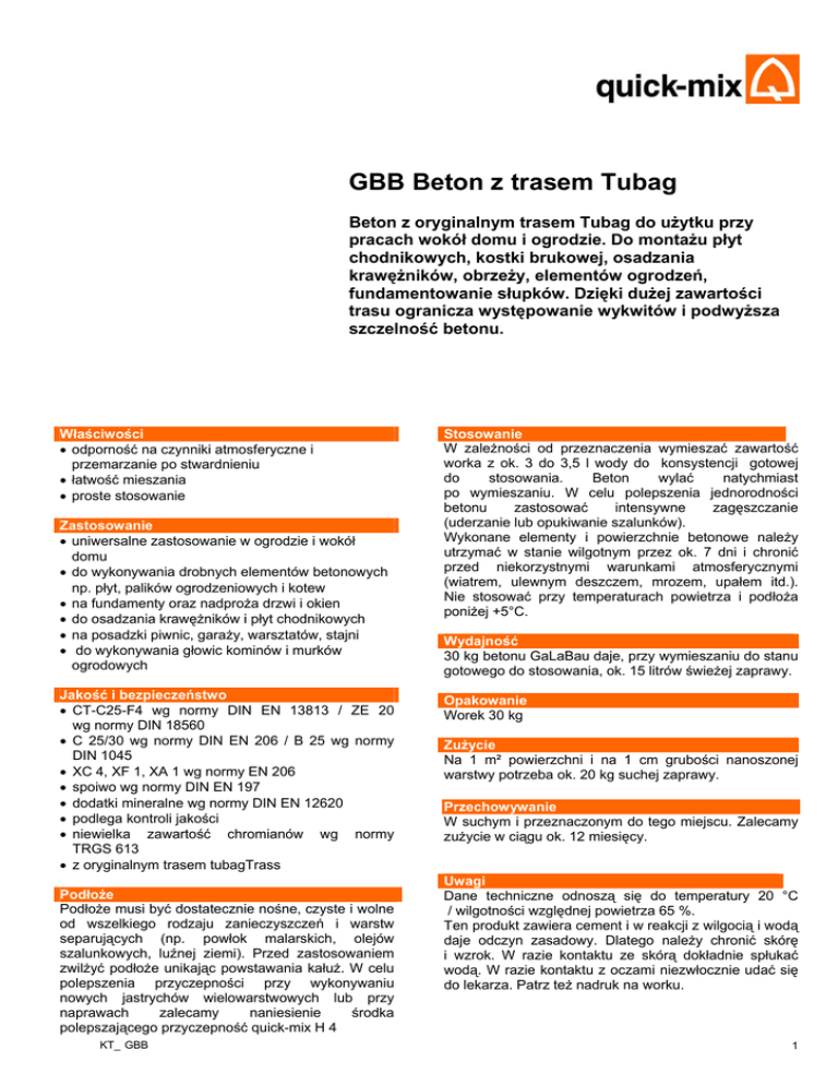 GBB Beton z trasem Tubag Beton z oryginalnym trasem Tubag do użytku przy pracach wokół domu i ogrodzie. Do montażu płyt chodnikowych, kostki brukowej, osadzania krawężników, obrzeży, elementów ogrodzeń, fundamentowanie słupków. Dzięki dużej zawartości trasu ogranicza występowanie wykwitów i podwyższa szczelność betonu. Właściwości • odporność na czynniki atmosferyczne i przemarzanie po stwardnieniu • łatwość mieszania • proste stosowanie Zastosowanie • uniwersalne zastosowanie w ogrodzie i wokół domu • do wykonywania drobnych elementów betonowych np. płyt, palików ogrodzeniowych i kotew • na fundamenty oraz nadproża drzwi i okien • do osadzania krawężników i płyt chodnikowych • na posadzki piwnic, garaży, warsztatów, stajni • do wykonywania głowic kominów i murków ogrodowych Jakość i bezpieczeństwo • CT-C25-F4 wg normy DIN EN 13813 / ZE 20 wg normy DIN 18560 • C 25/30 wg normy DIN EN 206 / B 25 wg normy DIN 1045 • XC 4, XF 1, XA 1 wg normy EN 206 • spoiwo wg normy DIN EN 197 • dodatki mineralne wg normy DIN EN 12620 • podlega kontroli jakości • niewielka zawartość chromianów wg normy TRGS 613 • z oryginalnym trasem tubagTrass Podłoże Podłoże musi być dostatecznie nośne, czyste i wolne od wszelkiego rodzaju zanieczyszczeń i warstw separujących (np. powłok malarskich, olejów szalunkowych, luźnej ziemi). Przed zastosowaniem zwilżyć podłoże unikając powstawania kałuż. W celu polepszenia przyczepności przy wykonywaniu nowych jastrychów wielowarstwowych lub przy naprawach zalecamy naniesienie środka polepszającego przyczepność quick-mix H 4 KT_ GBB Stosowanie W zależności od przeznaczenia wymieszać zawartość worka z ok. 3 do 3,5 l wody do konsystencji gotowej do stosowania. Beton wylać natychmiast po wymieszaniu. W celu polepszenia jednorodności betonu zastosować intensywne zagęszczanie (uderzanie lub opukiwanie szalunków). Wykonane elementy i powierzchnie betonowe należy utrzymać w stanie wilgotnym przez ok. 7 dni i chronić przed niekorzystnymi warunkami atmosferycznymi (wiatrem, ulewnym deszczem, mrozem, upałem itd.). Nie stosować przy temperaturach powietrza i podłoża poniżej +5°C. Wydajność 30 kg betonu GaLaBau daje, przy wymieszaniu do stanu gotowego do stosowania, ok. 15 litrów świeżej zaprawy. Opakowanie Worek 30 kg Zużycie Na 1 m² powierzchni i na 1 cm grubości nanoszonej warstwy potrzeba ok. 20 kg suchej zaprawy. Przechowywanie W suchym i przeznaczonym do tego miejscu. Zalecamy zużycie w ciągu ok. 12 miesięcy. Uwagi Dane techniczne odnoszą się do temperatury 20 °C / wilgotności względnej powietrza 65 %. Ten produkt zawiera cement i w reakcji z wilgocią i wodą daje odczyn zasadowy. Dlatego należy chronić skórę i wzrok. W razie kontaktu ze skórą dokładnie spłukać wodą. W razie kontaktu z oczami niezwłocznie udać się do lekarza. Patrz też nadruk na worku. 1 Powyższe stwierdzenia opierają się na szerokim programie badań i doświadczeń praktycznych. Nie są jednak przenoszalne na każdy przypadek zastosowania. Dlatego ewentualnie zalecamy wykonanie prób zastosowania. Zastrzegamy sobie zmiany techniczne w ramach doskonalenia produktu. W pozostałych sprawach stosują się nasze ogólne warunki handlowe. Dane techniczne klasa wytrzymałości: klasy ekspozycji: wytrzymałość na ściskanie: uziarnienie: czas stosowania: temperatura stosowania: czas mieszania: zapotrzebowanie wody: wydajność: zużycie: przechowywanie: postać dostawy: CT-C25-F4 wg normy DIN EN 13813 lub ZE 20 wg normy DIN 18560 C 25/30 wg normy DIN EN 206 lub B 25 wg normy DIN 1045 XC 4, XF 1, XA 1 wg normy EN 206 ok. 30 N/mm² 0 - 8 mm zużyć natychmiast > + 5°C ok. 3-5 minut ok. 3-3,5 l na 30 kg ok. 15 l na 30 kg ok. 20 kg / m² / cm grubości warstwy w suchym i przeznaczonym do tego miejscu, ok. 12 miesięcy worek 30 kg Stan: czerwiec 2010 Szersze informacje można uzyskać: quick-mix sp. z o.o. ul. Brzegowa 73 57-100 Strzelin tel. 071/ 392 72 20, 15 fax. 071/ 392 72 23, 24 e-mail: [email protected] www.quick-mix.pl KT_GBB quick-mix sp. z o.o., ul. Brzegowa, 73, 57-100 Strzelin, tel. 071/ 392 72 10, 392 72 23, www.quick-mix.pl, [email protected] 2