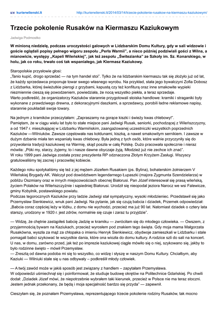kurierwilenski.lt http://kurierwilenski.lt/2014/03/14/trzecie-pokolenie-rusakow-na-kiermaszu-kaziukowym/ Trzecie pokolenie Rusaków na Kiermaszu Kaziukowym Jadwiga Podmostko W minioną niedzielę, podczas uroczystości galowych w Lidzbarskim Domu Kultury, gdy w sali widzowie i goście oglądali popisy pełnego wigoru zespołu „Perła Warmii”, a nieco później podziwiali gości z Wilna, a mianowicie, występy „Kapeli Wileńskiej”, jak też zespołu „Świtezianka” ze Szkoły im. Sz. Konarskiego, w holu, jak co roku, trwało coś tak wspaniałego, jak Kiermasz Kaziukowy. Staropolskie przysłowie głosi: „Tanio kupić, drogo sprzedać — na tym handel stoi”. Tylko że na lidzbarskim kiermaszu tak się złożyło już od lat, że każdy sprzedawca proponuje towar swego własnego wyrobu. Na przykład, stała jego bywalczyni Zofia Dobosz z Lidzbarka, której świeżutkie pierogi z grzybami, kapustą czy też konfiturą oraz inne smakowite wypieki niezmiennie cieszą się powodzeniem, powiedziała, że nocą wszystko piekła, a teraz sprzedaje. Warto podkreślić, że organizatorzy Kaziuków starannie przygotowali stoiska handlowe: kramiki i straganiki były wykonane z prawdziwego drewna, z dekoracyjnymi daszkami, a sprzedawcy, porobili ładne reklamowe napisy, starannie poukładali swoje towary. Na jednym z kramików przeczytałam: „Zapraszamy na gorące kiszki i świeży kwas chlebowy!”. Pamiętam, że w ciągu wielu lat było to stałe miejsce pani Jadwigi Rusak, seniorki, pochodzącej z Wileńszczyzny, a od 1947 r. mieszkającej w Lidzbarku Warmińskim, zaangażowanej uczestniczki wszystkich poprzednich Kaziuków —Wilniuków. Zawsze częstowała nas kołdunami, kiszką, a nawet smakowitym sernikiem. I zawsze w dużym dzbanie miała ten wspaniały kwas chlebowy. Była jedną z tych osób, które walnie przyczyniły się do przywołania tradycji kaziukowej na Warmię, skąd poszła w całą Polskę. Dużo pracowała społecznie i nieraz mówiła: „Póki my, starzy, żyjemy, to i nasze dawne obyczaje żyją. Młodzież już nie zechce ich znać”. W roku 1999 pani Jadwiga została przez prezydenta RP odznaczona Złotym Krzyżem Zasługi. Wszyscy gratulowaliśmy tej zacnej i pracowitej kobiecie. Każdego roku spotykaliśmy się też z jej mężem Józefem Rusakiem (ps. Bylina), bohaterskim żołnierzem V Wileńskiej Brygady AK. Walczył pod dowództwem legendarnego Łupaszki (majora Zygmunta Szendzielarza) w pobliżu Oszmiany oraz w innych miejscowościach obecnej Białorusi. Pan Józef interesował się prasą wileńską, życiem Polaków na Wileńszczyźnie i sąsiedniej Białorusi. Urodził się nieopodal jeziora Narocz we wsi Falewicze, gminy Kobylnik, postawskiego powiatu. Podczas tegorocznych Kaziuków przy ladzie Jadwigi stał sympatyczny, wysoki młodzieniec. Przedstawił się jako Przemysław Sienkiewicz, wnuk pani Jadwigi. Na pytanie, jak się czują babcia i dziadek, Przemek odpowiedział: „Babcia coraz częściej leży w łóżku, z domu nie wychodzi, przecież ma już 90 lat. Natomiast dziadek o cztery lata starszy, urodzony w 1920 r. jest zdrów, normalnie się czuje i zaraz tu przyjdzie”. — Widzę, że chętnie zastąpiłeś babcię Jadzię w kramiku — zwróciłam się do młodego człowieka. — Owszem, z przyjemnością bywam na Kaziukach, przecież wyrosłem pod znakiem tego święta. Gdy moja mama Małgorzata Rusakówna, wyszła za mąż za chłopaka o imieniu Henryk Sienkiewicz, obydwoje zamieszkali w Lidzbarku i stale pomagali babci szykować te wszystkie dania, które ona wiozła do domu kultury. A rodzice szli do sali na koncert. U nas, w domu, zarówno przed, jak też po imprezie kaziukowej ciągle mówiło się o niej, szykowano się, jakby to było rodzinne święto – mówił Przemysław. — Zresztą od dawna podoba mi się to wszystko, co widzę i słyszę w naszym Domu Kultury. Chciałbym, aby Kaziuki — Wilniuki stale się u nas odbywały – podkreślił młody człowiek. — A twój zawód może w jakiś sposób jest związany z handlem – zapytałam Przemysława. W odpowiedzi uśmiechnął się i poinformował, że studiuje budowę okrętów na Politechnice Gdańskiej. Po chwili dodał: „Dziadek Józef mówi, że niepotrzebnie wybrałem taki kierunek, przecież w Polsce nie ma teraz stoczni. Jestem jednak przekonany, że będą i moja specjalność bardzo się przyda” — zapewnił. Cieszyłam się, że poznałam Przemysława, reprezentującego trzecie pokolenie rodziny Rusaków, tak mocno powiązanej z Ziemią Wileńską. Tacy ludzie ceniący i hołubiący nasze tradycje są gwarantem tego, że te tradycje przetrwają wieki. A na kiermaszu nadal było gwarno, jak w ulu, bo oprócz wyrobów miejscowych kucharek i mistrzów ludowych, podziwiano i kupowano palmy naszych mistrzyń Leokadii Szałkowskiej, Danuty Wiszniewskiej i jej córki Agaty Granickiej, tłoczono się wokół stoiska z sercami piernikowymi rodziny Gryszkiewiczów, podziwiano figurki świątków rzeźbionych przez Michała Jankowskiego i piękne lniane obrusy haftowane przez Wandę Sinkiewicz, weterankę zespołu „Wilia”. Z zainteresowaniem przyglądano się obrazom Władysława Ławrynowicza i Stanisława Kaplewskiego. Ach, czego tylko nie było na tegorocznym jarmarku, bez którego, jak mówi nasz niezastąpiony Wincuk: „Nijaka ta święta byłaby…”. Jadwiga Podmostko Lidzbark Warmiński – Wilno Przemysław Sienkiewicz, wnuk Jadwigi Rusak przy stoisku kaziukowym Józef Rusak, weteran V Brygady Wileńskiej AK w pełnej gali wojskowej