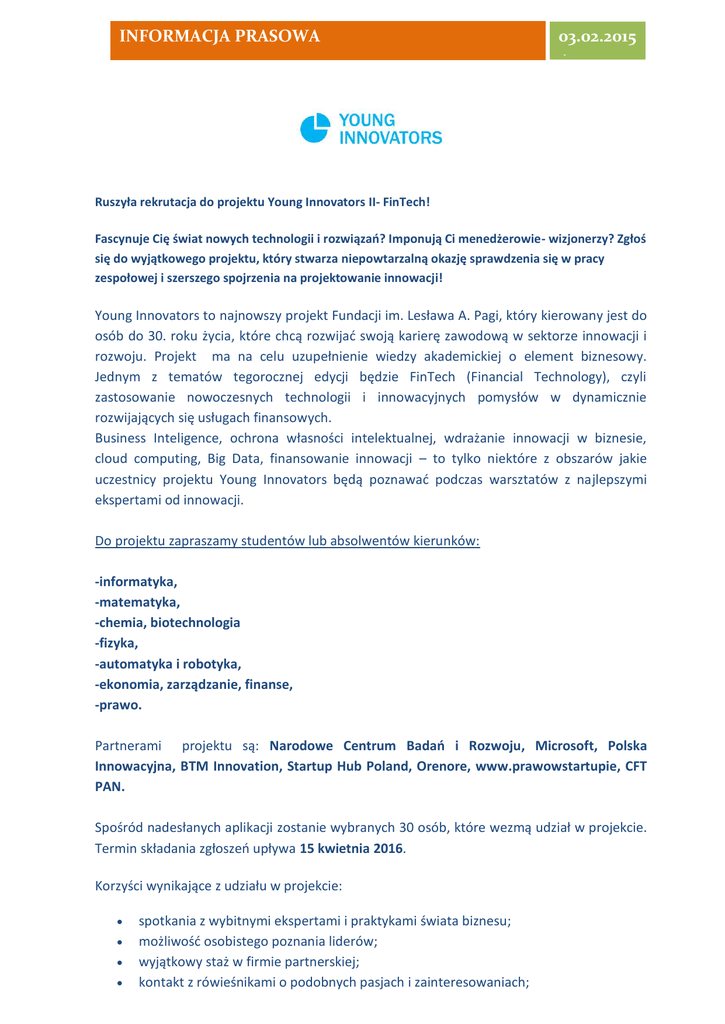 INFORMACJA PRASOWA 03.02.2015 4 Ruszyła rekrutacja do projektu Young Innovators II- FinTech! Fascynuje Cię świat nowych technologii i rozwiązań? Imponują Ci menedżerowie- wizjonerzy? Zgłoś się do wyjątkowego projektu, który stwarza niepowtarzalną okazję sprawdzenia się w pracy zespołowej i szerszego spojrzenia na projektowanie innowacji! Young Innovators to najnowszy projekt Fundacji im. Lesława A. Pagi, który kierowany jest do osób do 30. roku życia, które chcą rozwijać swoją karierę zawodową w sektorze innowacji i rozwoju. Projekt ma na celu uzupełnienie wiedzy akademickiej o element biznesowy. Jednym z tematów tegorocznej edycji będzie FinTech (Financial Technology), czyli zastosowanie nowoczesnych technologii i innowacyjnych pomysłów w dynamicznie rozwijających się usługach finansowych. Business Inteligence, ochrona własności intelektualnej, wdrażanie innowacji w biznesie, cloud computing, Big Data, finansowanie innowacji – to tylko niektóre z obszarów jakie uczestnicy projektu Young Innovators będą poznawać podczas warsztatów z najlepszymi ekspertami od innowacji. Do projektu zapraszamy studentów lub absolwentów kierunków: -informatyka, -matematyka, -chemia, biotechnologia -fizyka, -automatyka i robotyka, -ekonomia, zarządzanie, finanse, -prawo. Partnerami projektu są: Narodowe Centrum Badań i Rozwoju, Microsoft, Polska Innowacyjna, BTM Innovation, Startup Hub Poland, Orenore, www.prawowstartupie, CFT PAN. Spośród nadesłanych aplikacji zostanie wybranych 30 osób, które wezmą udział w projekcie. Termin składania zgłoszeń upływa 15 kwietnia 2016. Korzyści wynikające z udziału w projekcie: spotkania z wybitnymi ekspertami i praktykami świata biznesu; możliwość osobistego poznania liderów; wyjątkowy staż w firmie partnerskiej; kontakt z rówieśnikami o podobnych pasjach i zainteresowaniach; INFORMACJA PRASOWA dołączenie do elitarnego grona Alumnów Fundacji. Więcej informacji na: Dodatkowe informacje: http://www.paga.org.pl Aleksandra Gęsiarz - Koordynator Projektu [email protected] | 22 537 73 36 03.02.2015 4