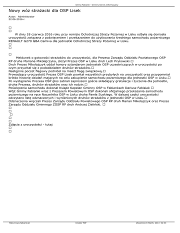 Gmina Fabianki - Gminny Serwis Informacyjny Nowy wóz strażacki dla OSP Lisek Autor: Administrator 22.06.2016 r. W dniu 18 czerwca 2016 roku przy remizie Ochotniczej Straży Pożarnej w Lisku odbyła się doniosła uroczystość związana z poświęceniem i przekazaniem do użytkowania średniego samochodu pożarniczego RENAULT G270 GBA Camiva dla jednostki Ochotniczej Straży Pożarnej w Lisku. Meldunek o gotowości strażaków do uroczystości, dla Prezesa Zarządu Oddziału Powiatowego OSP RP druha Mariana Mikołajczyka, złożył Prezes OSP w Lisku druh Lech Prykowski. Druh Prezes Mikołajczyk oddał honory sztandarom jednostek OSP uczestniczących w uroczystości po czym przywitał się z pododdziałem druhów strażaków. Następnie poczet flagowy podniósł na maszt flagę związkową. Prowadzący uroczystość Prezes OSP Lisek powitał wszystkich przybyłych na uroczystość oraz przypomniał krótko historię działań mających na celu zakupienie samochodu pożarniczego dla jednostki OSP w Lisku. Po wystąpieniu Prezesa OSP głos zabrali zaproszeni goście składający gratulacje i życzenia dla jednostki, druha Prezesa, druhów strażaków oraz ich rodzin. Poświęcenia samochodu dokonał Ksiądz Kapelan Gminny OSP w Fabiankach Dariusz Fabisiak Wójt Gminy Fabianki wraz z Prezesem Powiatowym OSP dokonali oficjalnego przekazania samochodu pożarniczego na ręce Naczelnika OSP w Lisku druha Pawła Suskiego. W dalszej części uroczystości odczytano listę odznaczonych i wyróżnionych druhów strażaków z jednostki OSP w Lisku. Odznaczenia wręczali Prezes Zarządu Oddziału Powiatowego OSP RP druh Marian Mikołajczyk oraz Prezes Zarządu Oddziału Gminnego ZOSP RP druh Andrzej Zieliński. Zdjęcia z uroczystości - tutaj http://www.fabianki.pl Kreator PDF Utworzono 8 March, 2017, 02:33
