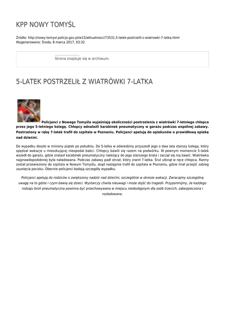 KPP NOWY TOMYŚL Źródło: http://nowy-tomysl.policja.gov.pl/w15/aktualnosci/73531,5-latek-postrzelil-z-wiatrowki-7-latka.html Wygenerowano: Środa, 8 marca 2017, 03:32 Strona znajduje się w archiwum. 5-LATEK POSTRZELIŁ Z WIATRÓWKI 7-LATKA Policjanci z Nowego Tomyśla wyjaśniają okoliczności postrzelenia z wiatrówki 7-letniego chłopca przez jego 5-letniego kolegę. Chłopcy odnaleźli karabinek pneumatyczny w garażu podczas wspólnej zabawy. Postrzelony w rękę 7-latek trafił do szpitala w Poznaniu. Policjanci apelują do opiekunów o prawidłową opiekę nad dziećmi. Do wypadku doszło w miniony piątek po południu. Do 5-latka w odwiedziny przyszedł jego o dwa lata starszy kolega, który spędzał wakacje u mieszkującej nieopodal babci. Chłopcy bawili się razem na podwórku. W pewnym momencie 5-latek wszedł do garażu, gdzie znalazł karabinek pneumatyczny należący do jego starszego brata i zaczął się nią bawić. Wiatrówka najprawdopodobniej była naładowana. Podczas zabawy padł strzał, który zranił 7-latka. Śrut utknął w ręce chłopca. Ranny został przewieziony do szpitala w Nowym Tomyślu, skąd następnie trafił do szpitala w Poznaniu, gdzie miał przejść zabieg usunięcia pocisku. Obecnie policjanci badają szczegóły wypadku. Policjanci apelują do rodziców o zwiększony nadzór nad dziećmi, szczególnie w okresie wakacji. Zwracajmy szczególną uwagę na to gdzie i czym bawią się dzieci. Wystarczy chwila nieuwagi i może dojść do tragedii. Przypomnijmy, że każdego rodzaju broń pneumatyczna powinna być przechowywana w miejscu niedostępnym dla osób trzecich, zabezpieczona i rozładowana. zabezpieczona wiatrówka Ocena: 0/5 (0) Tweetnij