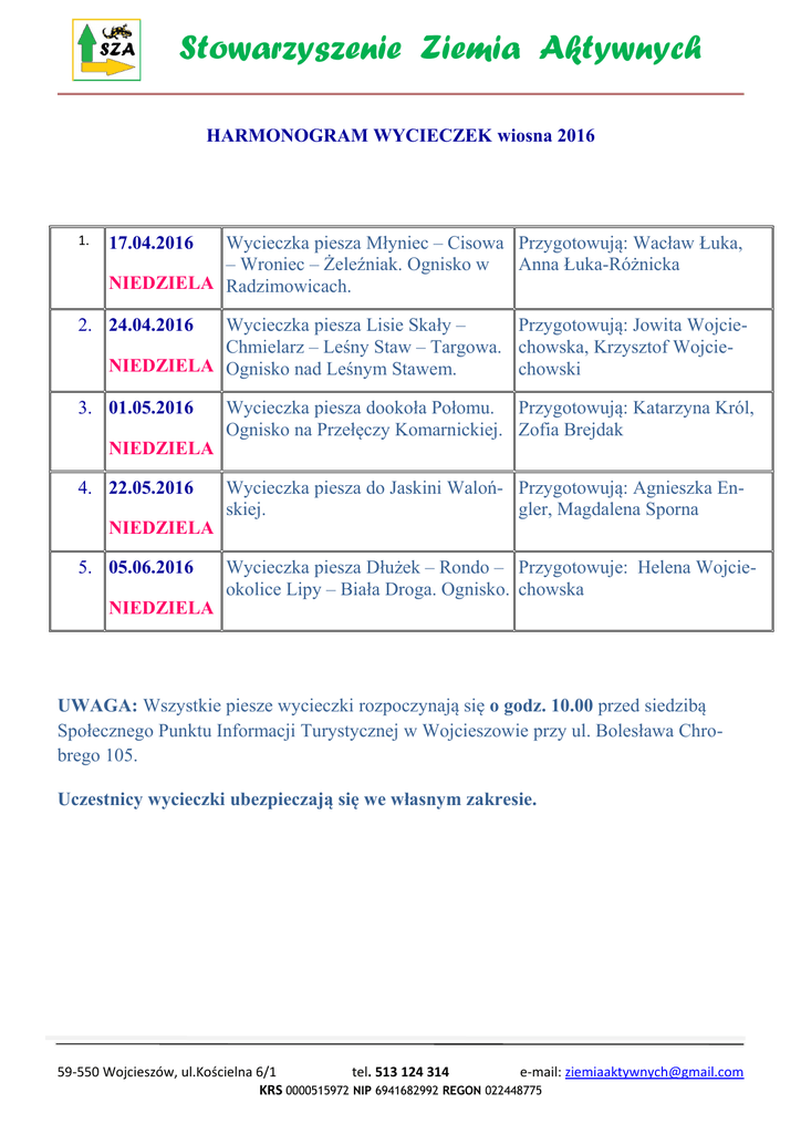 Stowarzyszenie Ziemia Aktywnych HARMONOGRAM WYCIECZEK wiosna 2016 1. 17.04.2016 Wycieczka piesza Młyniec – Cisowa Przygotowują: Wacław Łuka, – Wroniec – Żeleźniak. Ognisko w Anna Łuka-Różnicka NIEDZIELA Radzimowicach. 2. 24.04.2016 Wycieczka piesza Lisie Skały – Przygotowują: Jowita WojcieChmielarz – Leśny Staw – Targowa. chowska, Krzysztof WojcieNIEDZIELA Ognisko nad Leśnym Stawem. chowski 3. 01.05.2016 NIEDZIELA 4. 22.05.2016 NIEDZIELA 5. 05.06.2016 NIEDZIELA Wycieczka piesza dookoła Połomu. Przygotowują: Katarzyna Król, Ognisko na Przełęczy Komarnickiej. Zofia Brejdak Wycieczka piesza do Jaskini Waloń- Przygotowują: Agnieszka Enskiej. gler, Magdalena Sporna Wycieczka piesza Dłużek – Rondo – Przygotowuje: Helena Wojcieokolice Lipy – Biała Droga. Ognisko. chowska UWAGA: Wszystkie piesze wycieczki rozpoczynają się o godz. 10.00 przed siedzibą Społecznego Punktu Informacji Turystycznej w Wojcieszowie przy ul. Bolesława Chrobrego 105. Uczestnicy wycieczki ubezpieczają się we własnym zakresie. 59-550 Wojcieszów, ul.Kościelna 6/1 tel. 513 124 314 e-mail: [email protected] KRS 0000515972 NIP 6941682992 REGON 022448775