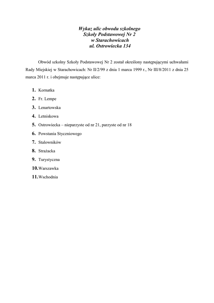 Wykaz ulic obwodu szkolnego Szkoły Podstawowej Nr 2 w Starachowicach ul. Ostrowiecka 134 Obwód szkolny Szkoły Podstawowej Nr 2 został określony następującymi uchwałami Rady Miejskiej w Starachowicach: Nr II/2/99 z dnia 1 marca 1999 r., Nr III/8/2011 z dnia 25 marca 2011 r. i obejmuje następujące ulice: 1. Kornatka 2. Fr. Lempe 3. Lenartowska 4. Letniskowa 5. Ostrowiecka – nieparzyste od nr 21, parzyste od nr 18 6. Powstania Styczniowego 7. Stalowników 8. Strażacka 9. Turystyczna 10. Warszawka 11. Wschodnia
