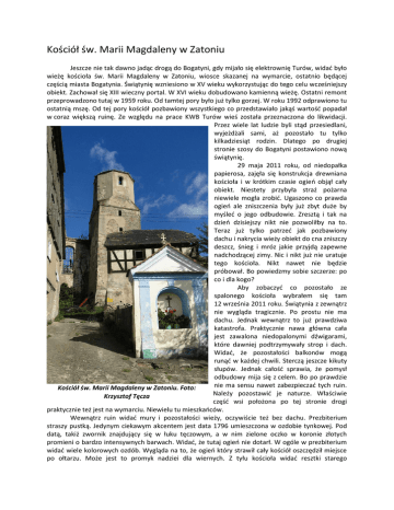 Kościół św. Marii Magdaleny w Zatoniu Jeszcze nie tak dawno jadąc drogą do Bogatyni, gdy mijało się elektrownię Turów, widać było wieżę kościoła św. Marii Magdaleny w Zatoniu, wiosce skazanej na wymarcie, ostatnio będącej częścią miasta Bogatynia. Świątynię wzniesiono w XV wieku wykorzystując do tego celu wcześniejszy obiekt. Zachował się XIII wieczny portal. W XVI wieku dobudowano kamienną wieżę. Ostatni remont przeprowadzono tutaj w 1959 roku. Od tamtej pory było już tylko gorzej. W roku 1992 odprawiono tu ostatnią mszę. Od tej pory kościół pozbawiony wszystkiego co przedstawiało jakąś wartość popadał w coraz większą ruinę. Ze względu na prace KWB Turów wieś została przeznaczona do likwidacji. Przez wiele lat ludzie byli stąd przesiedlani, wyjeżdżali sami, aż pozostało tu tylko kilkadziesiąt rodzin. Dlatego po drugiej stronie szosy do Bogatyni postawiono nową świątynię. 29 maja 2011 roku, od niedopałka papierosa, zajęła się konstrukcja drewniana kościoła i w krótkim czasie ogień objął cały obiekt. Niestety przybyła straż pożarna niewiele mogła zrobić. Ugaszono co prawda ogień ale zniszczenia były już zbyt duże by myśleć o jego odbudowie. Zresztą i tak na dzień dzisiejszy nikt nie pozwoliłby na to. Teraz już tylko patrzeć jak pozbawiony dachu i nakrycia wieży obiekt do cna zniszczy deszcz, śnieg i mróz jakie przyjdą zapewne nadchodzącej zimy. Nic i nikt już nie uratuje tego kościoła. Nikt nawet nie będzie próbował. Bo powiedzmy sobie szczerze: po co i dla kogo? Aby zobaczyć co pozostało ze spalonego kościoła wybrałem się tam 12 września 2011 roku. Świątynia z zewnątrz nie wygląda tragicznie. Po prostu nie ma dachu. Jednak wewnątrz to już prawdziwa katastrofa. Praktycznie nawa główna cała jest zawalona niedopalonymi dźwigarami, które dawniej podtrzymywały strop i dach. Widać, że pozostałości balkonów mogą runąć w każdej chwili. Sterczą jeszcze kikuty słupów. Jednak całość sprawia, że pomysł odbudowy mija się z celem. Bo po prawdzie nie ma sensu nawet zabezpieczać tych ruin. Kościół św. Marii Magdaleny w Zatoniu. Foto: Należy pozostawić je naturze. Właściwie Krzysztof Tęcza część wsi położona po tej stronie drogi praktycznie też jest na wymarciu. Niewielu tu mieszkańców. Wewnątrz ruin widać mury i pozostałości wieży, oczywiście też bez dachu. Prezbiterium straszy pustką. Jedynym ciekawym akcentem jest data 1796 umieszczona w ozdobie tynkowej. Pod datą, takiż zwornik znajdujący się w łuku tęczowym, a w nim zielone oczko w koronie złotych promieni o bardzo intensywnych barwach. Widać, że tutaj ogień nie dotarł. W ogóle w prezbiterium widać wiele kolorowych ozdób. Wygląda na to, że ogień który strawił cały kościół oszczędził miejsce po ołtarzu. Może jest to promyk nadziei dla wiernych. Z tyłu kościoła widać resztki starego cmentarza. Groby są zarośnięte bujną roślinnością. Niektóre nagrobki poprzewracane. Patrząc na ten obraz wydaje się, iż właśnie taki los podzieli świątynia. Czeka ją zapewne to samo co spotkało cmentarz. Zostanie zapomniana przez ludzi, a same mury pochłonie przyroda. Takie niestety jest też nasze życie. Żyjemy póki ktoś o nas pamięta. Później pozostanie pustka, chyba że zachowamy pamięć o świątyni w przekazach. Kościół św. Marii Magdaleny w Zatoniu po pożarze. Foto: Krzysztof Tęcza Dlatego póki jeszcze widać powiem iż świątynię zbudowano na podmurówce kamiennej, wykorzystując jako budulca cegły, którą otynkowano. Wykonano tutaj opaski tynkowe we wszystkich otworach, zarówno okiennych jak i wejściowych. Jedynie wieża została zbudowana w całości z kamienia. Posiada nawet kamienne gzymsy miedzy kondygnacyjne i koronujący. Tutaj obramienia otworów okiennych także wykonano z wykorzystaniem kamienia. Zarówno na wieży jak i na murze kościelnym z drugiej strony nawy umieszczono kamienne tablice z datą i tekstami. W zabudowaniach obok kościoła mieszkają jeszcze ludzie. Uprawiają oni ogródki wciśnięte pomiędzy dom, a mur otaczający teren cmentarza przykościelnego. Gdy przybyły tu turysta stanie przed zadrutowanym wejściem ujrzy tylko gołe mury, zawalony dach oraz w otworach okiennych pozbawionych szyb błyski opromieni słonecznych i sunące po lazurowym niebie białe obłoki. Ale przed tym wszystkim, niejako na tle tego ogromu zniszczeń zobaczy także murowaną kaplicę, w której wisi krzyż z Jezusem, obraz z Janem Pawłem II oraz zielone rośliny z ogromnymi czerwonymi kwiatami. Zatem życie dalej trwa. Krzysztof Tęcza