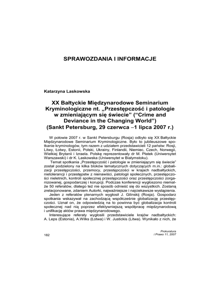 K. Laskowska SPRAWOZDANIA I INFORMACJE Katarzyna Laskowska XX Bałtyckie Międzynarodowe Seminarium Kryminologiczne nt. „Przestępczość i patologie w zmieniającym się świecie” (“Crime and Deviance in the Changing World”) (Sankt Petersburg, 29 czerwca −1 lipca 2007 r.) W połowie 2007 r. w Sankt Petersburgu (Rosja) odbyło się XX Bałtyckie Międzynarodowe Seminarium Kryminologiczne. Było to jubileuszowe spotkanie kryminologów, tym razem z udziałem przedstawicieli 12 państw: Rosji, Litwy, Łotwy, Estonii, Polski, Ukrainy, Finlandii, Niemiec, Czech, Norwegii, Wielkiej Brytanii i Izraela. Polskę reprezentowały dr M. Płatek (Uniwersytet Warszawski) i dr K. Laskowska (Uniwersytet w Białymstoku). Temat spotkania „Przestępczość i patologie w zmieniającym się świecie” został podzielony na kilka bloków tematycznych dotyczących m.in.: globalizacji przestępczości, przemocy, przestępczości w krajach nadbałtyckich, nietolerancji i przestępstw z nienawiści, patologii społecznych, przestępczości nieletnich, kontroli społecznej przestępczości oraz przestępczości zorganizowanej, gospodarczej i korupcji. Podczas konferencji wygłoszono niemalŜe 50 referatów, dlatego teŜ nie sposób odnieść się do wszystkich. Zostaną zrelacjonowane, zdaniem Autorki, najwaŜniejsze i najciekawsze wystąpienia. Jeden z referatów plenarnych wygłosił J. Gilinskij (Rosja). Gospodarz spotkania wskazywał na zachodzącą współcześnie globalizację przestępczości. Uznał on, Ŝe odpowiedzią na to powinna być globalizacja kontroli społecznej nad nią poprzez efektywniejszą współpracę międzynarodową i unifikację aktów prawa międzynarodowego. Interesujące referaty wygłosili przedstawiciele krajów nadbałtyckich: A. Leps (Estonia), A.Wilks (Łotwa) i W. Justickis (Litwa). Wynikało z nich, Ŝe 182 Prokuratura i Prawo 11, 2007 XX Bałtyckie Międzynarodowe Seminarium Kryminologiczne... przyczyny rozwoju przestępczości w ich krajach stanowią: bezrobocie, rozwarstwienie społeczne, alkoholizacja społeczeństwa, nihilizm społeczny, wysoki udział „szarej strefy” w gospodarce, niestabilność prawa karnego, sprzeczności wynikające z procesów demokratycznych, globalizacja, brak koncepcji i strategii zwalczania przestępczości, duŜy poziom wakatów w organach ścigania i wymiaru sprawiedliwości, brak politycznej woli do eliminacji przestępczości. Poziom przestępczości w tych krajach ilustruje poniŜsza tabela. 1995 1996 1997 1998 1999 2000 2001 2002 2003 2004 2005 2006 Łotwa 39141 38205 36865 36674 43969 50199 51082 49329 59034 62173 62173 62328 Estonia 39570 35411 40972 45721 51539 21541 58497 53293 53595 53048 52916 48317 Litwa 60819 68053 75816 78149 77108 82370 79265 72646 79072 93419 89845 82155 Jak wynika z tabeli liczba ujawnionych przestępstw w Estonii i Litwie w ostatnich latach zmniejszyła się o około 5–8%, natomiast na Łotwie uległa nieznacznemu zwiększeniu. Zasadniczo we wszystkich krajach nadbałtyckich rośnie liczba przestępstw gospodarczych i związanych z narkotykami, co jednakŜe nie zawsze znajduje odbicie w statystykach. WaŜnym problemem, który przewijał się w wystąpieniach stanowiła przemoc. A. Djaczenko (Rosja) szczególną uwagę zwrócił na przemoc seksualną, występującą przy przestępstwie zgwałcenia. Jak podkreślał, przestępstwo to w Rosji charakteryzuje duŜa „ciemna liczba”. Eksperci szacują, Ŝe wynosi ona 1:2, ale jego zdaniem moŜe ona wynosić 1:10. Mają o tym świadczyć rezultaty badań socjologicznych wśród kobiet. Jak wynikało z referatów J. Gilinskiego i K. Biełousowa (Rosja) powaŜny problem we współczesnej Rosji stanowi nietolerancja społeczeństwa wobec „innych”. J. Gilinskij wskazywał na negatywne nastawienie Rosjan, głównie wobec migrantów i homoseksualistów, przejawiające się nierzadko popełnianiem przestępstw. Najczęściej ofiarami pobić i zabójstw (głównie poprzez uderzenie noŜem w głowę) stają się obywatele Chin, Indii, Egiptu, Kamerunu, Ugandy, Senegalu, krajów Zakaukazia i Azji. Powodem tego, jak podkreślał K. Biełousow, jest nagłaśnianie przez media zjawiska napływu ogromnych ilości migrantów do Rosji. Informacje te wyzwalają w Rosjanach niezadowolenie (aŜ 57 % uwaŜa, Ŝe stanowią oni zagroŜenie dla społeczeństwa). W związku z tym narastają w kraju nastroje nacjonalistyczne, rodzi się ksenofobia w stosunku do migrantów, przeradzająca się w przestępczość. Kolejny problem podjęty podczas konferencji stanowiła przestępczość nieletnich. M. Dwaliszwili (Rosja) przytoczył kilka danych ilustrujących to zjawisko. Wynikało z nich, Ŝe w koloniach karnych kary odbywa obecnie powyŜej 20 tys. osadzonych w wieku 14–18 lat. Nie mniejsza liczba młodych Prokuratura i Prawo 11, 2007 183 K. Laskowska sprawców przebywa w szkolno-wychowawczych ośrodkach typu zamkniętego. Charakterystyczne jest, Ŝe coraz częściej poza przestępstwami typowymi dla nieletnich, dopuszczają się oni przestępstw zarezerwowanych dla dorosłych: handlu bronią, narkotykami, rozbojów, pobić, zabójstw, produkcji i obrotu fałszywymi pieniędzmi, oszustw finansowych. Współczesną przestępczość nieletnich w Rosji cechuje: działanie w celu osiągnięcia korzyści majątkowych, działanie w grupie, powiązania grup nieletnich z przestępczością zorganizowaną. Podkreślał on potrzebę podejmowania bardziej skutecznych działań prewencyjnych niŜ realizowane dotychczas. Podczas konferencji kilka referatów poświęcono teŜ współczesnej przestępczości zorganizowanej. J. Kostjukowskij (Rosja) ukazał zmiany, jakie nastąpiły w ostatnich latach w niej. Podkreślał on, Ŝe coraz bardziej związuje się ona ze sferą biznesu i organami władzy róŜnego szczebla. Zmienił się etyczny charakter zjawiska, bowiem przestępcza działalność przedstawicieli władzy w Rosji nie tylko nie jest ukrywana, ale i nie nazywana przest