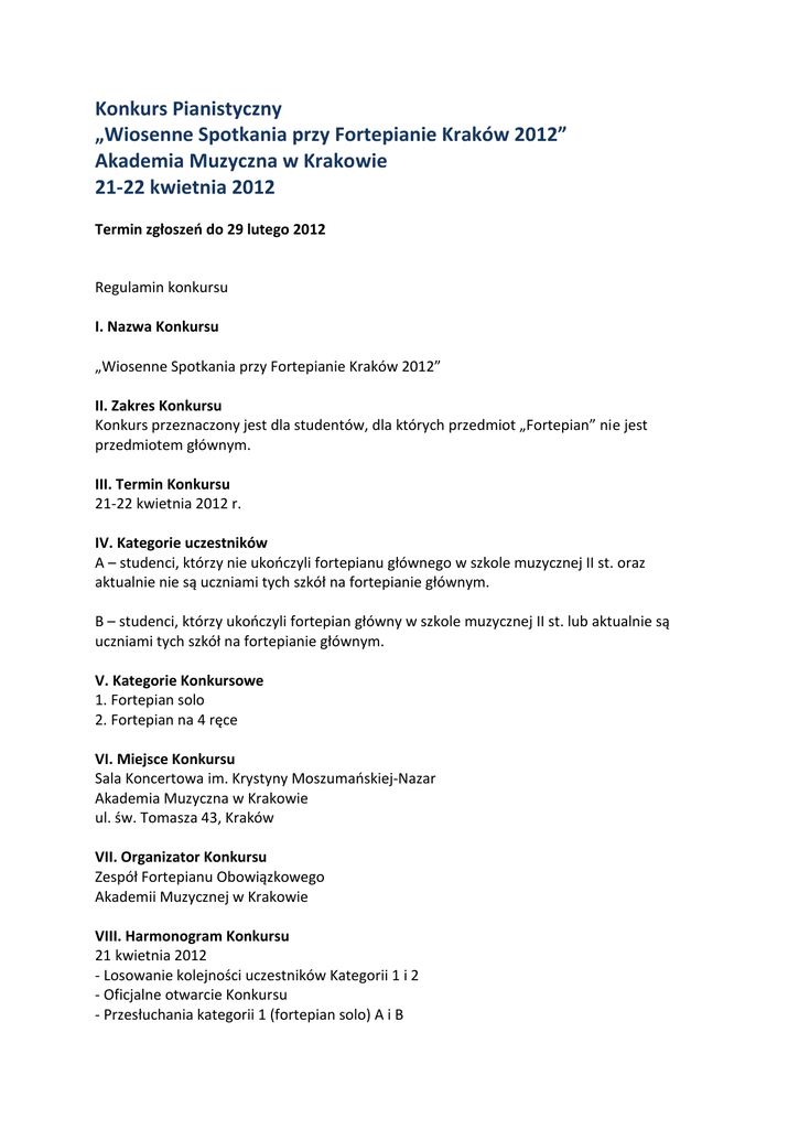 Konkurs Pianistyczny „Wiosenne Spotkania przy Fortepianie Kraków 2012” Akademia Muzyczna w Krakowie 21-22 kwietnia 2012 Termin zgłoszeo do 29 lutego 2012 Regulamin konkursu I. Nazwa Konkursu „Wiosenne Spotkania przy Fortepianie Kraków 2012” II. Zakres Konkursu Konkurs przeznaczony jest dla studentów, dla których przedmiot „Fortepian” nie jest przedmiotem głównym. III. Termin Konkursu 21-22 kwietnia 2012 r. IV. Kategorie uczestników A – studenci, którzy nie ukooczyli fortepianu głównego w szkole muzycznej II st. oraz aktualnie nie są uczniami tych szkół na fortepianie głównym. B – studenci, którzy ukooczyli fortepian główny w szkole muzycznej II st. lub aktualnie są uczniami tych szkół na fortepianie głównym. V. Kategorie Konkursowe 1. Fortepian solo 2. Fortepian na 4 ręce VI. Miejsce Konkursu Sala Koncertowa im. Krystyny Moszumaoskiej-Nazar Akademia Muzyczna w Krakowie ul. św. Tomasza 43, Kraków VII. Organizator Konkursu Zespół Fortepianu Obowiązkowego Akademii Muzycznej w Krakowie VIII. Harmonogram Konkursu 21 kwietnia 2012 - Losowanie kolejności uczestników Kategorii 1 i 2 - Oficjalne otwarcie Konkursu - Przesłuchania kategorii 1 (fortepian solo) A i B 22 kwietnia 2012 - Przesłuchanie kategorii 2 (fortepian na 4 ręce) A i B - Zakooczenie Konkursu Uczestnicy dokonują losowania osobiście. IX. Adres Konkursu Akademia Muzyczna w Krakowie ul. św. Tomasza 43, 31-027 Kraków, Polska tel. +48 12 422 44 00 tel. + 48 502 541 014 fax: + 48 12 422 44 55 e-mail: [email protected] www.amuz.krakow.pl X. Jury Konkursu Skład Jury zostanie ogłoszony przed Konkursem. Jury pracuje według odrębnego, zatwierdzonego przez członków Jury regulaminu. Decyzje Jury są ostateczne, nieodwołalne i niezaskarżalne. XI. Ocena wykonao Wykonania utworów będą podlegały ocenie w następujących aspektach: 1. Zgodnośd realizacji z zapisem 2. Zgodnośd realizacji z założeniami stylistycznymi epoki, w której utwór powstał 3. Zgodnośd ekspresji wykonawczej z zawartością ekspresyjną utworu 4. Umiejętnośd odczytywania i realizowania intencji kompozytora 5. Autentycznośd przeżycia artystycznego 6. Ogólne wrażenie artystyczne XII. Nagrody Informacja o wysokości nagród zostanie podana do 31 stycznia 2012. XIII. Warunki uczestnictwa W celu zgłoszenia uczestnictwa należy: nadesład do 29 lutego 2012 roku drogą elektroniczną lub pocztą zwykłą (decyduje data stempla pocztowego) następującą dokumentację, która nie podlega zwrotowi: • wypełniona KARTA UCZESTNICTWA • fotografia (format 4,5 x 6,5 cm) • potwierdzenie wniesienia opłaty uczestnictwa w wysokości 20 € (kopia dowodu przelewu ) którą należy przesład wyłącznie na konto: BANK PEKAO S.A. III Odział Kraków 48 1240 2294 1111 0000 3708 8211 Adres Konkursu: Akademia Muzyczna w Krakowie ul. św. Tomasza 43, 31-027 Kraków, Polska z dopiskiem „Wiosenne Spotkania przy Fortepianie Kraków 2012” XIV. Inne warunki • Wydatki związane z przygotowaniem i realizacją konkursu ponosi organizator. • Opłaty związane z podróżą, wyżywieniem i noclegiem ponoszą uczestnicy. • Rezerwację noclegów i wyżywienia uczestnicy konkursu dokonują we własnym zakresie. • W przypadku brania udziału w więcej niż w jednej kategorii konkursowej uczestnik wnosi jedną opłatę. • Przesłuchania konkursowe są otwarte dla publiczności. XV. Organizacja ćwiczenia Informacje o numerze sali i czasie przydzielonym każdemu uczestnikowi do dwiczenia ukaże się na stronie internetowej 2 tygodnie przed rozpoczęciem konkursu. XVI. Wymagania programowe Kategoria 1 (fortepian solo) : A - utwór z okresu baroku - utwór z okresu klasycznego - utwór dowolny Utwory mogą stanowid częśc cyklu B - utwór z epoki baroku (może byd częśc cyklu) - utwór z okresu klasycznego (allegro sonatowe; rondo samodzielne lub będące częścią sonaty; wariacje samodzielne lub będące częścią sonaty) - utwór dowolny Program powinien byd wykonany w pamięci za wyjątkiem utworów napisanych przez kompozytorów urodzonych po roku 1900. Kategoria 2 (fortepian na 4 ręce) A - utwory reprezentujące przynajmniej dwa okresy stylistyczne B - utwory reprezentujące przynajmniej dwa okresy stylistyczne Program musi zawierad wyłącznie oryginalne kompozycje na cztery ręce. Formę cykliczną należy wykonad w całości. Dopuszcza się wykonanie programu z nut. XVII. Limit czasu Kategoria 1 (fortepian solo) A – do 15 minut B – do 20 minut Kategoria 2 ( fortepian na 4 ręce) A – min. 20 minut, max – 25 minut B – min. 25 minut, max – 30 minut