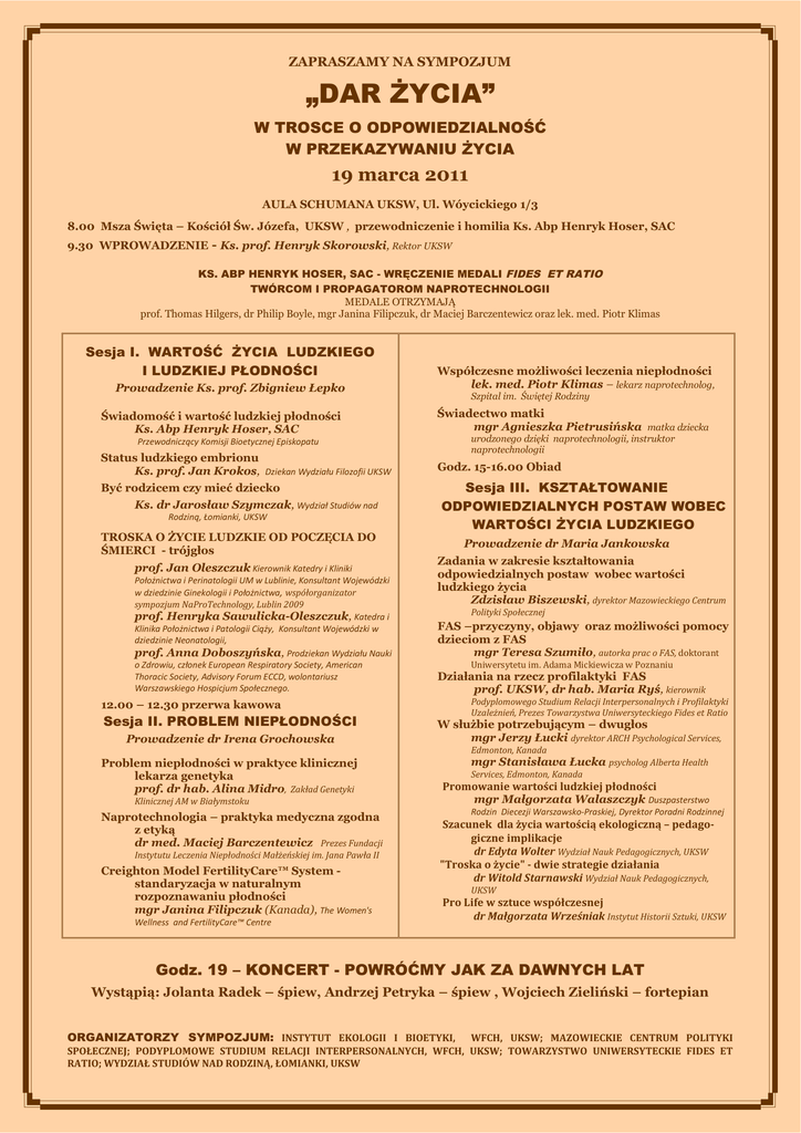ZAPRASZAMY NA SYMPOZJUM „DAR ŻYCIA” W TROSCE O ODPOWIEDZIALNOŚĆ W PRZEKAZYWANIU ŻYCIA 19 marca 2011 AULA SCHUMANA UKSW, Ul. Wóycickiego 1/3 8.00 Msza Święta – Kościół Św. Józefa, UKSW , przewodniczenie i homilia Ks. Abp Henryk Hoser, SAC 9.30 WPROWADZENIE - Ks. prof. Henryk Skorowski, Rektor UKSW KS. ABP HENRYK HOSER, SAC - WRĘCZENIE MEDALI FIDES ET RATIO TWÓRCOM I PROPAGATOROM NAPROTECHNOLOGII MEDALE OTRZYMAJĄ prof. Thomas Hilgers, dr Philip Boyle, mgr Janina Filipczuk, dr Maciej Barczentewicz oraz lek. med. Piotr Klimas Sesja I. WARTOŚĆ ŻYCIA LUDZKIEGO I LUDZKIEJ PŁODNOŚCI Prowadzenie Ks. prof. Zbigniew Łepko Świadomość i wartość ludzkiej płodności Ks. Abp Henryk Hoser, SAC Współczesne możliwości leczenia niepłodności lek. med. Piotr Klimas – lekarz naprotechnolog, Szpital im. Świętej Rodziny Świadectwo matki mgr Agnieszka Pietrusińska matka dziecka urodzonego dzięki naprotechnologii, instruktor naprotechnologii Przewodniczący Komisji Bioetycznej Episkopatu Status ludzkiego embrionu Ks. prof. Jan Krokos, Dziekan Wydziału Filozofii UKSW Być rodzicem czy mieć dziecko Ks. dr Jarosław Szymczak, Wydział Studiów nad Rodziną, Łomianki, UKSW TROSKA O ŻYCIE LUDZKIE OD POCZĘCIA DO ŚMIERCI - trójgłos prof. Jan Oleszczuk Kierownik Katedry i Kliniki Położnictwa i Perinatologii UM w Lublinie, Konsultant Wojewódzki w dziedzinie Ginekologii i Położnictwa, współorganizator sympozjum NaProTechnology, Lublin 2009 prof. Henryka Sawulicka-Oleszczuk, Katedra i Klinika Położnictwa i Patologii Ciąży, Konsultant Wojewódzki w dziedzinie Neonatologii, prof. Anna Doboszyńska, Prodziekan Wydziału Nauki o Zdrowiu, członek European Respiratory Society, American Thoracic Society, Advisory Forum ECCD, wolontariusz Warszawskiego Hospicjum Społecznego. Godz. 15-16.00 Obiad Sesja III. KSZTAŁTOWANIE ODPOWIEDZIALNYCH POSTAW WOBEC WARTOŚCI ŻYCIA LUDZKIEGO Prowadzenie dr Maria Jankowska Zadania w zakresie kształtowania odpowiedzialnych postaw wobec wartości ludzkiego życia Zdzisław Biszewski, dyrektor Mazowieckiego Centrum Polityki Społecznej FAS –przyczyny, objawy oraz możliwości pomocy dzieciom z FAS mgr Teresa Szumiło, autorka prac o FAS, doktorant Uniwersytetu im. Adama Mickiewicza w Poznaniu Działania na rzecz profilaktyki FAS prof. UKSW, dr hab. Maria Ryś, kierownik Podyplomowego Studium Relacji Interpersonalnych i Profilaktyki Uzależnień, Prezes Towarzystwa Uniwersyteckiego Fides et Ratio 12.00 – 12.30 przerwa kawowa Sesja II. PROBLEM NIEPŁODNOŚCI Prowadzenie dr Irena Grochowska W służbie potrzebującym – dwugłos mgr Jerzy Łucki dyrektor ARCH Psychological Services, Edmonton, Kanada Problem niepłodności w praktyce klinicznej lekarza genetyka prof. dr hab. Alina Midro, Zakład Genetyki Klinicznej AM w Białymstoku Naprotechnologia – praktyka medyczna zgodna z etyką dr med. Maciej Barczentewicz Prezes Fundacji Instytutu Leczenia Niepłodności Małżeńskiej im. Jana Pawła II Creighton Model FertilityCare™ System standaryzacja w naturalnym rozpoznawaniu płodności mgr Janina Filipczuk (Kanada), The Women's Wellness and FertilityCare™ Centre mgr Stanisława Łucka psycholog Alberta Health Services, Edmonton, Kanada Promowanie wartości ludzkiej płodności mgr Małgorzata Walaszczyk Duszpasterstwo Rodzin Diecezji Warszawsko-Praskiej, Dyrektor Poradni Rodzinnej Szacunek dla życia wartością ekologiczną – pedagogiczne implikacje dr Edyta Wolter Wydział Nauk Pedagogicznych, UKSW "Troska o życie" - dwie strategie działania dr Witold Starnawski Wydział Nauk Pedagogicznych, UKSW Pro Life w sztuce współczesnej dr Małgorzata Wrześniak Instytut Historii Sztuki, UKSW Godz. 19 – KONCERT - POWRÓĆMY JAK ZA DAWNYCH LAT Wystąpią: Jolanta Radek – śpiew, Andrzej Petryka – śpiew , Wojciech Zieliński – fortepian ORGANIZATORZY SYMPOZJUM: INSTYTUT EKOLOGII I BIOETYKI, WFCH, UKSW; MAZOWIECKIE CENTRUM POLITYKI SPOŁECZNEJ; PODYPLOMOWE STUDIUM RELACJI INTERPERSONALNYCH, WFCH, UKSW; TOWARZYSTWO UNIWERSYTECKIE FIDES ET RATIO; WYDZIAŁ STUDIÓW NAD RODZINĄ, ŁOMIANKI, UKSW