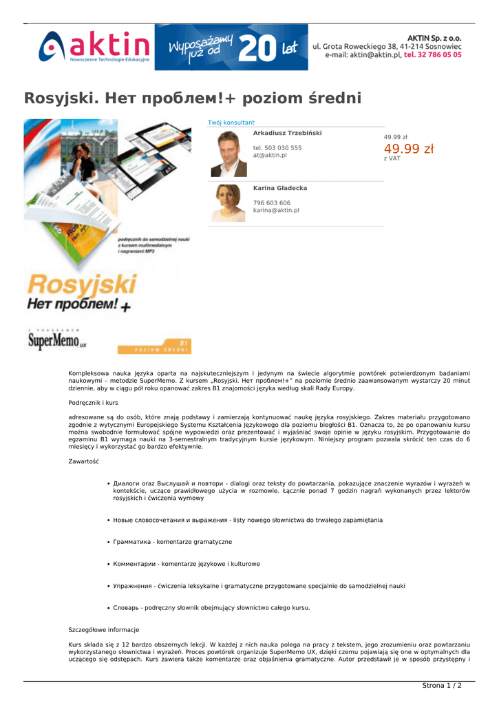 Rosyjski. Нет проблем!+ poziom średni Twój konsultant Arkadiusz Trzebiński tel. 503 030 555 [email protected] NOWOŚĆ W OFERCIE 49.99 zł 49.99 zł z VAT Karina Gładecka 796 603 606 [email protected] Kompleksowa nauka języka oparta na najskuteczniejszym i jedynym na świecie algorytmie powtórek potwierdzonym badaniami naukowymi – metodzie SuperMemo. Z kursem „Rosyjski. Нет проблем!+” na poziomie średnio zaawansowanym wystarczy 20 minut dziennie, aby w ciągu pół roku opanować zakres B1 znajomości języka według skali Rady Europy. Podręcznik i kurs adresowane są do osób, które znają podstawy i zamierzają kontynuować naukę języka rosyjskiego. Zakres materiału przygotowano zgodnie z wytycznymi Europejskiego Systemu Kształcenia Językowego dla poziomu biegłości B1. Oznacza to, że po opanowaniu kursu można swobodnie formułować spójne wypowiedzi oraz prezentować i wyjaśniać swoje opinie w języku rosyjskim. Przygotowanie do egzaminu B1 wymaga nauki na 3-semestralnym tradycyjnym kursie językowym. Niniejszy program pozwala skrócić ten czas do 6 miesięcy i wykorzystać go bardzo efektywnie. Zawartość Диалоги oraz Выслушай и повтори - dialogi oraz teksty do powtarzania, pokazujące znaczenie wyrazów i wyrażeń w kontekście, uczące prawidłowego użycia w rozmowie. Łącznie ponad 7 godzin nagrań wykonanych przez lektorów rosyjskich i ćwiczenia wymowy Новые словосочетания и выражения - listy nowego słownictwa do trwałego zapamiętania Грамматика - komentarze gramatyczne Комментарии - komentarze językowe i kulturowe Упражнения - ćwiczenia leksykalne i gramatyczne przygotowane specjalnie do samodzielnej nauki Словарь - podręczny słownik obejmujący słownictwo całego kursu. Szczegółowe informacje Kurs składa się z 12 bardzo obszernych lekcji. W każdej z nich nauka polega na pracy z tekstem, jego zrozumieniu oraz powtarzaniu wykorzystanego słownictwa i wyrażeń. Proces powtórek organizuje SuperMemo UX, dzięki czemu pojawiają się one w optymalnych dla uczącego się odstępach. Kurs zawiera także komentarze oraz objaśnienia gramatyczne. Autor przedstawił je w sposób przystępny i Strona 1 / 2 zrozumiały oraz uzupełnił o serię zadań utrwalających zdobytą wiedzę i pomagających opanować gramatykę szybko i naturalnie. na przedstawiony materiał gramatyczny składają się między innymi: odmiany czasowników nieregularnych, tryb rozkazujący i warunkowy, rzeczowniki nieodmienne liczebniki zestawione i zbiorowe, przymiotniki jakościowe. wśród zagadnień leksykalnych znajdują się: zwroty dotyczące zachowania się, zakupy, w kawiarni i restauracji, zwiedzanie, słownictwo i wyrażenia związane z komputerem i internetem. ponad 1 000 słów i wyrażeń przeznaczonych do nauki, ponad 3 000 ćwiczeń gramatycznych i leksykalnych w formie przygotowanej specjalnie dla kursów językowych, czytanki i dialogi w języku rosyjskim z polskim tłumaczeniem, na końcu książki oraz w programie multimedialnym zamieszczony został podręczny słowniczek, złożony z wyrazów i zwrotów użytych w kursie, zintegrowany z programem, zaawansowany analizator wymowy, pozwalający użytkownikom w domowym zaciszu doskonalić wymowę, a przez to ośmielić do mówienia w języku obcym, tematykę kursu oraz zagadnienia gramatyczne przygotowano na podstawie wytycznych Europejskiego Systemu Kształcenia Językowego. Materiał tego kursu skutecznie przygotowuje do egzaminu telc na poziomie B1. Wymagania techniczne: procesor 400 MHz, 256 MB RAM, CD-ROM, karta dźwiękowa, mikrofon, Windows XP, Windows Vista lub Windows 7 Internet Explorer 7 lub nowszy Strona 2 / 2 Powered by TCPDF (www.tcpdf.org)