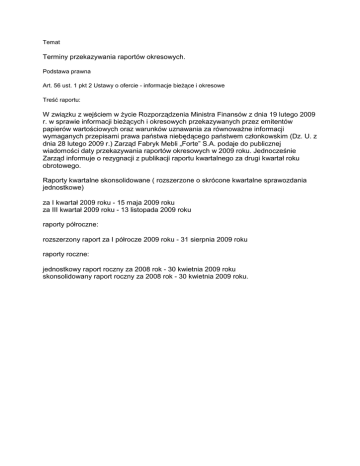 Temat Terminy przekazywania raportów okresowych. Podstawa prawna Art. 56 ust. 1 pkt 2 Ustawy o ofercie - informacje bieŜące i okresowe Treść raportu: W związku z wejściem w Ŝycie Rozporządzenia Ministra Finansów z dnia 19 lutego 2009 r. w sprawie informacji bieŜących i okresowych przekazywanych przez emitentów papierów wartościowych oraz warunków uznawania za równowaŜne informacji wymaganych przepisami prawa państwa niebędącego państwem członkowskim (Dz. U. z dnia 28 lutego 2009 r.) Zarząd Fabryk Mebli „Forte” S.A. podaje do publicznej wiadomości daty przekazywania raportów okresowych w 2009 roku. Jednocześnie Zarząd informuje o rezygnacji z publikacji raportu kwartalnego za drugi kwartał roku obrotowego. Raporty kwartalne skonsolidowane ( rozszerzone o skrócone kwartalne sprawozdania jednostkowe) za I kwartał 2009 roku - 15 maja 2009 roku za III kwartał 2009 roku - 13 listopada 2009 roku raporty półroczne: rozszerzony raport za I półrocze 2009 roku - 31 sierpnia 2009 roku raporty roczne: jednostkowy raport roczny za 2008 rok - 30 kwietnia 2009 roku skonsolidowany raport roczny za 2008 rok - 30 kwietnia 2009 roku.