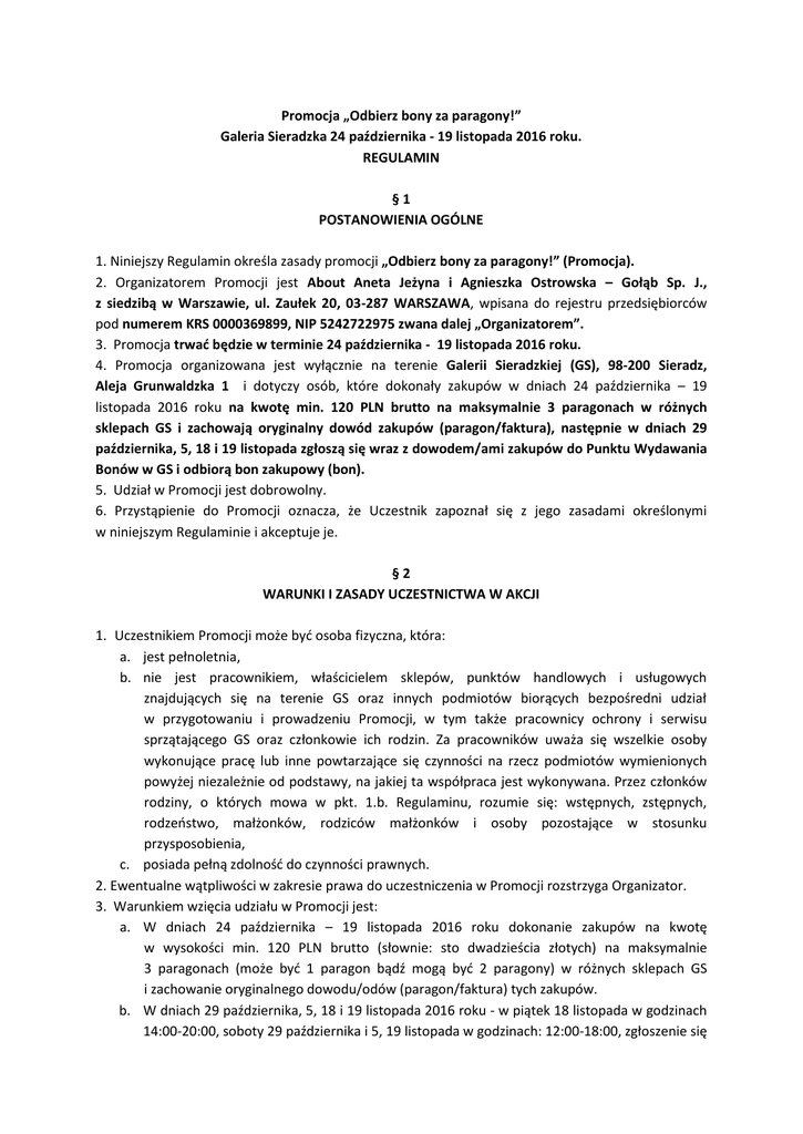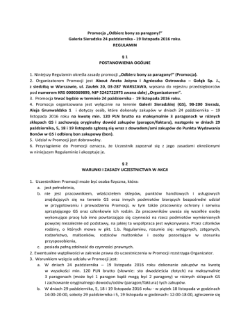 Promocja „Odbierz bony za paragony!” Galeria Sieradzka 24 października - 19 listopada 2016 roku. REGULAMIN §1 POSTANOWIENIA OGÓLNE 1. Niniejszy Regulamin określa zasady promocji „Odbierz bony za paragony!” (Promocja). 2. Organizatorem Promocji jest About Aneta Jeżyna i Agnieszka Ostrowska – Gołąb Sp. J., z siedzibą w Warszawie, ul. Zaułek 20, 03-287 WARSZAWA, wpisana do rejestru przedsiębiorców pod numerem KRS 0000369899, NIP 5242722975 zwana dalej „Organizatorem”. 3. Promocja trwać będzie w terminie 24 października - 19 listopada 2016 roku. 4. Promocja organizowana jest wyłącznie na terenie Galerii Sieradzkiej (GS), 98-200 Sieradz, Aleja Grunwaldzka 1 i dotyczy osób, które dokonały zakupów w dniach 24 października – 19 listopada 2016 roku na kwotę min. 120 PLN brutto na maksymalnie 3 paragonach w różnych sklepach GS i zachowają oryginalny dowód zakupów (paragon/faktura), następnie w dniach 29 października, 5, 18 i 19 listopada zgłoszą się wraz z dowodem/ami zakupów do Punktu Wydawania Bonów w GS i odbiorą bon zakupowy (bon). 5. Udział w Promocji jest dobrowolny. 6. Przystąpienie do Promocji oznacza, że Uczestnik zapoznał się z jego zasadami określonymi w niniejszym Regulaminie i akceptuje je. §2 WARUNKI I ZASADY UCZESTNICTWA W AKCJI 1. Uczestnikiem Promocji może być osoba fizyczna, która: a. jest pełnoletnia, b. nie jest pracownikiem, właścicielem sklepów, punktów handlowych i usługowych znajdujących się na terenie GS oraz innych podmiotów biorących bezpośredni udział w przygotowaniu i prowadzeniu Promocji, w tym także pracownicy ochrony i serwisu sprzątającego GS oraz członkowie ich rodzin. Za pracowników uważa się wszelkie osoby wykonujące pracę lub inne powtarzające się czynności na rzecz podmiotów wymienionych powyżej niezależnie od podstawy, na jakiej ta współpraca jest wykonywana. Przez członków rodziny, o których mowa w pkt. 1.b. Regulaminu, rozumie się: wstępnych, zstępnych, rodzeństwo, małżonków, rodziców małżonków i osoby pozostające w stosunku przysposobienia, c. posiada pełną zdolność do czynności prawnych. 2. Ewentualne wątpliwości w zakresie prawa do uczestniczenia w Promocji rozstrzyga Organizator. 3. Warunkiem wzięcia udziału w Promocji jest: a. W dniach 24 października – 19 listopada 2016 roku dokonanie zakupów na kwotę w wysokości min. 120 PLN brutto (słownie: sto dwadzieścia złotych) na maksymalnie 3 paragonach (może być 1 paragon bądź mogą być 2 paragony) w różnych sklepach GS i zachowanie oryginalnego dowodu/odów (paragon/faktura) tych zakupów. b. W dniach 29 października, 5, 18 i 19 listopada 2016 roku - w piątek 18 listopada w godzinach 14:00-20:00, soboty 29 października i 5, 19 listopada w godzinach: 12:00-18:00, zgłoszenie się o pełnych godzinach wraz z dowodem/ami zakupów do Punktu Wydania Bonów w GS, okazanie dowodu/ów zakupów, wypełnienie i podpisanie formularza odbioru bonów oraz odebranie bonu zakupowego. 4. Zakupy dokonane w dniach 24 października – 19 listopada 2016 roku umożliwiają odebranie bonu w dniach 29 października, 5, 18 i 19 listopada 2016 roku. 5. Promocja dotyczy zakupu wszelkich produktów lub usług, z wyłączeniem artykułów alkoholowych w rozumieniu ustawy z dnia 26 października 1982 r. o wychowaniu w trzeźwości i przeciwdziałaniu alkoholizmowi, wyrobów alkoholowych i tytoniowych, leków na receptę oraz wydatków na kupony loteryjne i transakcji kantorowych. 6. Punkt Wydawania Bonów będzie się mieścił w GS i czynny będzie w dniach 29 października, 5, 18 i 19 listopada 2016 roku (piątek 18 listopada w godzinach 14:00-20:00, soboty 29 października i 5, 19 listopada w godzinach: 12:00-18:00). 7. Jeden Uczestnik ma prawo do jednokrotnego zgłoszenia się do udziału w Promocji w ciągu jednego dnia wydawania bonów (29 października, 5, 18, 19 listopada 2016 r.), nawet jeśli posiada większą ilość dowodów zakupu. 8. Paragony biorące udział w Promocji muszą pochodzić z różnych sklepów GS (np. 3 paragony zgłoszone do Promocji muszą pochodzić z 3 różnych sklepów). 9. Dowód uprawniający Uczestnika Promocji do otrzymania bonu zostanie przy odbiorze bonu opieczętowany przez pracownika Punktu Obsługi Promocji. Opieczętowany dowód uważa się za zrealizowany i nie uprawnia Uczestnika Promocji do ponownego otrzymania bonu. 10.W przypadku powzięcia przez Organizatora wątpliwości co do autentyczności paragonu, wydanie bonów może zostać wstrzymane do momentu potwierdzenia oryginalności lub pochodzenia dowodu zakupów. 11. Przy odbiorze bonu Uczestnik Promocji musi pokwitować jego odbiór (wpisać dane osobowe: imię i nazwisko, adres zamieszkania, numeru paragonu/faktury, kwotę zakupów, nazwę sklepu w którym dokonał zakupów oraz podpisać się) na specjalnym formularzu odbioru bonów dostępnym w Punkcie Wydawania Bonów. 12.Bony niewydane w Promocji pozostają w dyspozycji GS. §3 BONY ZAKUPOWE – WARUNKI REALIZACJI 1. Bon zakupowy można otrzymać spełniając wszystkie warunki udziału w akcji „Odbierz bony za paragony!”, organizowanej w terminie 24 października – 19 listopada 2016 roku w Galerii Sieradzkiej. 2. Bon zakupowy upoważnia do dokonania zakupów wyłącznie w wybranych sklepach Galerii Sieradzkiej (98-200 Sieradz, Aleja Grunwaldzka 1). 3. Lista sklepów, w których można zrealizować niniejszy bon zakupowy znajduje się na stronie internetowej Galerii Sieradzkiej www.galeriasieradzka.pl oraz w Załączniku nr 1 do niniejszego Regulaminu. 4. W przypadku dokonania wyboru towarów poniżej wartości bonu zakupowego - Klient nie otrzymuje reszty. 5. W przypadku dokonania wyboru towarów powyżej wartości bonu zakupowego – Klient zobowiązany jest do dokonania dopłaty przekraczającej wartość bonu zakupowego. 6. Bon zakupowy można zrealizować najpóźniej do 29 listopada 2016 roku. Po tym terminie bon traci ważność. 7. Tow