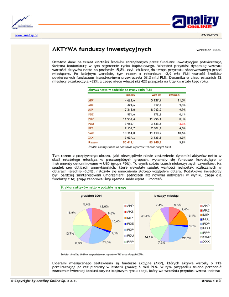 www.analizy.pl 07-10-2005 AKTYWA funduszy inwestycyjnych wrzesień 2005 Ostatnie dane na temat wartości środków zarządzanych przez fundusze inwestycyjne potwierdzają świetna koniunkturę w tym segmencie rynku kapitałowego. Wrzesień przyniósł dynamikę wzrostu wartości aktywów netto na poziomie +5,8%, czyli zbliżoną do tempa przyrostu obserwowanego przed miesiącem. Po kolejnym wzroście, tym razem o rekordowe +2,9 mld PLN wartość środków powierzonych funduszom inwestycyjnym przekroczyła 53,3 mld PLN. Dynamika w ciągu ostatnich 12 miesięcy przekroczyła +52%, z czego nieco więcej niż 42% przypada na trzy kwartały tego roku. Aktywa netto w podziale na grupy (mln PLN) AKP sie 05 wrz 05 4 628,6 5 137,9 zmiana 11,0% AKZ 473,6 517,7 9,3% MIP 7 315,0 8 042,9 9,9% PDE 971,6 972,2 0,1% PDP 11 958,4 11 996,1 0,3% PDU 3 966,1 3 833,3 -3,3% RPP 7 158,7 7 501,2 4,8% SWP 10 314,0 11 410,9 10,6% XXX 3 627,2 3 933,8 8,5% 50 413,1 53 345,9 5,8% Razem Źródło: Analizy Online na podstawie raportów TFI oraz danych IZFiA Tym razem z pozytywnego obrazu, jaki niewątpliwie niesie zestawienie dynamiki aktywów netto w skali ostatniego miesiąca w poszczególnych grupach, wyłamały się fundusze inwestujące w instrumenty denominowane w USD (grupa PDU). To wynik splotu trzech niekorzystnych czynników. Na spadek cen obligacji amerykańskich, które wywołały spadek wartości jednostek rozliczanych w dolarach (średnio -0,3%), nałożyło się umocnienie złotego względem dolara. Dodatkowo inwestorzy byli bardziej zainteresowani umorzeniami jednostek niż nowymi nabyciami w wyniku czego dla funduszy z tej grupy zanotowaliśmy ujemne saldo wpłat i umorzeń. Struktura aktywów netto w podziale na grupy grudzień 2004 5,4% 18,9% bieżący miesiąc 7,4% AKP 12,8% 0,8% 16,4% AKP 1,0% AKZ MIP 9,6% AKZ 15,1% 21,4% PDE PDE 1,8% PDP 1,8% 13,7% 8,8% 21,5% PDU RPP MIP PDP PDU RPP 14,1% 22,5% 7,2% SWP XXX Źródło: Analizy Online na podstawie raportów TFI oraz danych IZFiA Liderami miesięcznego zestawienia są fundusze akcyjne (AKP), których aktywa wzrosły o 11% przekraczając po raz pierwszy w historii granicę 5 mld PLN. W tym przypadku trudno przecenić znaczenie świetniej koniunktury na krajowym rynku akcji, który we wrześniu przyniósł wzrost indeksu © Copyright by Analizy Online Sp. z o.o. strona 1 z 3 www.analizy.pl 07-10-2005 WIG o +7,8% a WIG20 aż o +10,9%. Konsekwencje tego widać zresztą również w przypadku funduszy stabilnego wzrostu (SWP) oraz funduszy prowadzących mieszaną politykę inwestycyjną (grupa MIP). Dynamikę powyżej średniej rynkowej odnotowaliśmy również w grupach funduszy akcji zagranicznych (grupa AKZ) oraz w grupie pozostałych funduszy (XXX). Niższa dynamika dotyczyła tym razem jedynie funduszy należących do grup kojarzonych z bezpieczną polityką inwestycyjną, niezależnie od rodzaju waluty bazowej – mowa o funduszach dłużnych (inwestujących w instrumenty denominowane w PLN, USD oraz EUR) oraz funduszach pieniężnych i gotówkowych. Po wrześniowym rekordzie liczby nowych produktów wprowadzonych na rynek, kiedy swoje jednostki i certyfikaty po raz pierwszy wyceniło 12 funduszy, wrzesień przyniósł kontynuację rozwoju oferty towarzystw. We wrześniowym zestawieniu po raz pierwszy uwzględniliśmy aktywa 6 funduszy, zarządzających łącznie środkami o wartości 121,2 mln PLN. W tej kwocie nieco ponad 100 mln PLN to środki pozyskane przez dwa fundusze zamknięte w drodze przeprowadzonych w sierpniu i wrześniu emisji certyfikatów inwestycyjnych. Mimo pojawiania się szeregu nowych możliwości inwestycyjnych, szczególnie istotnym zmianom nie podlega struktura aktywów w podziale na grupy funduszy, o charakterystycznej, jednorodnej polityce inwestycyjnej. Udział funduszy lokujących zarządzane środki w instrumenty dłużne, niezależnie od rodzaju bazowej waluty, w końcu września wynosił 31,5% wobec 32,1%. Znaczenie funduszy inwestujących choćby cześć aktywów na rynku akcji spadł w ciągu dziewięciu miesięcy zaledwie o 1 pkt. procentowy. Jednak w obrębie tej grupy widać wyraźny spadek znaczenia funduszy polskich akcji (grupa AKP) kosztem kandydata do miana lidera rynku – funduszy stabilnego wzrostu, do których trafiła już co piąta złotówka powierzona polskim powiernikom. Saldo wpłat i umorzeń (mln PLN) 3 000 średnia z 6 mieś 2 500 2 000 1 500 1 000 500 wrz 05 cze 05 mar 05 gru 04 wrz 04 cze 04 mar 04 gru 03 wrz 03 cze 03 mar 03 -1 000 gru 02 -500 wrz 02 0 -1 500 Źródło: Szacunki własne na podstawie informacji z TFI Wrześniowy rekord wzrostu wartości aktywów netto nie byłby możliwy, gdyby dobra koniunktura w poszczególnych segmentach rynku kapitałowego nie była wspierana utrzymującym się dużym zainteresowaniem ofertą funduszy inwestycyjnych. Według naszych obliczeń, we wrześniu saldo wpłat i umorzeń było ponownie dodatnie i wyniosło prawie +2,1 mld PLN. To piąty wynik w historii funduszy na naszym rynku. Łącznie od początku roku powierzyliśmy zarządzającym o 11,8 mld PLN więcej, niż wartość zrealizowanych w tym samym okresie umorzeń. Jest zatem duża szansa na to, że bieżący rok przyniesie lepszy rezultat w zakresie napływu środków do funduszy niż rekordowy dotychczas rok 2003. Wówczas zarządzający otrzymali +8,5 mld PLN. I niech to będzie koniec analogii – dwa lata temu saldo wpłat i umorzeń po dziewięciu miesiącach wynosiło 10,4 mld, ale 1/5 tej kwoty wycofaliśmy z funduszy w ostatnim kwartalne. Zespół Analiz Online © Copyright by Analizy Online Sp. z o.o. strona 2 z 3 www.analizy.pl 07-10-2005 Niniejszy raport został przygotowany przy współpracy z Izbą Zarządzających Funduszami i Aktywami. Spółka Analizy Online jest niezależną firmą analityczną zajmującą się monitoringiem rynku polskich i zagranicznych funduszy inwestycyjnych, emerytalnych oraz funduszy ubezpieczeniowych. W zakres analiz rynku funduszy wchodzą między inny