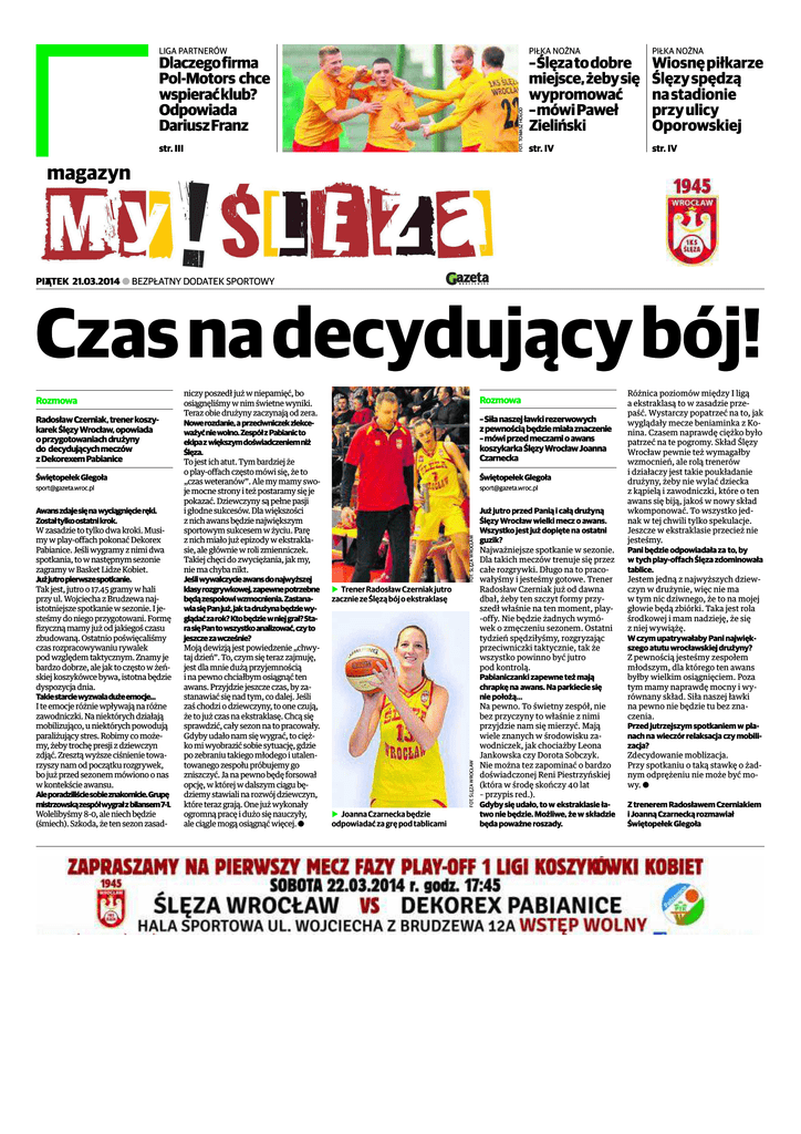 Dlaczego firma Pol-Motors chce wspierać klub? Odpowiada Dariusz Franz str. III GAZETA magazyn FOT. TOMASZ HOŁOD LIGA PARTNERÓW PIŁKA NOŻNA PIŁKA NOŻNA str. IV str. IV – Ślęza to dobre miejsce, żeby się wypromować – mówi Paweł Zieliński Wiosnę piłkarze Ślęzy spędzą na stadionie przy ulicy Oporowskiej SPORTOWA PI¥TEK 21.03.2014 A BEZPŁATNY DODATEK SPORTOWY PIĄTEK Czas na decydujący bój! Świętopełek Glegoła [email protected] Awans zdaje się na wyciągnięcie ręki. Został tylko ostatni krok. W zasadzie to tylko dwa kroki. Musimy w play-offach pokonać Dekorex Pabianice. Jeśli wygramy z nimi dwa spotkania, to w następnym sezonie zagramy w Basket Lidze Kobiet. Już jutro pierwsze spotkanie. Tak jest, jutro o 17.45 gramy w hali przy ul. Wojciecha z Brudzewa najistotniejsze spotkanie w sezonie. I jesteśmy do niego przygotowani. Formę fizyczną mamy już od jakiegoś czasu zbudowaną. Ostatnio poświęcaliśmy czas rozpracowywaniu rywalek pod względem taktycznym. Znamy je bardzo dobrze, ale jak to często w żeńskiej koszykówce bywa, istotna będzie dyspozycja dnia. Takie starcie wyzwala duże emocje... I te emocje różnie wpływają na różne zawodniczki. Na niektórych działają mobilizująco, u niektórych powodują paraliżujący stres. Robimy co możemy, żeby trochę presji z dziewczyn zdjąć. Zresztą wyższe ciśnienie towarzyszy nam od początku rozgrywek, bo już przed sezonem mówiono o nas w kontekście awansu. Ale poradziliście sobie znakomicie. Grupę mistrzowską zespół wygrał z bilansem 7-1. Wolelibyśmy 8-0, ale niech będzie (śmiech). Szkoda, że ten sezon zasad- Rozmowa – Siła naszej ławki rezerwowych z pewnością będzie miała znaczenie – mówi przed meczami o awans koszykarka Ślęzy Wrocław Joanna Czarnecka Świętopełek Glegoła [email protected] FOT. ŚLĘZA WROCŁAW Radosław Czerniak, trener koszykarek Ślęzy Wrocław, opowiada o przygotowaniach drużyny do decydujących meczów z Dekorexem Pabianice niczy poszedł już w niepamięć, bo osiągnęliśmy w nim świetne wyniki. Teraz obie drużyny zaczynają od zera. Nowe rozdanie, a przeciwniczek zlekceważyć nie wolno. Zespół z Pabianic to ekipa z większym doświadczeniem niż Ślęza. To jest ich atut. Tym bardziej że o play-offach często mówi się, że to „czas weteranów”. Ale my mamy swoje mocne strony i też postaramy się je pokazać. Dziewczyny są pełne pasji i głodne sukcesów. Dla większości z nich awans będzie największym sportowym sukcesem w życiu. Parę z nich miało już epizody w ekstraklasie, ale głównie w roli zmienniczek. Takiej chęci do zwyciężania, jak my, nie ma chyba nikt. Jeśli wywalczycie awans do najwyższej klasy rozgrywkowej, zapewne potrzebne będą zespołowi wzmocnienia. Zastanawia się Pan już, jak ta drużyna będzie wyglądać za rok? Kto będzie w niej grał? Stara się Pan to wszystko analizować, czy to jeszcze za wcześnie? Moją dewizją jest powiedzenie „chwytaj dzień”. To, czym się teraz zajmuję, jest dla mnie dużą przyjemnością i na pewno chciałbym osiągnąć ten awans. Przyjdzie jeszcze czas, by zastanawiać się nad tym, co dalej. Jeśli zaś chodzi o dziewczyny, to one czują, że to już czas na ekstraklasę. Chcą się sprawdzić, cały sezon na to pracowały. Gdyby udało nam się wygrać, to ciężko mi wyobrazić sobie sytuację, gdzie po zebraniu takiego młodego i utalentowanego zespołu próbujemy go zniszczyć. Ja na pewno będę forsował opcję, w której w dalszym ciągu będziemy stawiali na rozwój dziewczyn, które teraz grają. One już wykonały ogromną pracę i dużo się nauczyły, ale ciągle mogą osiągnąć więcej. a b Trener Radosław Czerniak jutro zacznie ze Ślęzą bój o ekstraklasę FOT. ŚLĘZA WROCŁAW Rozmowa b Joanna Czarnecka będzie odpowiadać za grę pod tablicami Już jutro przed Panią i całą drużyną Ślęzy Wrocław wielki mecz o awans. Wszystko jest już dopięte na ostatni guzik? Najważniejsze spotkanie w sezonie. Dla takich meczów trenuje się przez całe rozgrywki. Długo na to pracowałyśmy i jesteśmy gotowe. Trener Radosław Czerniak już od dawna dbał, żeby ten szczyt formy przyszedł właśnie na ten moment, play-offy. Nie będzie żadnych wymówek o zmęczeniu sezonem. Ostatni tydzień spędziłyśmy, rozgryzając przeciwniczki taktycznie, tak że wszystko powinno być jutro pod kontrolą. Pabianiczanki zapewne też mają chrapkę na awans. Na parkiecie się nie położą... Na pewno. To świetny zespół, nie bez przyczyny to właśnie z nimi przyjdzie nam się mierzyć. Mają wiele znanych w środowisku zawodniczek, jak chociażby Leona Jankowska czy Dorota Sobczyk. Nie można tez zapominać o bardzo doświadczonej Reni Piestrzyńskiej (która w środę skończy 40 lat – przypis red.). Gdyby się udało, to w ekstraklasie łatwo nie będzie. Możliwe, że w składzie będa poważne roszady. Różnica poziomów między I ligą a ekstraklasą to w zasadzie przepaść. Wystarczy popatrzeć na to, jak wyglądały mecze beniaminka z Konina. Czasem naprawdę ciężko było patrzeć na te pogromy. Skład Ślęzy Wrocław pewnie też wymagałby wzmocnień, ale rolą trenerów i działaczy jest takie poukładanie drużyny, żeby nie wylać dziecka z kąpielą i zawodniczki, które o ten awans się biją, jakoś w nowy skład wkomponować. To wszystko jednak w tej chwili tylko spekulacje. Jeszcze w ekstraklasie przecież nie jesteśmy. Pani będzie odpowiadała za to, by w tych play-offach Ślęza zdominowała tablice. Jestem jedną z najwyższych dziewczyn w drużynie, więc nie ma w tym nic dziwnego, że to na mojej głowie będą zbiórki. Taka jest rola środkowej i mam nadzieję, że się z niej wywiążę. W czym upatrywałaby Pani największego atutu wrocławskiej drużyny? Z pewnością jesteśmy zespołem młodszym, dla którego ten awans byłby wielkim osiągnięciem. Poza tym mamy naprawdę mocny i wyrównany sk