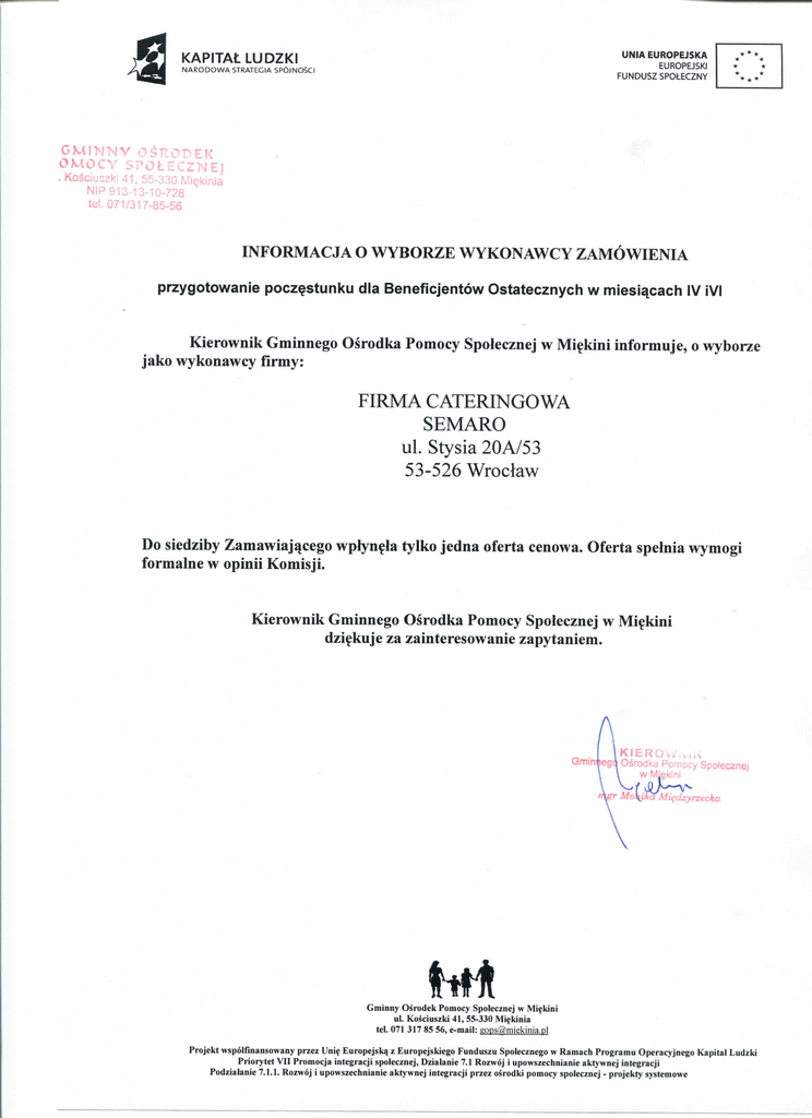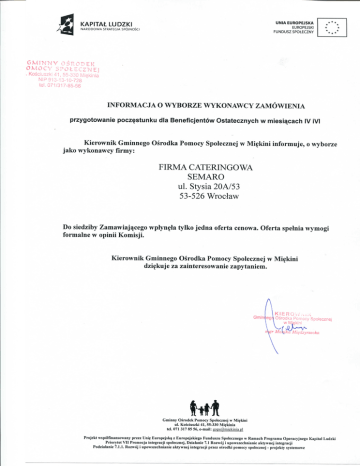 UNIA EUROPEJSKA EUROPEJSKI FUNDUSZ SPOtECZNY KAPITAt LUDZKI NARODOWA STRATECIA SPOJNOSCI G M 1 N N Y OSHODEK OMOCY SPOLECZNEJ . Kosciuszki 41, 55-330 Mi<?kinia NIP 913-13-10-728 tel. 071/317-85-56 INFORMACJA O WYBORZE WYKONAWCY ZAMOWIENIA przygotowanie pocz^stunku dla Beneficjentow Ostatecznych w miesiqcach IV iVI Kierownik Gminnego Osrodka Pomocy Spolecznej w Miejdni informuje, o wyborze jako wykonawcy firmy: FIRMA CATERINGOWA SEMARO ul. Stysia 20A/53 53-526 Wroclaw Do siedziby Zamawiajqcego wptyngla tylko jedna oferta cenowa. Oferta spelnia wymogi formalne w opinii Komisji. Kierownik Gminnego Osrodka Pomocy Spolecznej w Migkini dzifkuje za zainteresowanie zapytaniem. lK|EROW.«iK GminriegA Osrodka Pomocy Spotecznej w Miekini Gminny Osrodek Pomocy Spolecznej w Miekini ul. Kosciuszki 41, 55-330 Miekinia tel. 071 317 85 56, e-mail: [email protected] Projekt wspolflnansowany przez Unie Europejsks) z Europejskiego Funduszu Spolecznego w Ramach Programu Operacyjnego Kapital Ludzki Priorytet VII Promocja integracji Spolecznej, Dzialanie 7.1 Rozwoj i upowszechnianie akrywnej integracji Podzialanie 7.1.1. Rozwoj i upowszechnianie aktywnej integracji przez osrodki pomocy spolecznej - projekty systemowe