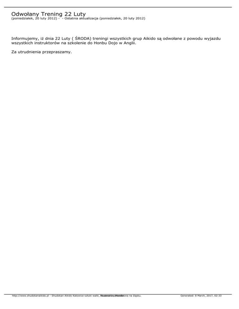 Odwołany Trening 22 Luty - Shudokan Aikido Katowice