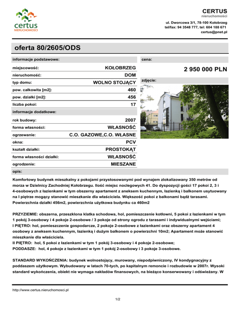 CERTUS nieruchomości ul. Dworcowa 3/1, 78-100 Kołobrzeg tel/fax: 94 3548 777, tel: 604 188 671 [email protected] oferta 80/2605/ODS informacje podstawowe: miejscowość: cena: KOŁOBRZEG typ domu: 2 950 000 PLN DOM nieruchomość: WOLNO STOJĄCY pow. całkowita [m2]: 460 pow. działki [m2]: 456 zdjęcie: 17 liczba pokoi: informacje dodatkowe: 2007 rok budowy: forma własności: ogrzewanie: WŁASNOŚĆ C.O. GAZOWE,C.O. WŁASNE PCV okna: kształt działki: forma własności działki: ogrodzenie: PROSTOKĄT WŁASNOŚĆ MIESZANE opis: Komfortowy budynek mieszkalny z pokojami przystosowanymi pod wynajem zlokalizowany 350 metrów od morza w Dzielnicy Zachodniej Kołobrzegu. Ilość miejsc noclegowych 41. Do dyspozycji gości 17 pokoi 2, 3 i 4-osobowych z łazienkami w tym obszerny apartament z aneksem kuchennym, łazienką i balkonem usytuowany na I piętrze mogący stanowić mieszkanie dla właściciela. Większość pokoi z balkonami bądź tarasami. Powierzchnia działki 456m2, powierzchnia użytkowa budynku ca 460m2 PRZYZIEMIE: obszerna, przeszklona klatka schodowa, hol, pomieszczenie kotłowni, 5 pokoi z łazienkami w tym 1 pokój 3-osobowy i 4 pokoje 2-osobowe / 3 pokoje od strony ogrodu z tarasami i indywidualnymi wejściami; I PIĘTRO: hol, pomieszczenie gospodarcze, 2 pokoje 2-osobowe z łazienkami oraz obszerny apartament 4 osobowy z aneksem kuchennym, łazienką i dużym balkonem o powierzchni 10m2; Apartament może stanowić mieszkanie dla właściciela. II PIĘTRO: hol, 5 pokoi z łazienkami w tym 1 pokój 3-osobowy i 4 pokoje 2-osobowe; PODDASZE: hol, 4 pokoje z łazienkami w tym 1 pokój 2-osobowy i 3 pokoje 3-osobowe. STANDARD WYKOŃCZENIA: budynek wolnostojący, murowany, niepodpiwniczony, IV kondygnacyjny z poddaszem użytkowym. Wybudowany w latach 70-tych, po kapitalnym remoncie i rozbudowie w 2007r. Wysoki standard wykończenia, obiekt nie wymaga nakładów finansowych, na bieżąco konserwowany i odświeżany. W http://www.certus.nieruchomosci.pl 1/2 CERTUS nieruchomości ul. Dworcowa 3/1, 78-100 Kołobrzeg tel/fax: 94 3548 777, tel: 604 188 671 [email protected] pokojach na podłodze panele, na ścianach gładź gipsowa, w łazienkach glazura i terakota, nowe okna PCV, stolarka drzwiowa wewnętrzna płytowo-płycinowa, grzejniki panelowe. Większość pokoi z balkonami. Wszystkie kondygnacje o standardowej wysokości pomieszczeń 2,5m. Wyposażenie pokoi: TV, lodówki, łóżka, sofy, stoliki, krzesła, szafy. Teren działki ogrodzony i zagospodarowany: parking dla gości z miejscem na 5 samochodów, teren zielony ogólnodostępny słoneczny ogród od strony południowej z wydzielonym miejscem na grilla. Media / instalacje: prąd, gaz, woda, kanalizacja, TV, internet, system alarmowy. Ogrzewanie centralne gazowe, pomieszczenie kotłowni zlokalizowane w przyziemiu, kocioł gazowy i grzejniki Buderus. LOKALIZACJA: w bezpośrednim sąsiedztwie parku nadmorskiego, odległość do morza ok. 350 metrów, odległość do centrum miasta i Starówki ok. 2,5km. Cicha, spokojna okolica, niska zabudowa, osiedle domów jednorodzinnych i mieszkalno-pensjonatowych. W sąsiedztwie liczne sklepy, szkoły. W pobliżu Port Rybacki i Jachtowy, w niewielkiej odległości m.in. hotel Baltic Plaza z restauracją i bazą zabiegową z basenem i spa. SPRZEDAŻ WRAZ Z UMEBLOWANIEM I WYPOSAŻENIEM UMOŻLIWIAJĄCYM FUNKCJONOWANIE OBIEKTU Termin wydania nieruchomości do uzgodnienia W celu uzyskania szczegółowych informacji o ofercie prosimy o kontakt telefoniczny, bądź mailowy. http://www.certus.nieruchomosci.pl 2/2