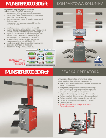 MUNSTER 9000 3D Lift KOMPAKTOWA KOLUMNA Wykonanie do pracy z podnośnikiem czterokolumnowym lub nożycowym – kompaktowa, oszczędzająca miejsce kolumna – precyzyjne prowadzenie ramienia pomiarowego w łożyskach liniowych CNC – elektryczny napęd góra–dół w celu dostosowania strefy pomiarowej – pełen zestaw komputerowy, duży 23” monitor, laserowa drukarka zasada pomiaru – przetwarzanie obrazu 3D wysoka dokładność i powtarzalność wyników dzięki nowemu wzorowi tarcz reeksyjnych SureAlignTM szybkość pomiarów – mechanik uzyskuje wyniki w ciągu 2 minut wykonując: założenie tarcz, kompensację przy przetoczeniu i skręty kół łatwa obsługa – program został utworzony przy stosowaniu reguł ONETOUCH TM bezobsługowość – brak akumulatorów ogranicza codzienne czynności do minimum środowisko pracy – WINDOWS 8 (10) CZYTELNA GRAFIKA UŁATWIAJĄCA REGULACJĘ MUNSTER 9000 3D Prof Certy kat ITS nr Z/15/089/15 SZAFKA OPERATORA Uniwersalne stanowisko pomiarowe do pracy z podnośnikiem lub na kanale przeglądowym: elektryczny napęd mechanizmu ustalającego wysokość kamer pomiarowych kompensacja błędów stanowiska pomiarowego oraz bicia obręczy kół przy przetoczeniu pojazdu programowana oś odniesienia pomiarów: oś geometryczna jazdy lub oś symetrii pojazdu funkcja regulacji zbieżności przy skręconych kołach funkcja regulacji kątów przy zwolnionych kołach bezpłatna 10-letnia aktualizacja Bazy Danych gwarancja 2 lata gwarancja wydłużona 5 lat po podpisaniu umowy serwisowej MUNSTER 9000 3D RAPORT POMIAROWY M U N S T E R 9 00 0 3 D LIFT MOTION Nierównoległość osi – podawana dla osi przedniej i osi tylnej – mierzona jest w odniesieniu do płaszczyzny podłużnej symetrii samochodu – wartość + oznacza cofnięcie koła prawego lub wysunięcie do przodu koła lewego – wartość – oznacza wysunięcie koła prawego do przodu lub cofnięcie koła lewego Wyprzedzenie osi zwrotnicy – wyznaczane dla kół kierowanych lewego i prawego – właściwe wyprzedzenie osi zwrotnicy wpływa na łatwość utrzymywania kierunku jazdy na wprost – wartość + oznacza, że dolny przegub zwrotnicy jest bardziej z przodu niż górny przegub zwrotnicy – wartość – oznacza, że dolny przegub zwrotnicy jest cofnięty względem górnego przegubu zwrotnicy Pochylenie koła – mierzone dla wszystkich kół – wartość + oznacza, że koło jest odchylone od pionu na zewnątrz – wartość – oznacza, że koło jest odchylone od pionu do wewnątrz Zbieżność połówkowa – mierzona dla wszystkich kół – wartość + oznacza, że koło jest ustawione bardziej ku środkowi – wartość – oznacza, że koło jest ustawione bardziej na zewnątrz PROF Pochylenie osi zwrotnicy – wyznaczane dla kół kierowanych – jest to kąt odchylenia bocznego osi sworznia zwrotnicy od pionu, znak jest odwrotnie ustalany niż przy pochyleniu kół Kąt zawarty (ang. SAI) – wyznaczany dla kół kierowanych – jest to suma katów pochylenia koła i pochylenia osi zwrotnicy – wartość kąta decyduje o sile potrzebnej do skręcania kołami oraz informuje o stopniu zdeformowania elementów zawieszenia Zbieżność całkowita – wyznaczana dla osi przedniej i tylnej – równa co do wartości zbieżnościom połówkowym koła lewego i prawego – wartość + oznacza, że koła są ustawione względem siebie zbieżnie – wartość – oznacza, że koła są ustawione względem siebie rozbieżnie Rozstaw osi kół – podawany dla strony lewej i prawej – podawana jest odległość pomiędzy osiami kół w mm oraz różnica pomiędzy stroną prawą i lewą Rozstaw kół – dla osi przedniej i tylnej – podawana jest odległość pomiędzy kołami osi przedniej, osi tylnej oraz różnica wymiarów tył i przód LIFT Odchylenie rzeczywistej osi jazdy od geometrycznej osi symetrii – na odchylenie wpływa błędne ustawienie zbieżności kół tylnych, przesunięcie boczne tylnej osi lub jej zwichrowanie; samochód w efekcie jedzie nieco „bokiem” – wartość + oznacza, że rzeczywisty tor jazdy jest skręcony na prawo względem geometrycznej osi jazdy – wartość – oznacza, że rzeczywisty tor jazdy jest skręcony na lewo Nieśladowość kół – dla strony lewej i prawej – przesunięcie śladu toczenia koła tylnego względem przedniego – wartość + oznacza, że ślad tylnego koła jest na zewnątrz śladu koła przedniego – wartość – oznacza, że ślad tylnego koła jest po wewnętrznej stronie względem koła przedniego Pakiety serwisowe: EUR1 – 24 miesiące standard w cenie urządzenia EUR2 – 60 miesięcy z aktualizacją bazy danych EUR3 – „spokojna głowa” z wymianą kamer i komputera po 8 latach ORGANIZUJEMY SZKOLENIA w w w . w e r t h e r. p l p o c z t a @ we r t h e r. p l