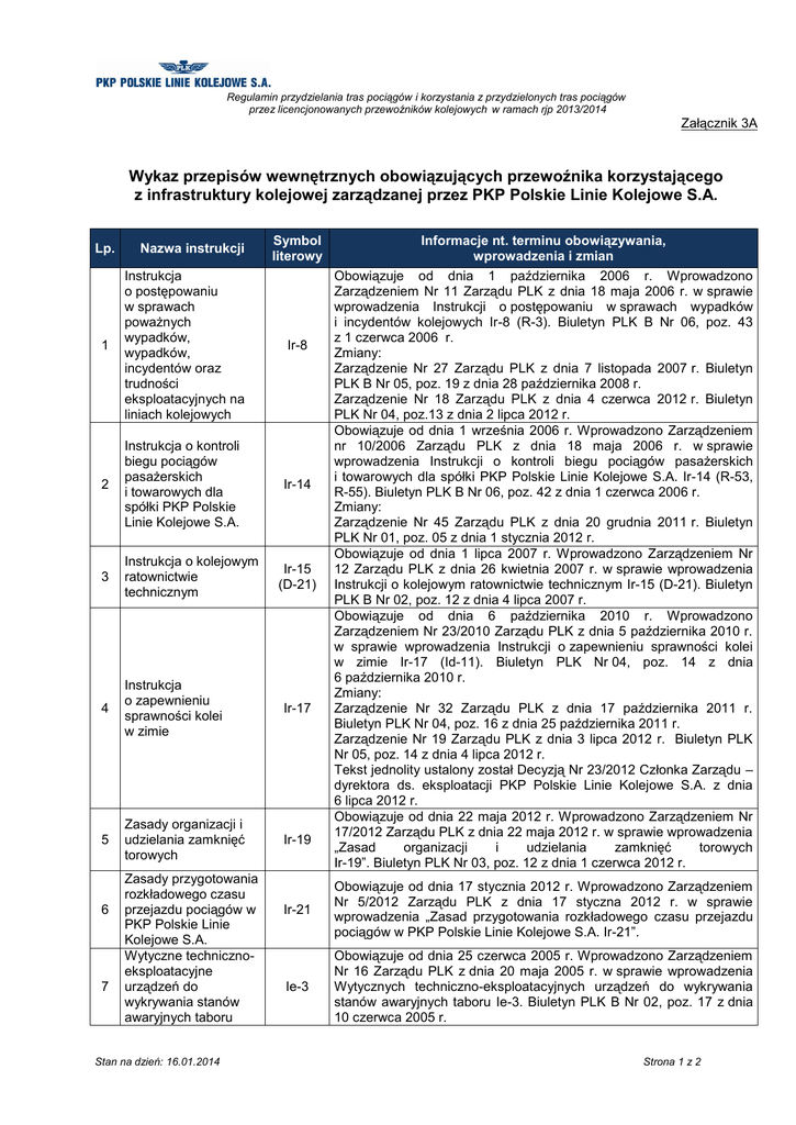 Regulamin przydzielania tras pociągów i korzystania z przydzielonych tras pociągów przez licencjonowanych przewoźników kolejowych w ramach rjp 2013/2014 Załącznik 3A Wykaz przepisów wewnętrznych obowiązujących przewoźnika korzystającego z infrastruktury kolejowej zarządzanej przez PKP Polskie Linie Kolejowe S.A. Lp. Nazwa instrukcji Symbol literowy 1 Instrukcja o postępowaniu w sprawach poważnych wypadków, wypadków, incydentów oraz trudności eksploatacyjnych na liniach kolejowych Ir-8 2 Instrukcja o kontroli biegu pociągów pasażerskich i towarowych dla spółki PKP Polskie Linie Kolejowe S.A. Ir-14 3 Instrukcja o kolejowym ratownictwie technicznym 4 Instrukcja o zapewnieniu sprawności kolei w zimie Ir-17 5 Zasady organizacji i udzielania zamknięć torowych Ir-19 6 7 Zasady przygotowania rozkładowego czasu przejazdu pociągów w PKP Polskie Linie Kolejowe S.A. Wytyczne technicznoeksploatacyjne urządzeń do wykrywania stanów awaryjnych taboru Stan na dzień: 16.01.2014 Ir-15 (D-21) Informacje nt. terminu obowiązywania, wprowadzenia i zmian Obowiązuje od dnia 1 października 2006 r. Wprowadzono Zarządzeniem Nr 11 Zarządu PLK z dnia 18 maja 2006 r. w sprawie wprowadzenia Instrukcji o postępowaniu w sprawach wypadków i incydentów kolejowych Ir-8 (R-3). Biuletyn PLK B Nr 06, poz. 43 z 1 czerwca 2006 r. Zmiany: Zarządzenie Nr 27 Zarządu PLK z dnia 7 listopada 2007 r. Biuletyn PLK B Nr 05, poz. 19 z dnia 28 października 2008 r. Zarządzenie Nr 18 Zarządu PLK z dnia 4 czerwca 2012 r. Biuletyn PLK Nr 04, poz.13 z dnia 2 lipca 2012 r. Obowiązuje od dnia 1 września 2006 r. Wprowadzono Zarządzeniem nr 10/2006 Zarządu PLK z dnia 18 maja 2006 r. w sprawie wprowadzenia Instrukcji o kontroli biegu pociągów pasażerskich i towarowych dla spółki PKP Polskie Linie Kolejowe S.A. Ir-14 (R-53, R-55). Biuletyn PLK B Nr 06, poz. 42 z dnia 1 czerwca 2006 r. Zmiany: Zarządzenie Nr 45 Zarządu PLK z dnia 20 grudnia 2011 r. Biuletyn PLK Nr 01, poz. 05 z dnia 1 stycznia 2012 r. Obowiązuje od dnia 1 lipca 2007 r. Wprowadzono Zarządzeniem Nr 12 Zarządu PLK z dnia 26 kwietnia 2007 r. w sprawie wprowadzenia Instrukcji o kolejowym ratownictwie technicznym Ir-15 (D-21). Biuletyn PLK B Nr 02, poz. 12 z dnia 4 lipca 2007 r. Obowiązuje od dnia 6 października 2010 r. Wprowadzono Zarządzeniem Nr 23/2010 Zarządu PLK z dnia 5 października 2010 r. w sprawie wprowadzenia Instrukcji o zapewnieniu sprawności kolei w zimie Ir-17 (Id-11). Biuletyn PLK Nr 04, poz. 14 z dnia 6 października 2010 r. Zmiany: Zarządzenie Nr 32 Zarządu PLK z dnia 17 października 2011 r. Biuletyn PLK Nr 04, poz. 16 z dnia 25 października 2011 r. Zarządzenie Nr 19 Zarządu PLK z dnia 3 lipca 2012 r. Biuletyn PLK Nr 05, poz. 14 z dnia 4 lipca 2012 r. Tekst jednolity ustalony został Decyzją Nr 23/2012 Członka Zarządu – dyrektora ds. eksploatacji PKP Polskie Linie Kolejowe S.A. z dnia 6 lipca 2012 r. Obowiązuje od dnia 22 maja 2012 r. Wprowadzono Zarządzeniem Nr 17/2012 Zarządu PLK z dnia 22 maja 2012 r. w sprawie wprowadzenia „Zasad organizacji i udzielania zamknięć torowych Ir-19”. Biuletyn PLK Nr 03, poz. 12 z dnia 1 czerwca 2012 r. Ir-21 Obowiązuje od dnia 17 stycznia 2012 r. Wprowadzono Zarządzeniem Nr 5/2012 Zarządu PLK z dnia 17 styczna 2012 r. w sprawie wprowadzenia „Zasad przygotowania rozkładowego czasu przejazdu pociągów w PKP Polskie Linie Kolejowe S.A. Ir-21”. Ie-3 Obowiązuje od dnia 25 czerwca 2005 r. Wprowadzono Zarządzeniem Nr 16 Zarządu PLK z dnia 20 maja 2005 r. w sprawie wprowadzenia Wytycznych techniczno-eksploatacyjnych urządzeń do wykrywania stanów awaryjnych taboru Ie-3. Biuletyn PLK B Nr 02, poz. 17 z dnia 10 czerwca 2005 r. Strona 1 z 2 Regulamin przydzielania tras pociągów i korzystania z przydzielonych tras pociągów przez licencjonowanych przewoźników kolejowych w ramach rjp 2013/2014 Załącznik 3A Lp. Nazwa instrukcji 8 Instrukcja o organizacji i użytkowaniu sieci radiotelefonicznych 9 Instrukcja bezpieczeństwa i higieny pracy przy urządzeniach elektroenergetyki kolejowej. Postanowienia wspólne EBH-1 Zasady wstępu na obszar kolejowy 10 zarządzany przez PKP Polskie Linie Kolejowe S.A. Zasady organizacji systemu zarządzania kryzysowego w czasie wystąpienia zagrożeń oraz sytuacji kryzysowych na liniach kolejowych 11 zarządzanych przez PKP Polskie Linie Kolejowe S.A. oraz w budynkach i budowlach przeznaczonych do obsługi osób i rzeczy. Zasady monitorowania bieżącej pracy eksploatacyjnoprzewozowej i postępowania w czasie zaistnienia zagrożeń, sytuacji kryzysowych, innych 12 wydarzeń na sieci zarządzanej przez PKP Polskie Linie Kolejowe S.A. oraz w budynkach i budowlach przeznaczonych do obsługi osób i rzeczy. Stan na dzień: 16.01.2014 Symbol literowy Informacje nt. terminu obowiązywania, wprowadzenia i zmian Ie-14 (E-36) Obowiązuje od dnia 28 czerwca 2005 r. Wprowadzono Zarządzeniem Nr 22 Zarządu PLK z dnia 27 grudnia 2004 r. w sprawie wprowadzenia Instrukcji o organizacji i użytkowaniu sieci radiotelefonicznych Ie-14 (E-36). Biuletyn PKP S.A. B Nr 5, poz.16 z dnia 13 czerwca 2005 r. Obowiązuje od dnia 1 stycznia 2005 r. Wprowadzono Uchwałą Nr 366 EBH-1a Zarządu PLK z dnia 27 grudnia 2004 r. w sprawie przyjęcia do (PKP Et-4) stosowania Instrukcji serii EBH, dotyczących bezpieczeństwa i higieny pracy przy urządzeniach elektroenergetyki kolejowej. Id-21 Obowiązuje od dnia 10 grudnia 2010 r. Wprowadzono Zarządzeniem Nr 27 Zarządu PLK z dnia 6 grudnia 2010 r. w sprawie wprowadzenia Zasad wstępu na obszar kolejowy zarządzany przez PKP Polskie Linie Kolejowe S.A. Biuletyn PLK Nr 5, poz. 17 z dnia 10 grudnia 2010 r. Zmiany: Zarządzenie Nr 15/2011 Zarządu PLK z dnia 26 kwietnia 2011 r. Biuletyn PLK Nr 02, poz. 08 z dnia 5 maja 2011 r. Zarządzenie Nr 26/2012 Zarządu PLK z dnia 19 listopada 2012 r. Biuletyn PLK Nr 07, poz. 17 z dnia 22 listopada 2012 r. Zarządzenie Nr 27/2013 Zarządu PLK z dnia 26 listopa