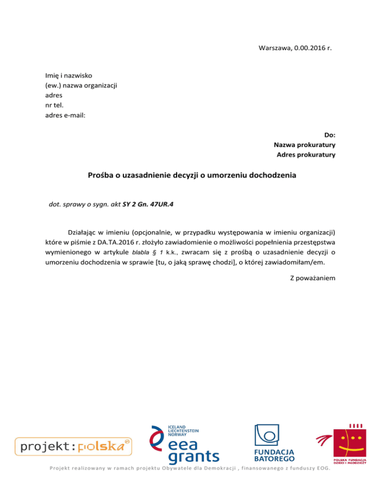 Warszawa, 0.00.2016 r. Imię i nazwisko (ew.) nazwa organizacji adres nr tel. adres e-mail: Do: Nazwa prokuratury Adres prokuratury Prośba o uzasadnienie decyzji o umorzeniu dochodzenia dot. sprawy o sygn. akt SY 2 Gn. 47UR.4 Działając w imieniu (opcjonalnie, w przypadku występowania w imieniu organizacji) które w piśmie z DA.TA.2016 r. złożyło zawiadomienie o możliwości popełnienia przestępstwa wymienionego w artykule blabla § 1 k.k., zwracam się z prośbą o uzasadnienie decyzji o umorzeniu dochodzenia w sprawie [tu, o jaką sprawę chodzi], o której zawiadomiłam/em. Z poważaniem Projekt realizowany w ramach projektu Obywatele dla Demokra cji , finansowanego z funduszy EOG.