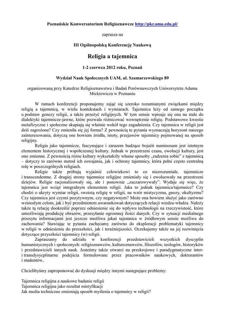 Poznańskie Konwersatorium Religioznawcze http://pkr.amu.edu.pl/ zaprasza na III Ogólnopolską Konferencję Naukową Religia a tajemnica 1-2 czerwca 2012 roku, Poznań Wydział Nauk Społecznych UAM, ul. Szamarzewskiego 89 organizowaną przy Katedrze Religioznawstwa i Badań Porównawczych Uniwersytetu Adama Mickiewicza w Poznaniu W ramach konferencji proponujemy zająć się szeroko rozumianymi związkami między religią a tajemnicą, w wielu kontekstach i wymiarach. Tajemnica leży od samego początku u podstaw genezy religii, a także przeżyć religijnych. W tym sensie wpisuje się ona na stałe do dialektyki tajemnicze-jawne, które pozwala różnicować wewnętrznie religię. Podstawowe kwestie metafizyczne i społeczne skupiają się właśnie wokół tego zagadnienia. Czy tajemnica w religii jest dziś zagrożona? Czy zmieniła się jej forma? Z pewnością te pytania wyznaczają horyzont naszego zainteresowania, dotyczą one bowiem źródła, istoty, przejawów tajemnicy pojmowanej na sposób religijny. Religia jako tajemnicze, fascynujące i zarazem budzące bojaźń numinosum jest istotnym elementem historycznej i współczesnej kultury. Jednak w przestrzeni czasu, ewolucji kultury, jest ono zmienne. Z pewnością różne kultury wykształciły własne sposoby „radzenia sobie” z tajemnicą – dotyczy to zarówno metod ich oswajania, jak i ochrony tajemnicy, która pełni często centralną rolę w poszczególnych religiach. Religie także próbują wyjaśnić człowiekowi to co niezrozumiałe, tajemnicze i transcendentne. Z drugiej strony tajemnice religijne zmieniały się i ewoluowały na przestrzeni dziejów. Religie racjonalizowały się, ale i ponownie „zaczarowywały”. Wydaje się więc, że tajemnica jest wciąż integralnym elementem religii. Jaka to jednak tajemnica/tajemnice? Czy chodzi o ukryty wymiar religii, swoistą religię w religii, na wzór mistycyzmu, gnozy, okultyzmu? Czy tajemnica jest czymś pozytywnym, czy negatywnym? Może ona bowiem służyć jako zarówno wzniosłym celom, jak i być przedmiotem uwarunkowań dotyczących relacji wiedza-władza. Należy także tą relację dookreślić poprzez odniesienie się do wpływu technologii na rzeczywistość, które umożliwiają produkcję obrazów, przesyłanie ogromnej ilości danych. Czy w sytuacji medialnego przesytu informacjami jest jeszcze możliwa jakaś tajemnica w źródłowym sensie możliwa do zachowania? Stawiając te pytania zachęcamy zarówno do eksploracji problematyki tajemnicy w religii w odniesieniu do przeszłości, jak i teraźniejszości. Oczekujemy także na jej rozwinięcia dotyczące przyszłości tajemnicy (w) religii. Zapraszamy do udziału w konferencji przedstawicieli wszystkich dyscyplin humanistycznych i społecznych: religioznawców, kulturoznawców, filozofów, teologów, historyków i przedstawicieli innych nauk. Jesteśmy także otwarci na przekrojowe i paradygmatyczne interi transdysycplinarne podejścia formułowane przez pracowników naukowych, doktorantów i studentów.. Chcielibyśmy zaproponować do dyskusji między innymi następujące problemy: Tajemnica religijna a naukowe badanie religii Tajemnica religijna jako rezultat mistyfikacji Jak media techniczne zmieniają sposób myślenia o tajemnicy w religii? Symbol i metafora jako środki służące obcowaniu z tajemnicą religijną Czy tajemniczość jest atrybutem rzeczy świętych? Rola stowarzyszeń tajemnych w życiu religijnym/tajemniczość misteriów Sposoby językowego wyrażania tajemnicy Tajemnice zapomnianych wspólnot religijnych Bóg jako tajemnica Tajemnica śmierci Czy każdy może zrozumieć tajemnice religii? Czy zracjonalizowane religie tracą tajemnice? Tajemne słowa/znaki/symbole w religii/mistyce/duchowości Powyższa lista nie wyczerpuje zagadnień, które pragniemy poruszyć. Zachęcamy do przesyłania własnych propozycji. Opłata organizacyjna: 150 zł. Wpłaty po zaakceptowaniu abstraktów proszę kierować na konto: Centrum Badań Interdyscyplinarnych PKO BP I Oddział w Poznaniu 23 1020 4027 0000 1102 0417 0288 ul. Biegańskiego 30 A 60-682 Poznań Ważne terminy: 6 maj – termin przesłania proponowanych abstraktów wystąpień (do 500 znaków) 8 maj – ogłoszenie programu konferencji 20 maj – ostateczny termin uiszczenia opłaty konferencyjnej (150 zł). 1-2 czerwca – konferencja 30 czerwca – termin przesłania artykułów do publikacji (do 20 000 znaków) Warunkiem publikacji jest otrzymanie pozytywnej recenzji artykułu. Kontakt: [email protected] Osobom spoza Poznania organizatorzy zapewniają pomoc w znalezieniu noclegu. Komitet organizacyjny: mgr Rafał Ilnicki (sekretarz naukowy) mgr Juliusz Iwanicki (sekretarz organizacyjny) mgr Damian Kokoć mgr Adam Pietrzykowski mgr Beata Włodarska